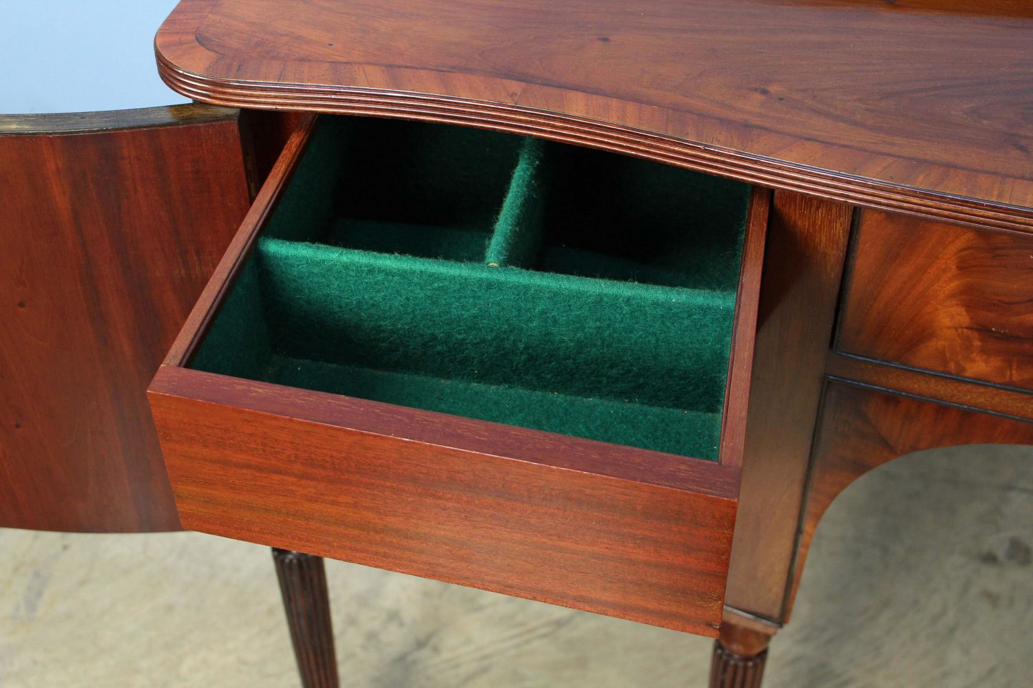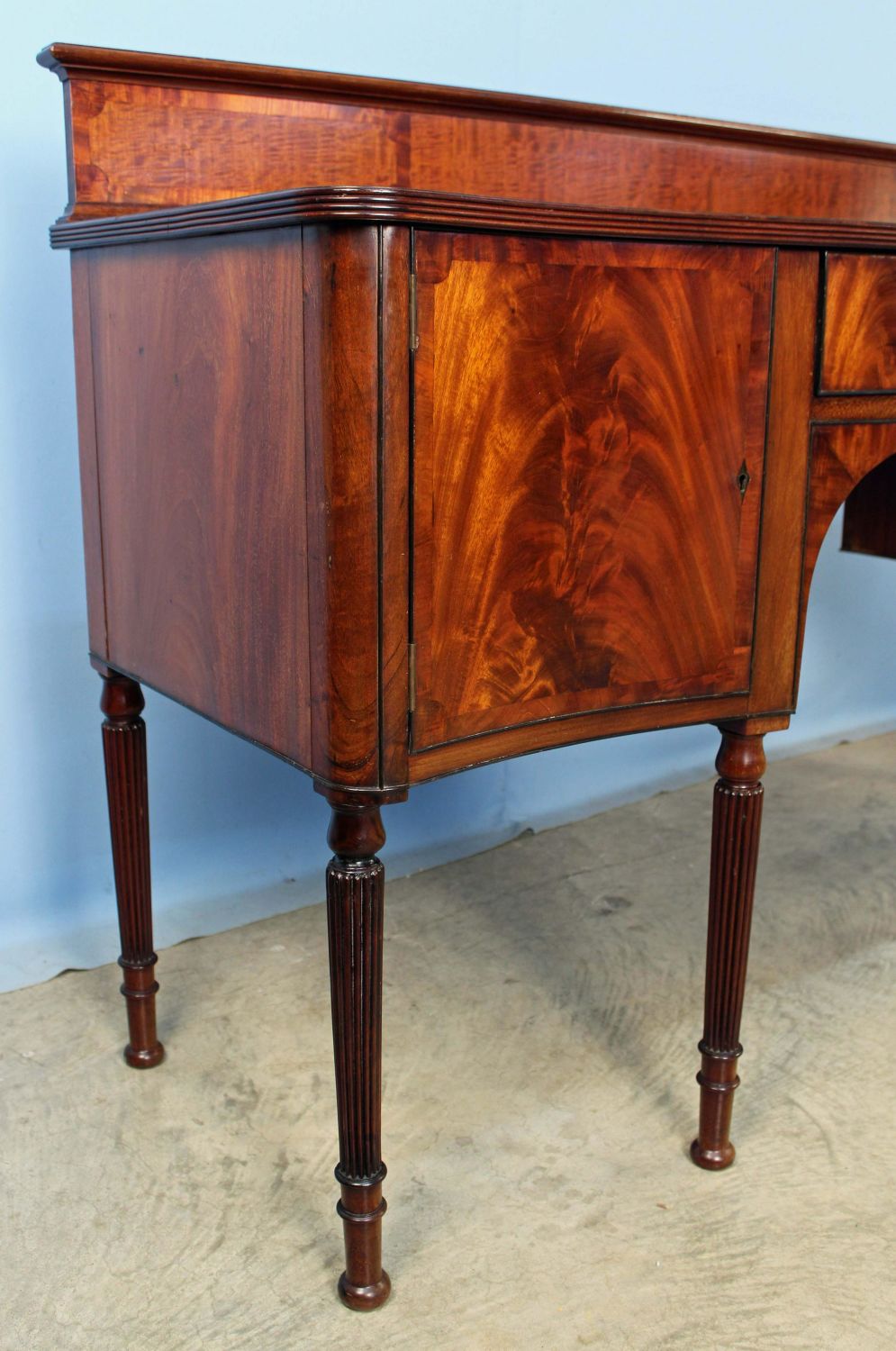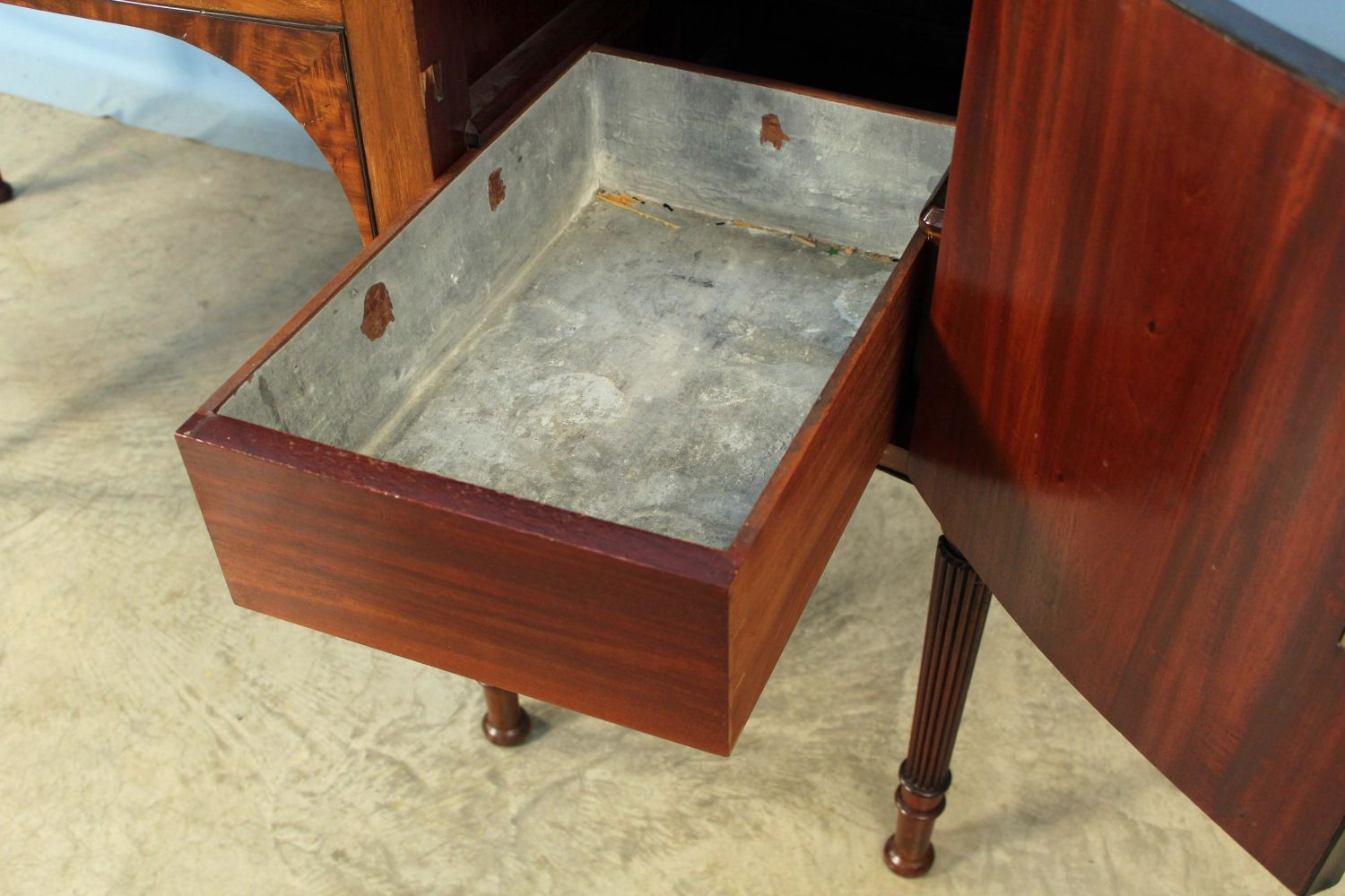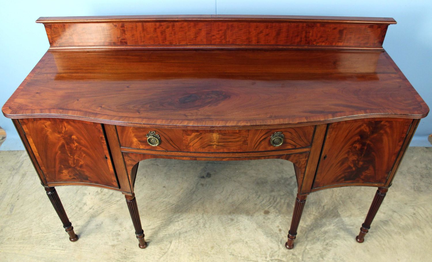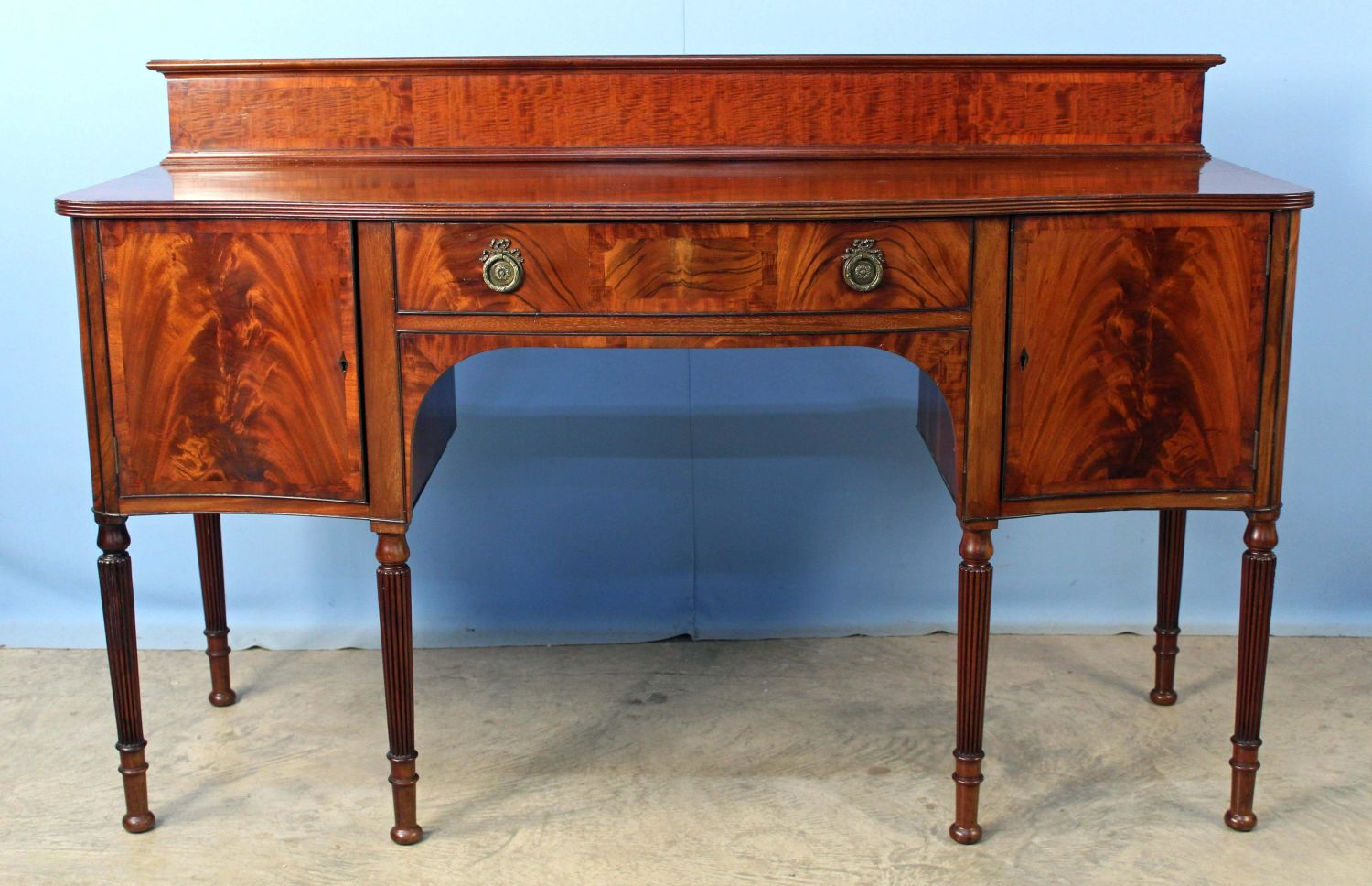 Late 19th Century Sheraton Style Banded Mahogany Sideboard. Sideboard has a slide out metal lined wine drawer with locking door. The other side has felt lined flatware drawer with locking door. This piece rests on six reeded legs. Measures 42 1/4" high x 65 1/4" wide x 21 1/2" deep. Condition- Sideboard is in very nice condition with some evident old repairs. Original brass gallery on back splash has been removed in some past time. See photos.