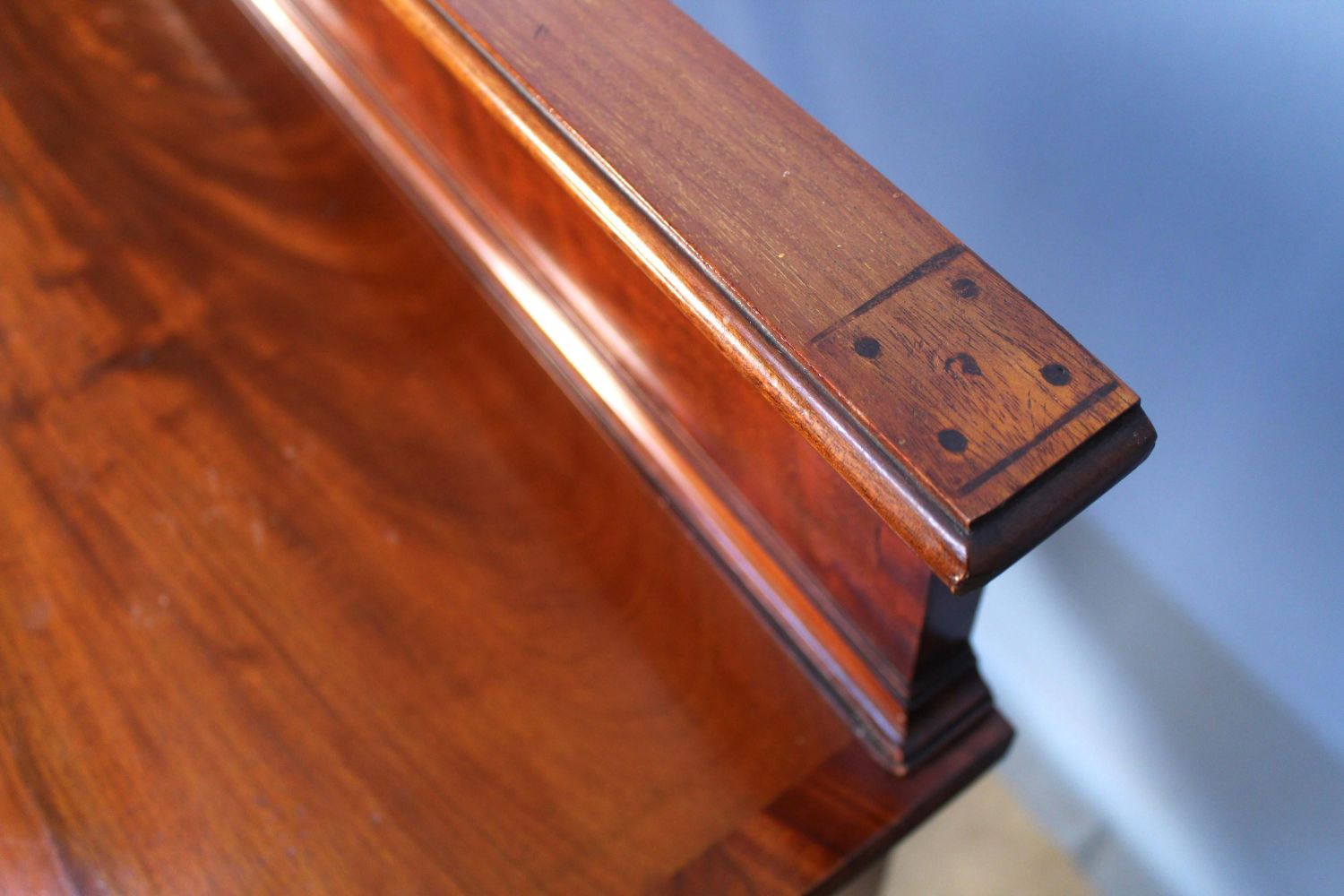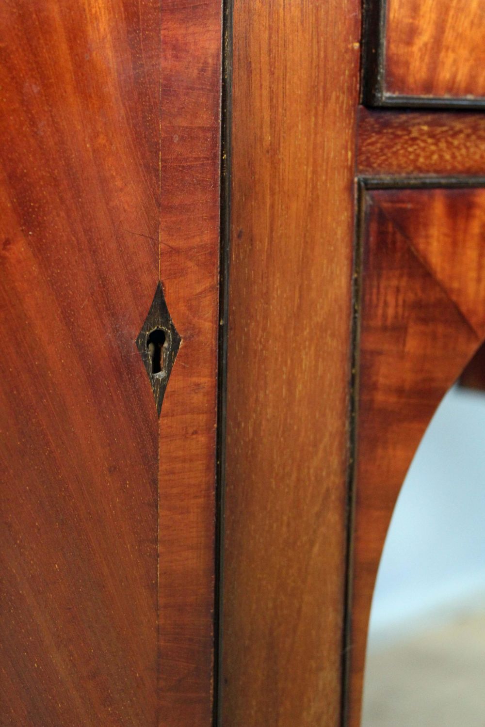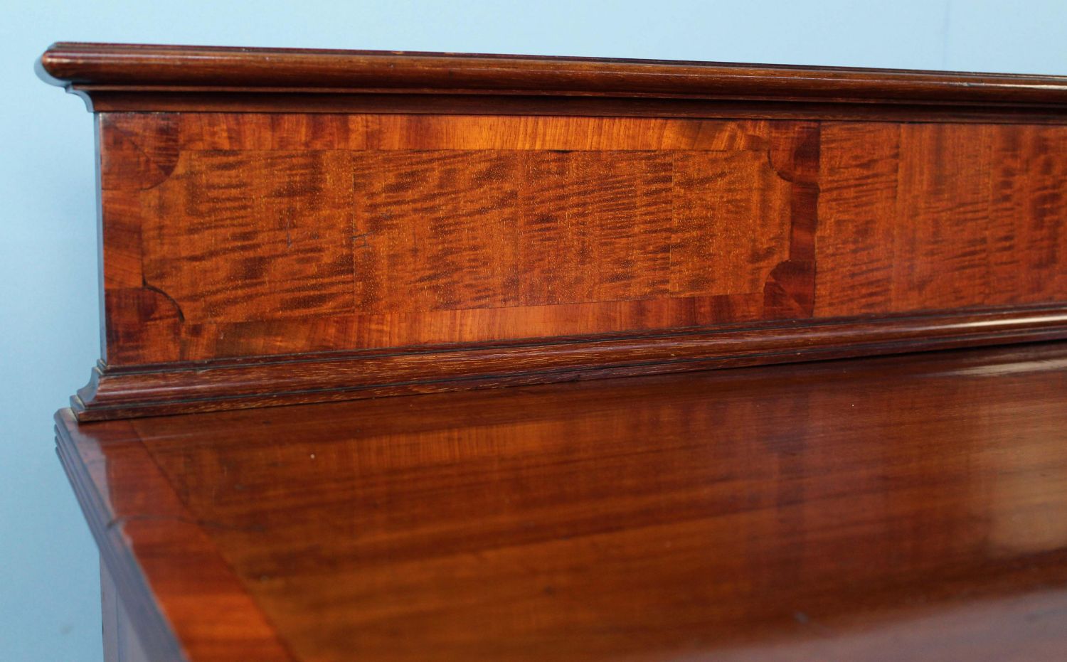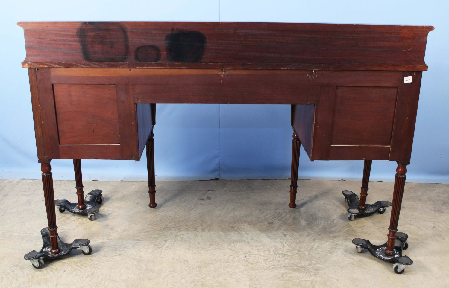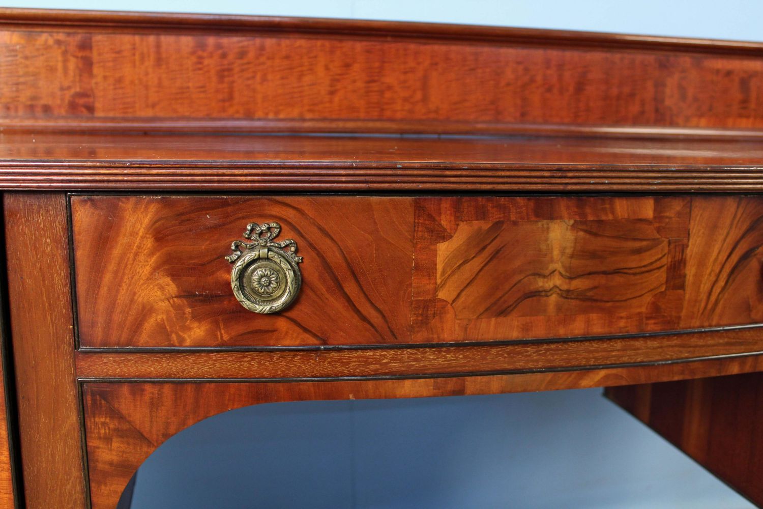 Late 19th Century Sheraton Style Banded Mahogany Sideboard. Sideboard has a slide out metal lined wine drawer with locking door. The other side has felt lined flatware drawer with locking door. This piece rests on six reeded legs. Measures 42 1/4" high x 65 1/4" wide x 21 1/2" deep. Condition- Sideboard is in very nice condition with some evident old repairs. Original brass gallery on back splash has been removed in some past time. See photos.