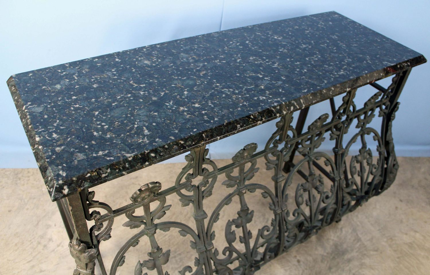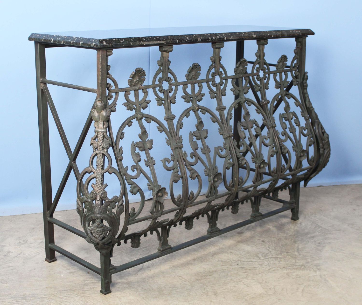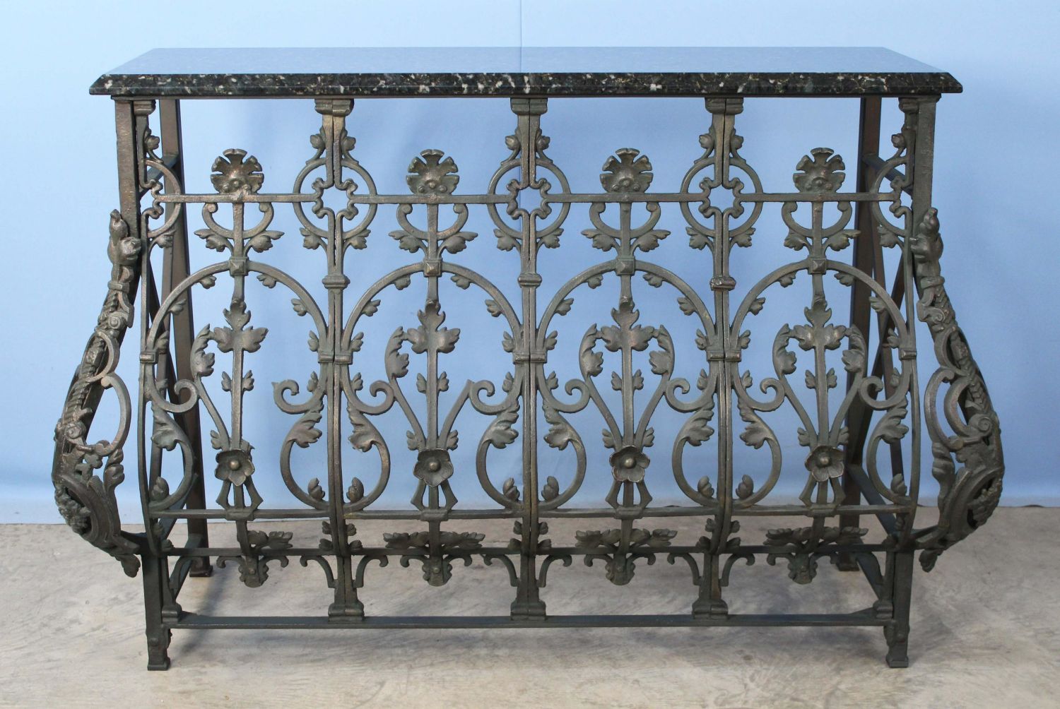 French Style Wrought and Cast Iron Marble Top Console Table. Marble is a dark green with multicolored specks. Measures 38 5/8" high x 59" wide x 23" deep. Condition- The Console table has three broken /missing pieces of decoration on the front. The marble and the balance of the piece are in good condition. See photos.