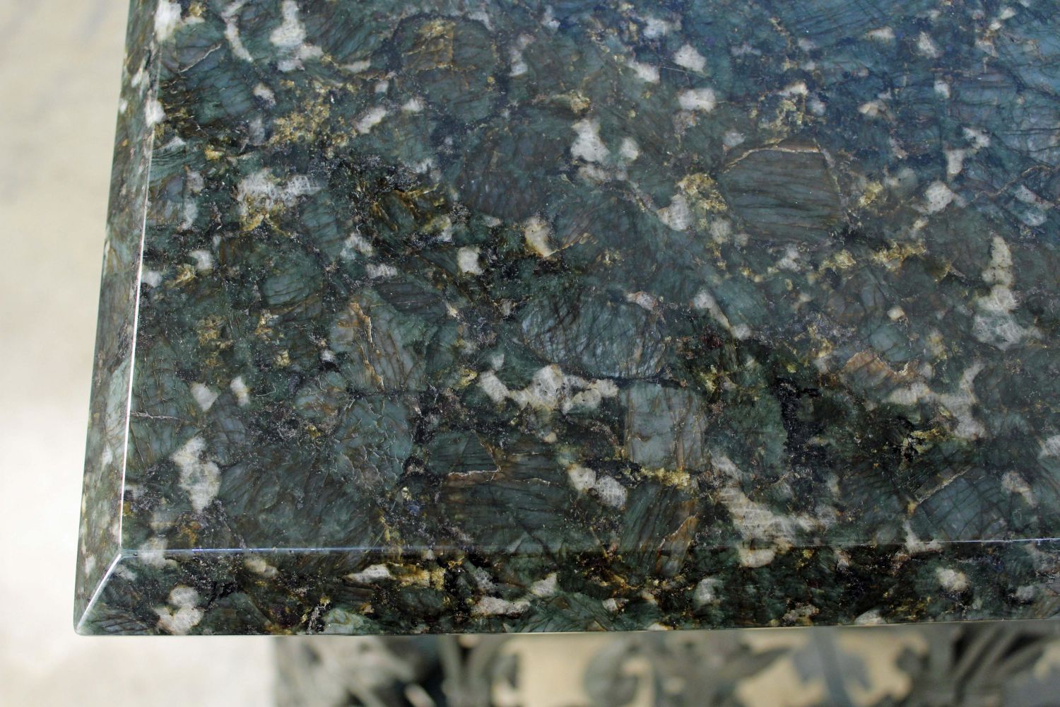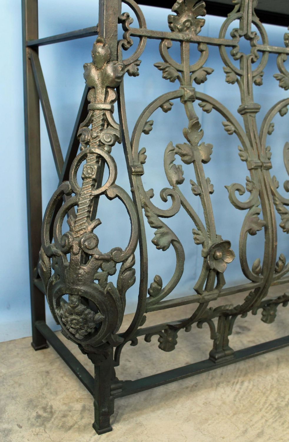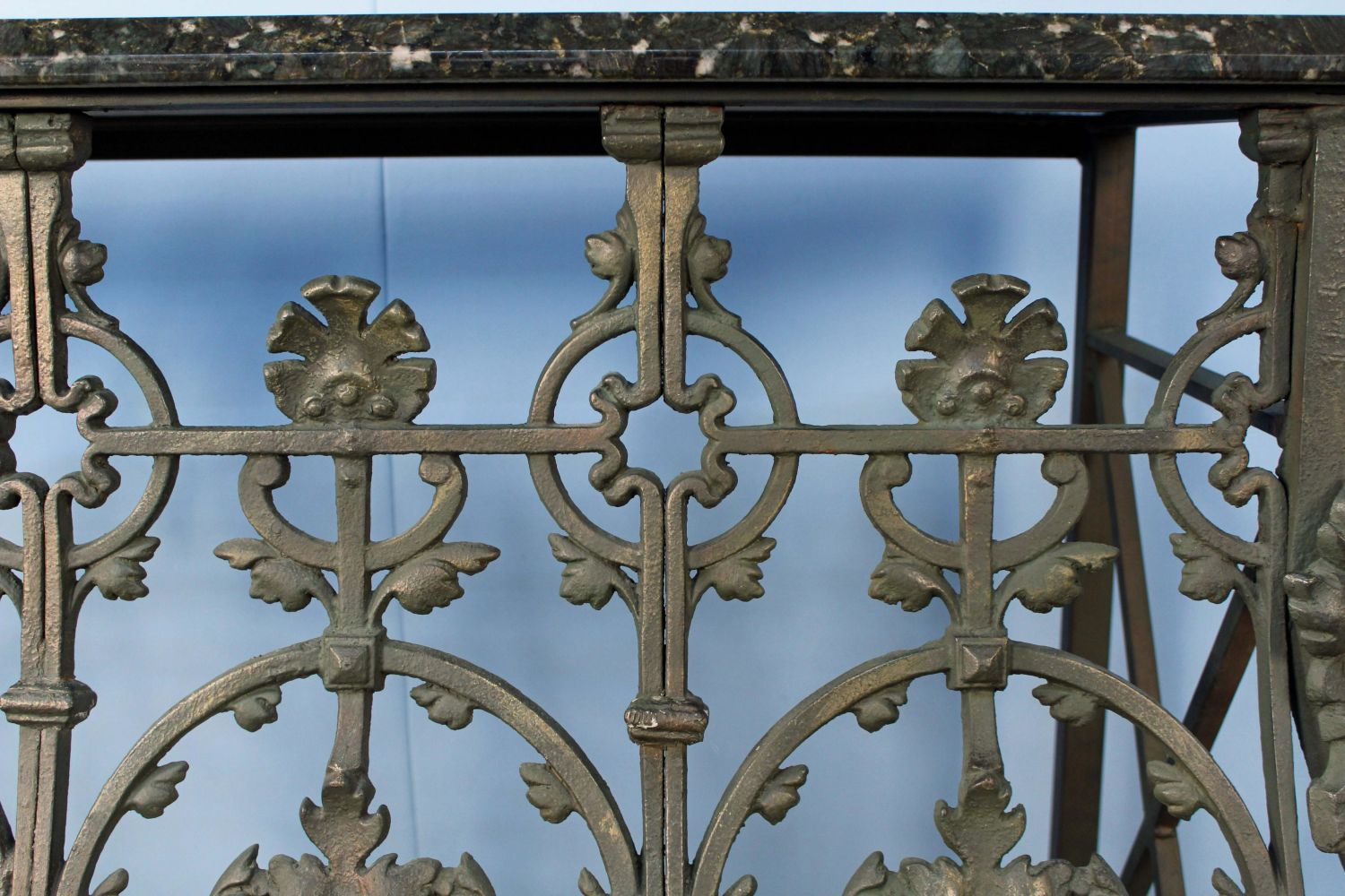 French Style Wrought and Cast Iron Marble Top Console Table. Marble is a dark green with multicolored specks. Measures 38 5/8" high x 59" wide x 23" deep. Condition- The Console table has three broken /missing pieces of decoration on the front. The marble and the balance of the piece are in good condition. See photos.