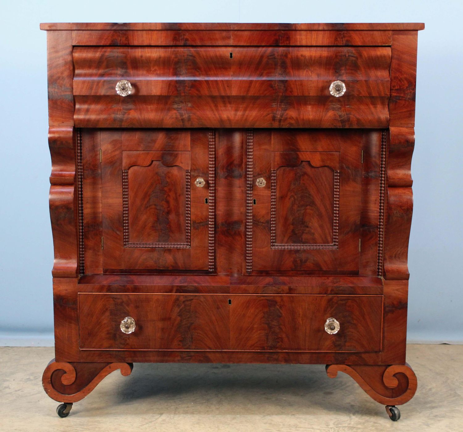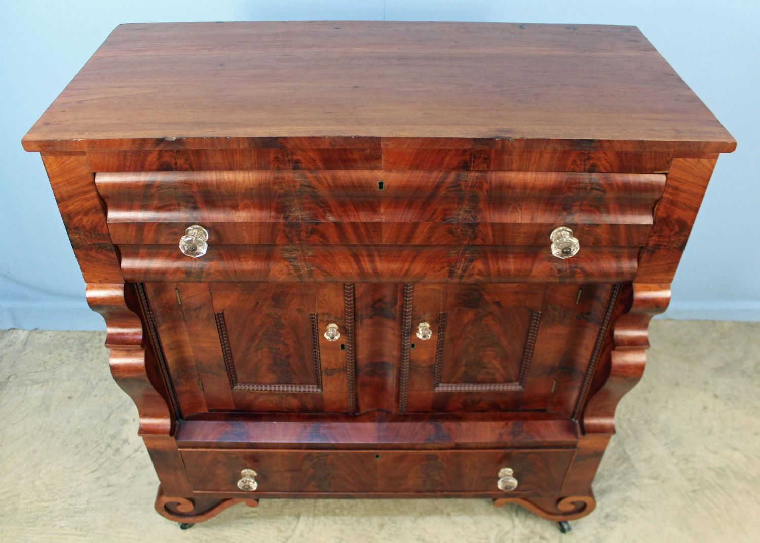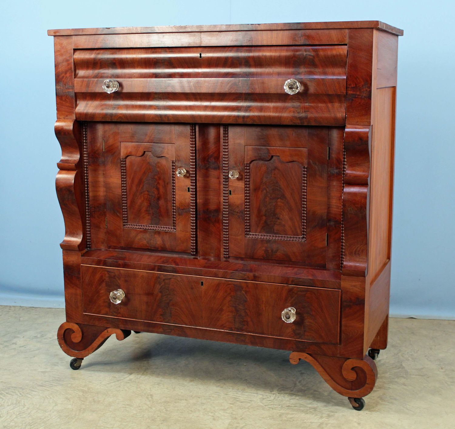 American Empire Mahogany Press Circa 1830. This cabinet has chest and press features. The piece has large upper drawer above two blind recessed doors above bottom drawer. Has four pressed glass drawer pulls. Measures 47" high x 45 1/8" wide x 21 1/4" deep. Condition- Overall very good condition. Some large pulls have chips. The two smaller pulls on doors are not original. See photos.