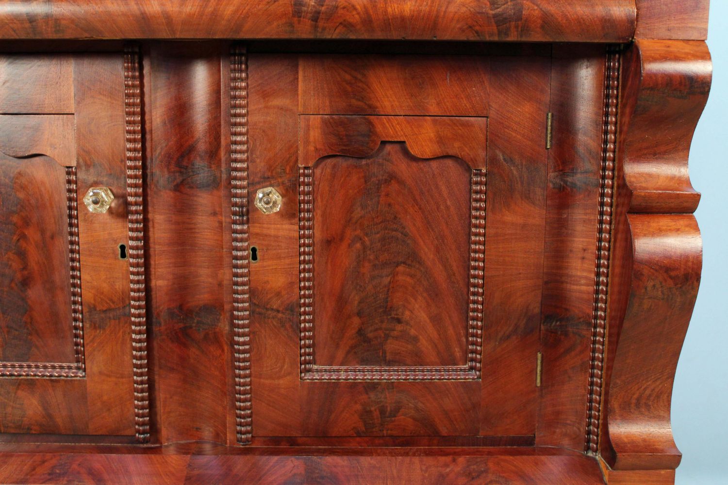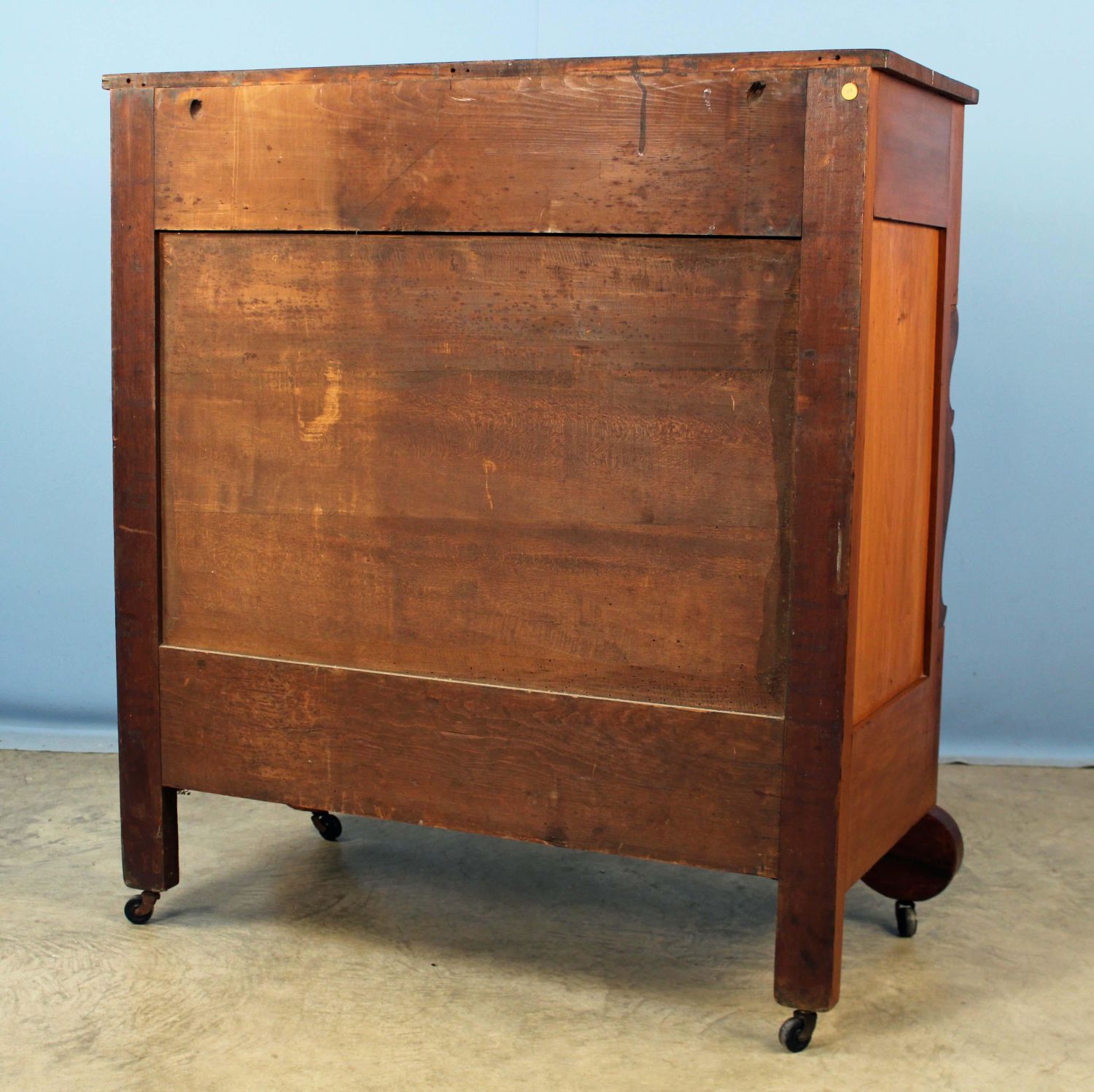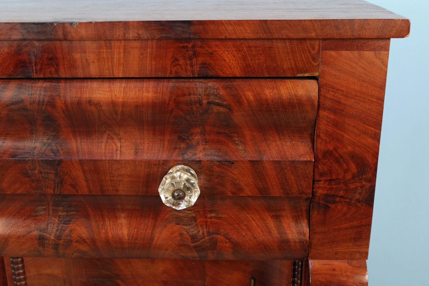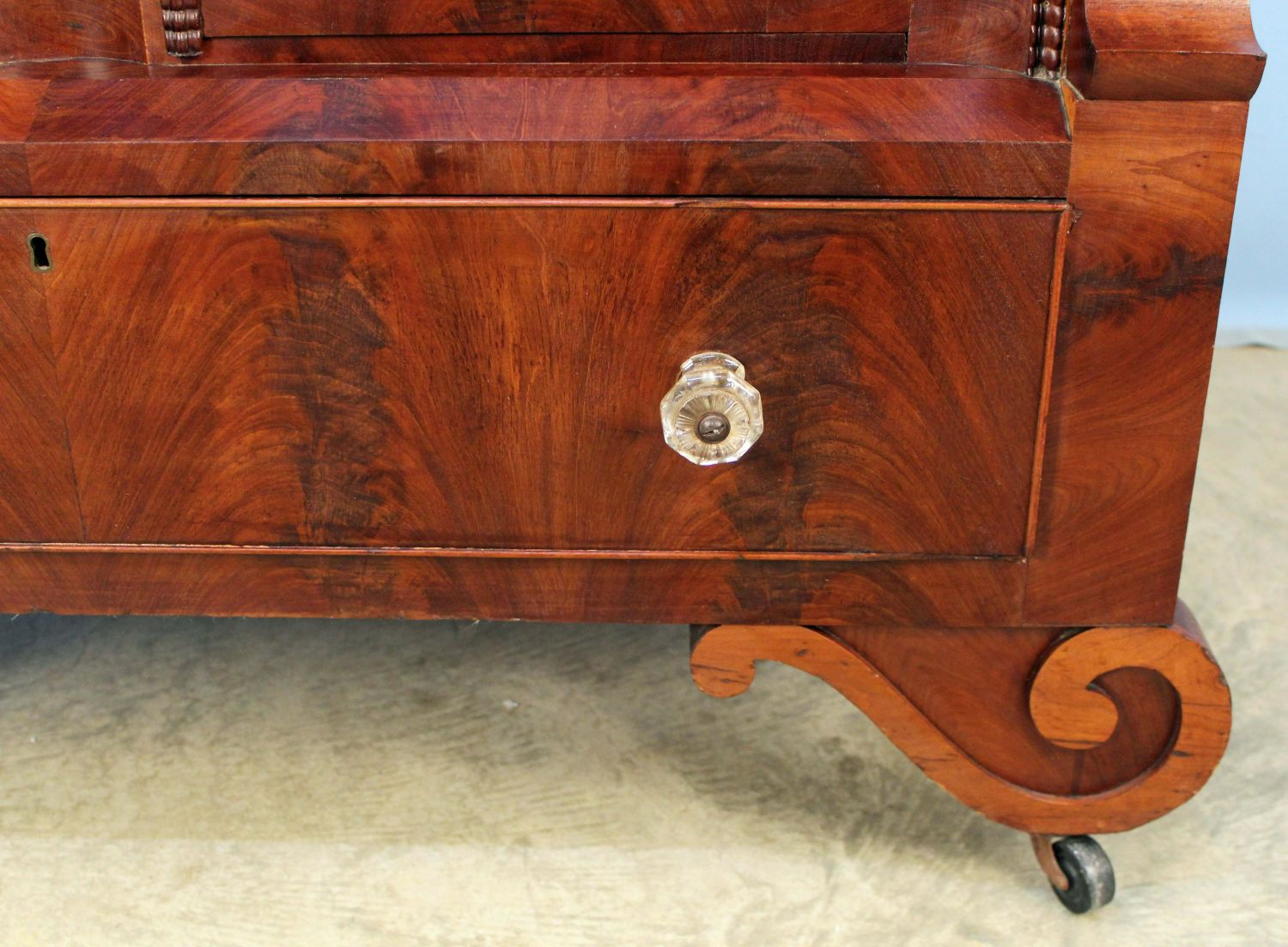 American Empire Mahogany Press Circa 1830. This cabinet has chest and press features. The piece has large upper drawer above two blind recessed doors above bottom drawer. Has four pressed glass drawer pulls. Measures 47" high x 45 1/8" wide x 21 1/4" deep. Condition- Overall very good condition. Some large pulls have chips. The two smaller pulls on doors are not original. See photos.
