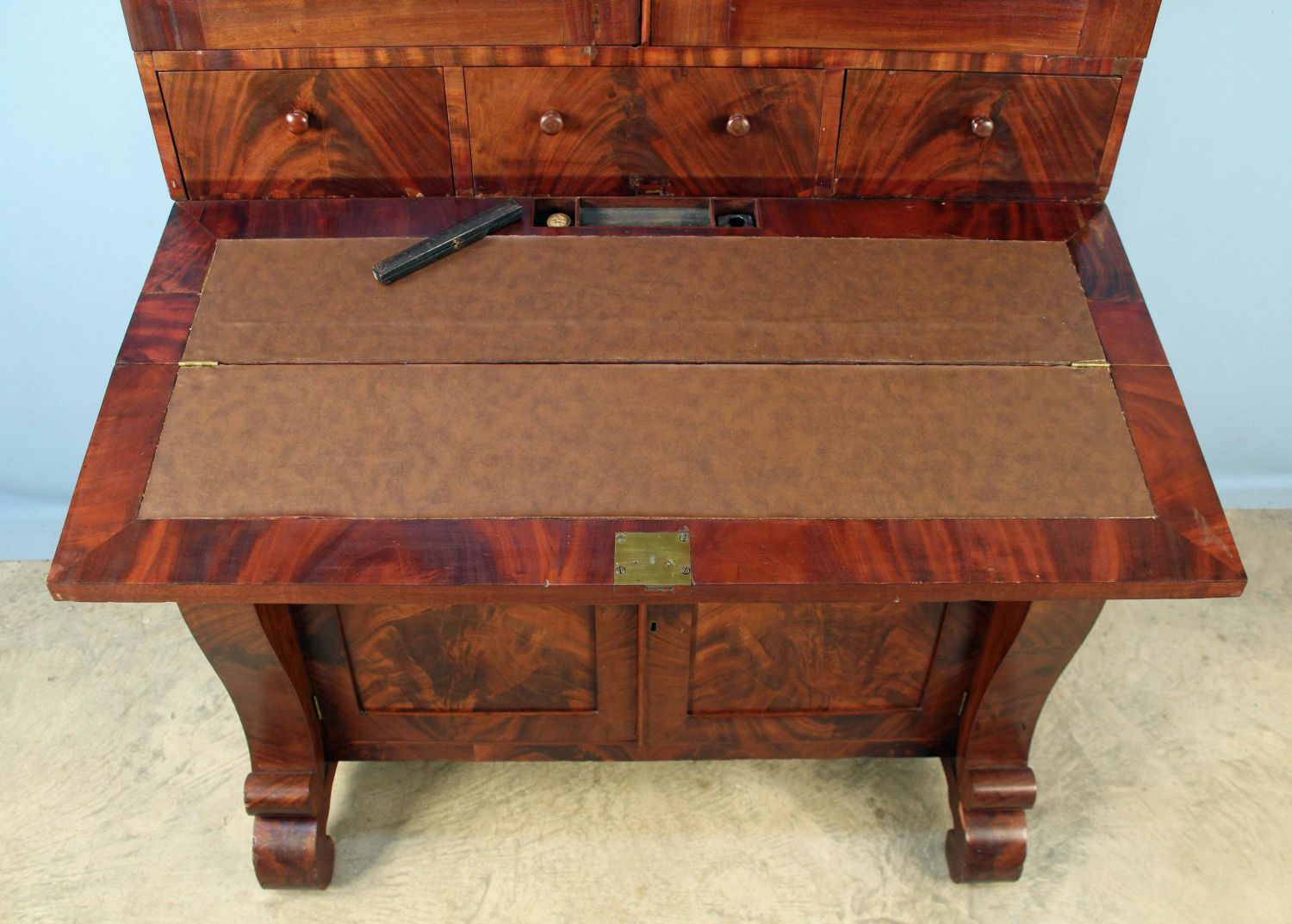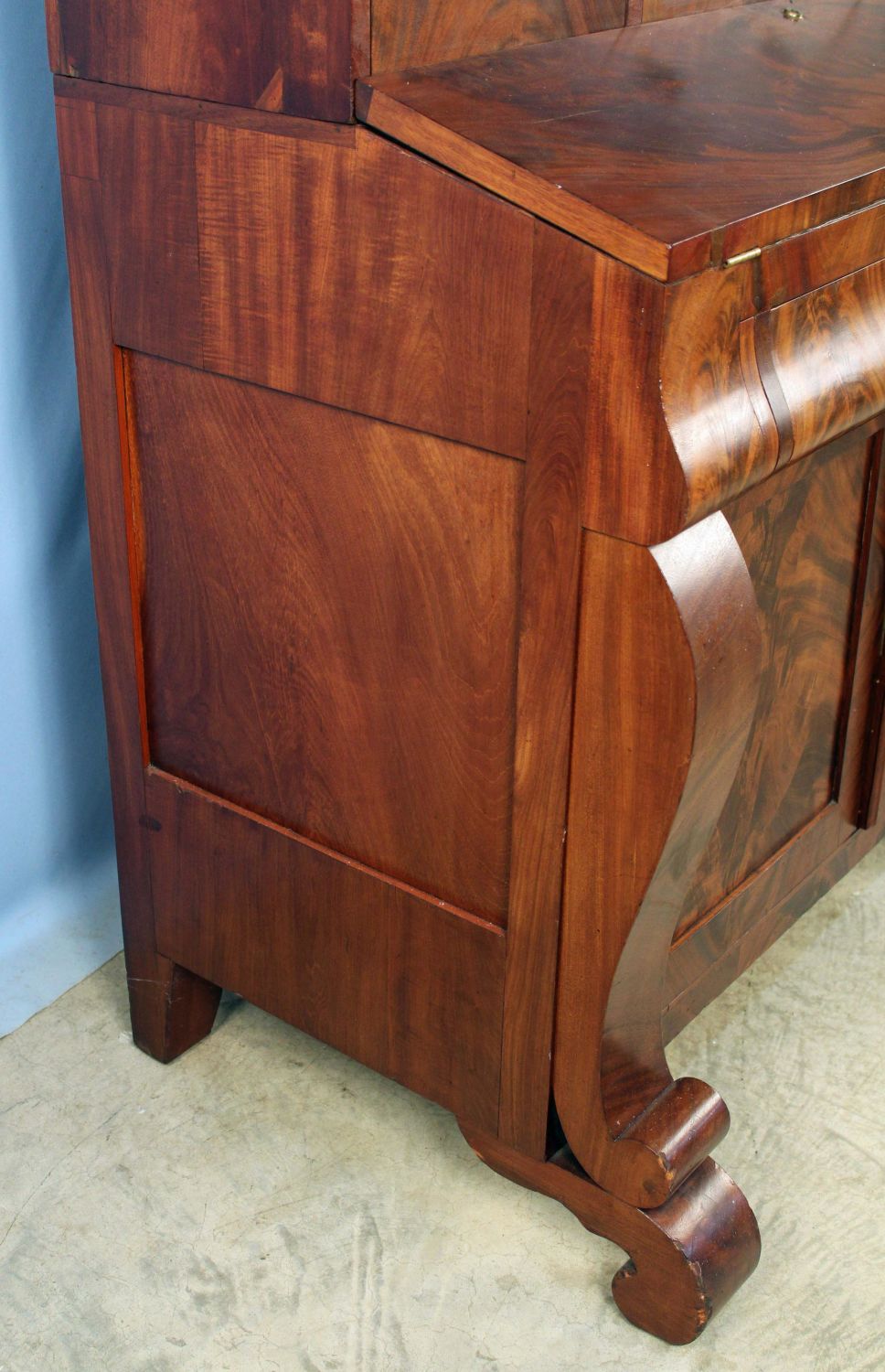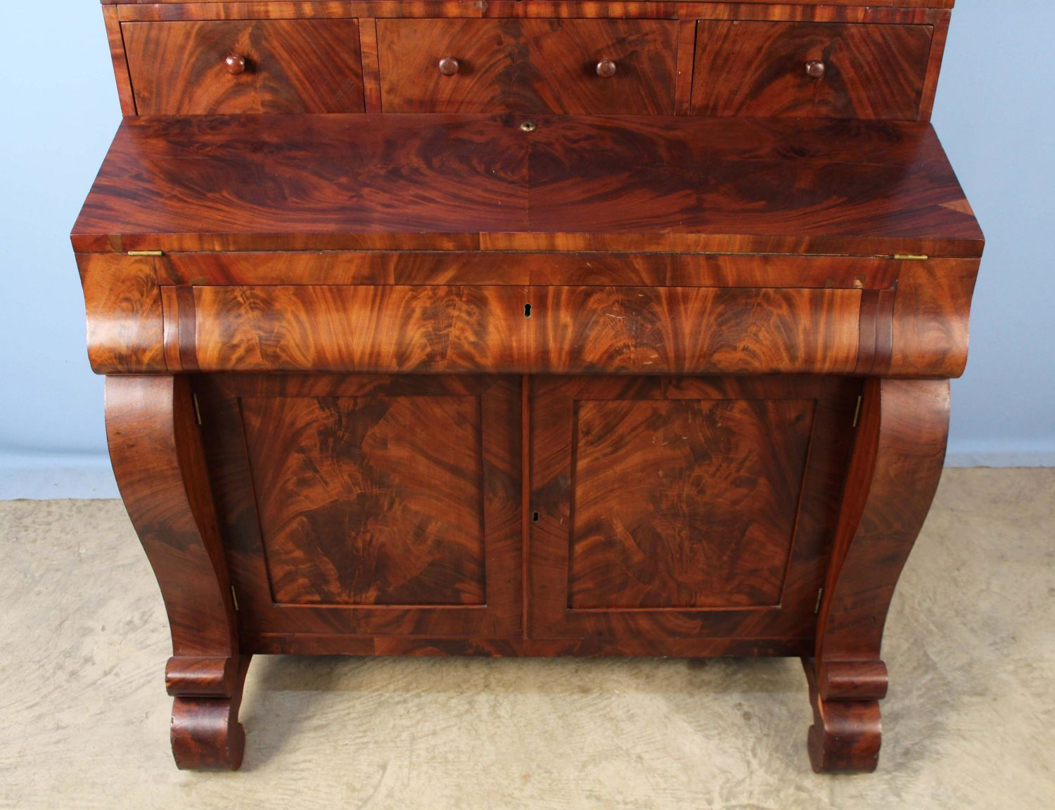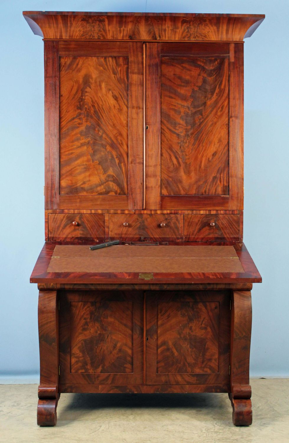American Empire Crotch Mahogany Secretary Desk. Desk has scrolled pilasters and feet, a fold down writing area with leather top and recessed compartment for inkwell and pen, and two blind doors with three adjustable shelves. Measures 86 1/4" high x 51 7/8" wide x 25 7/8" deep. This is a two-part cabinet. Condition- Some veneer loses and repairs. See photos.