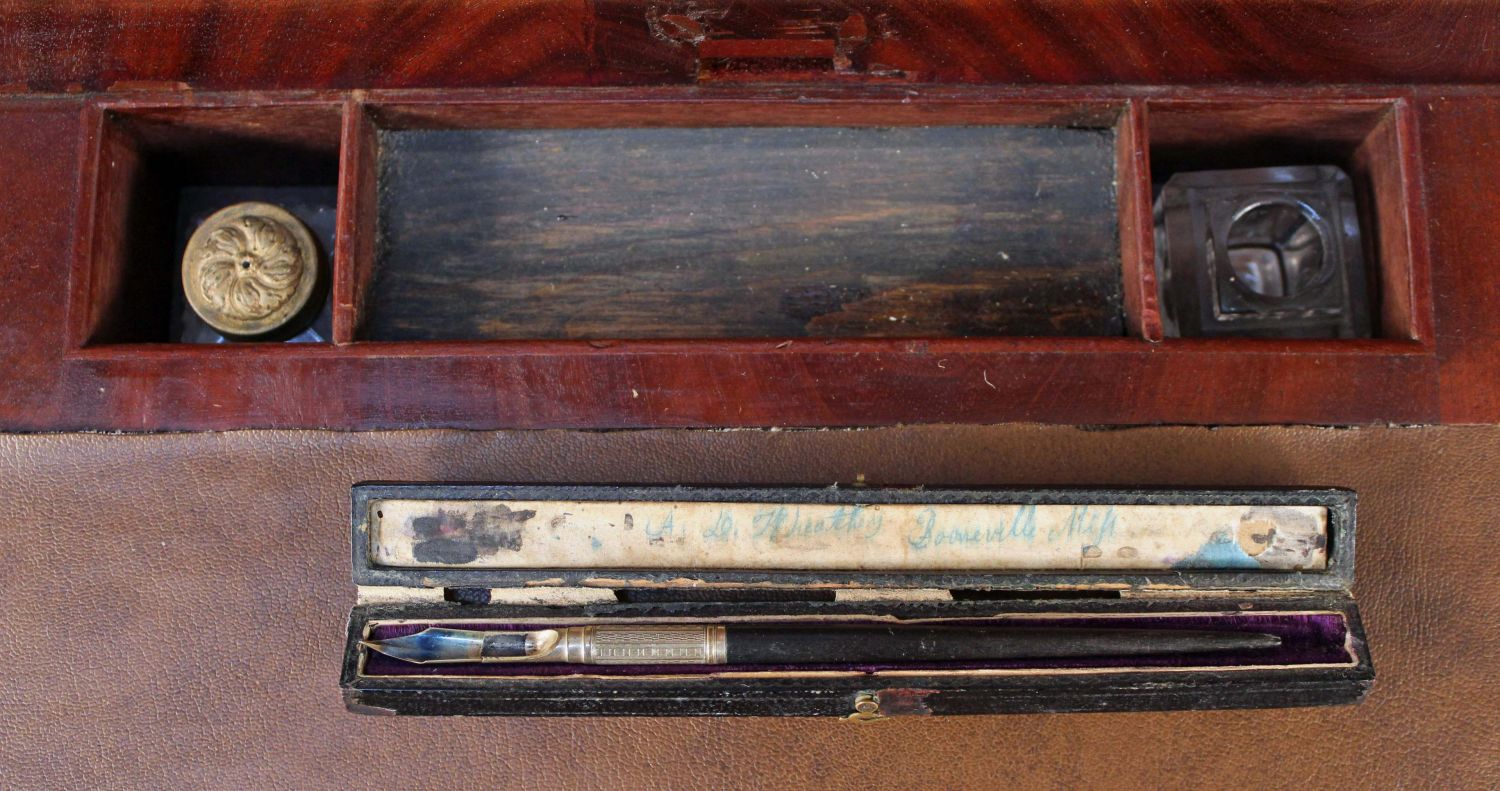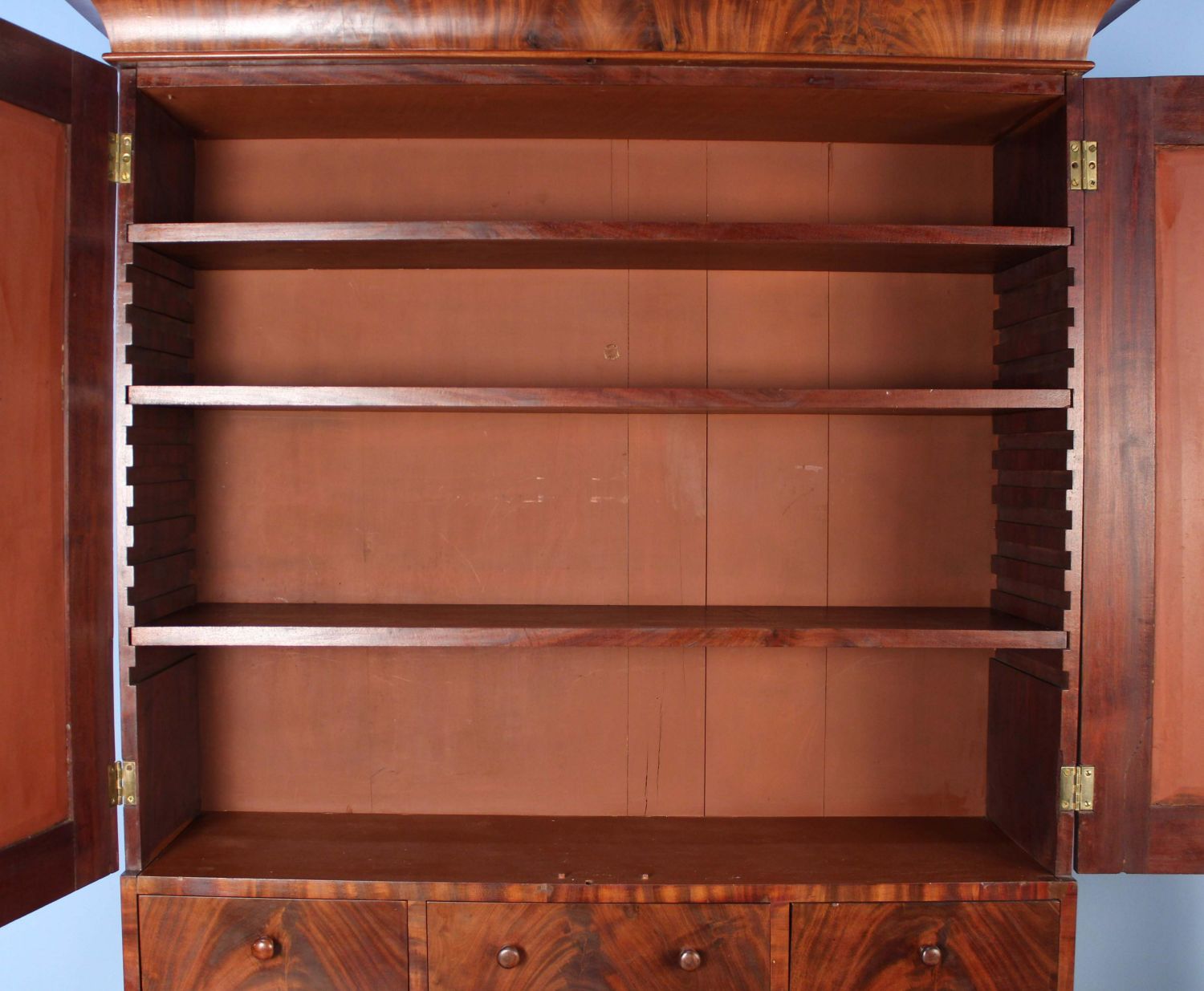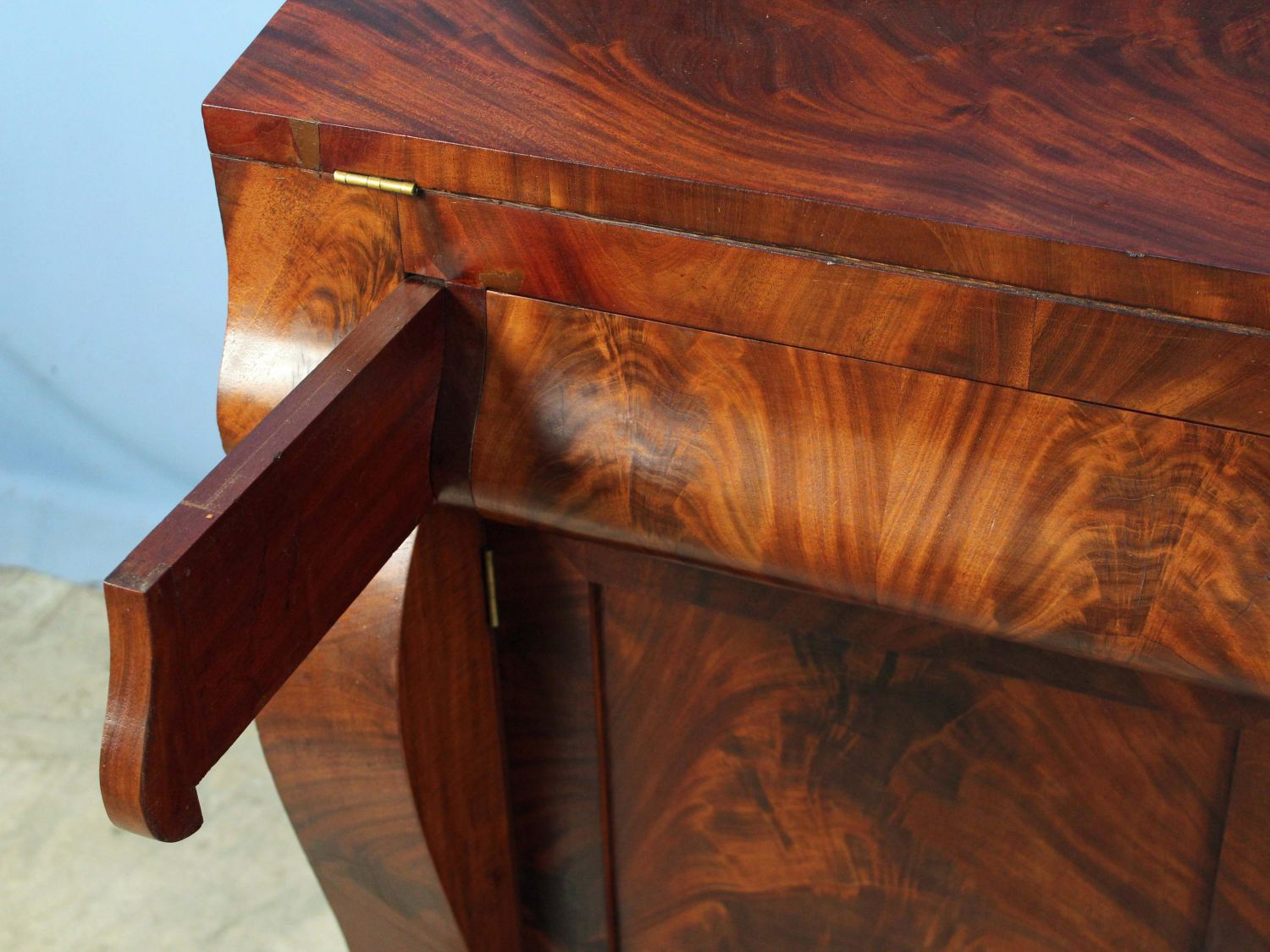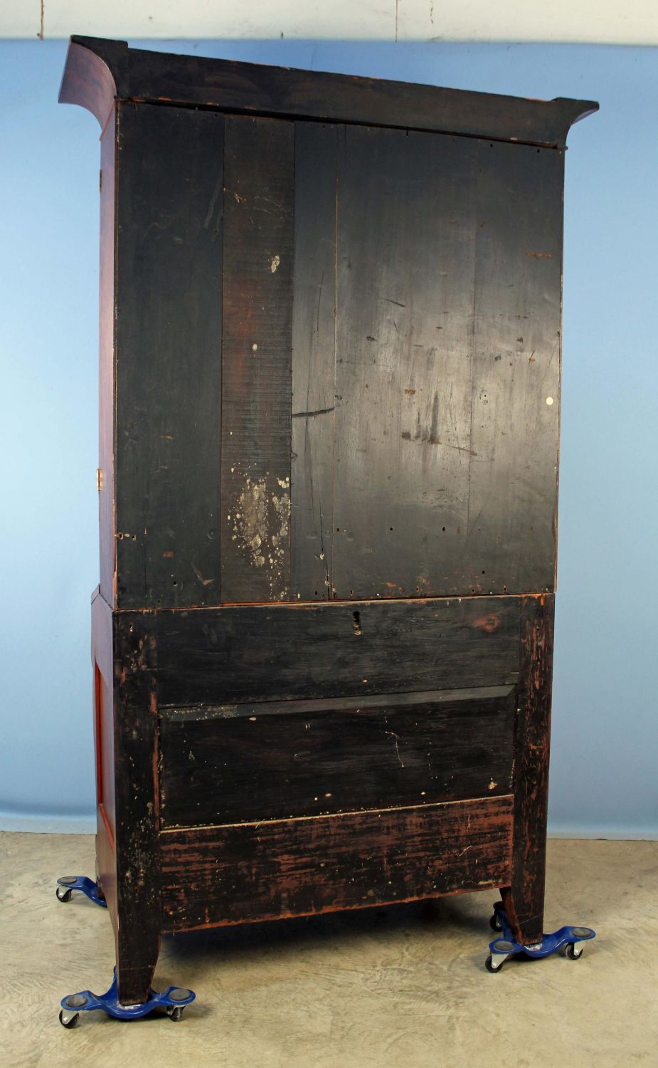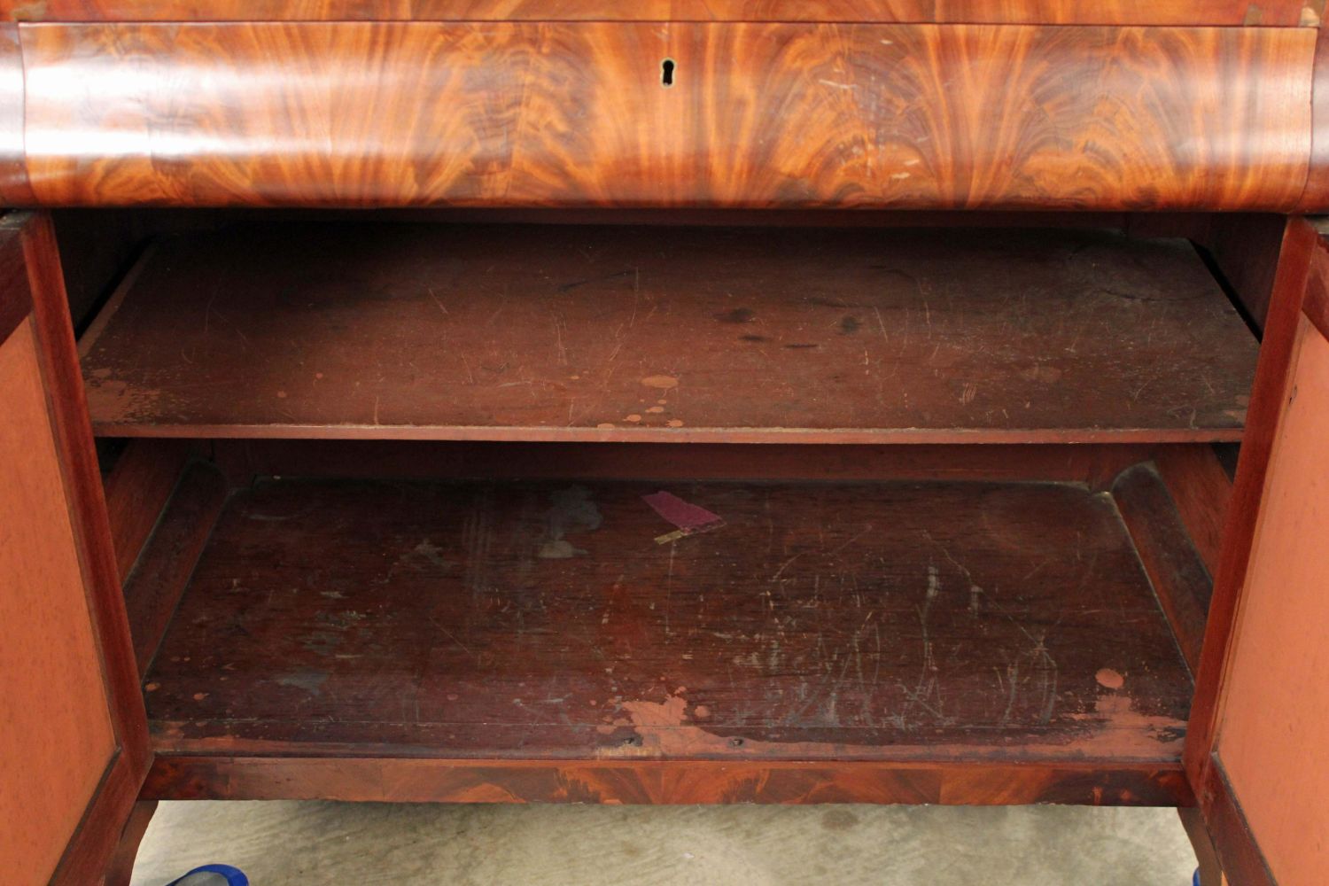 American Empire Crotch Mahogany Secretary Desk. Desk has scrolled pilasters and feet, a fold down writing area with leather top and recessed compartment for inkwell and pen, and two blind doors with three adjustable shelves. Measures 86 1/4" high x 51 7/8" wide x 25 7/8" deep. This is a two-part cabinet. Condition- Some veneer loses and repairs. See photos.