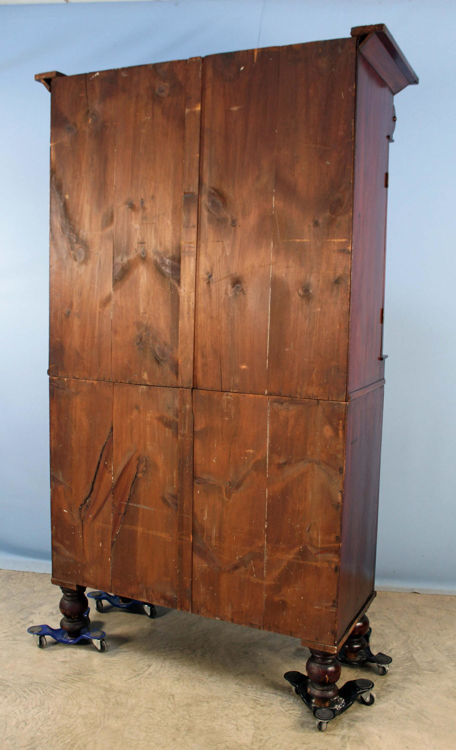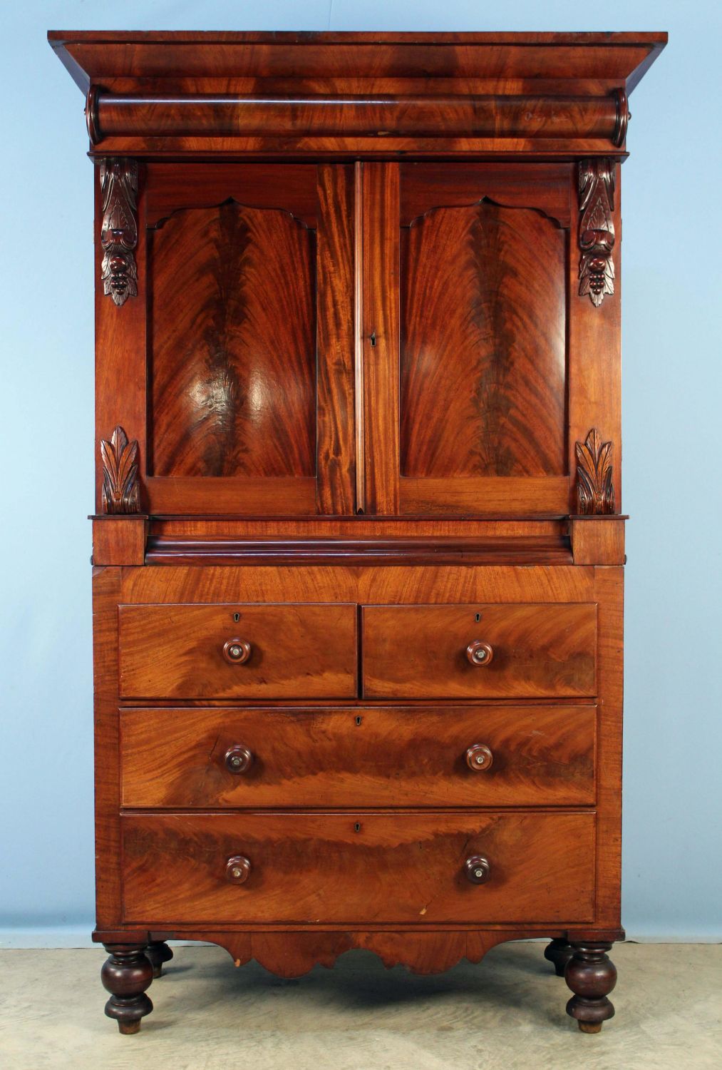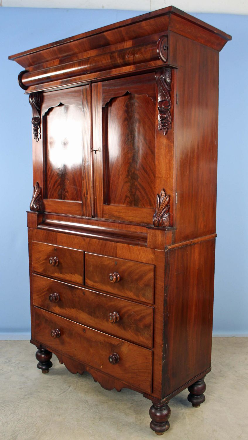 English Empire Mahogany Linen Press. Press has two blind doors with two shelves in upper section. Base has four large drawers. Condition- This piece appears to be all original with some added shelf brackets. Has some minor scratches and veneer damage. Overall good condition. See photos.