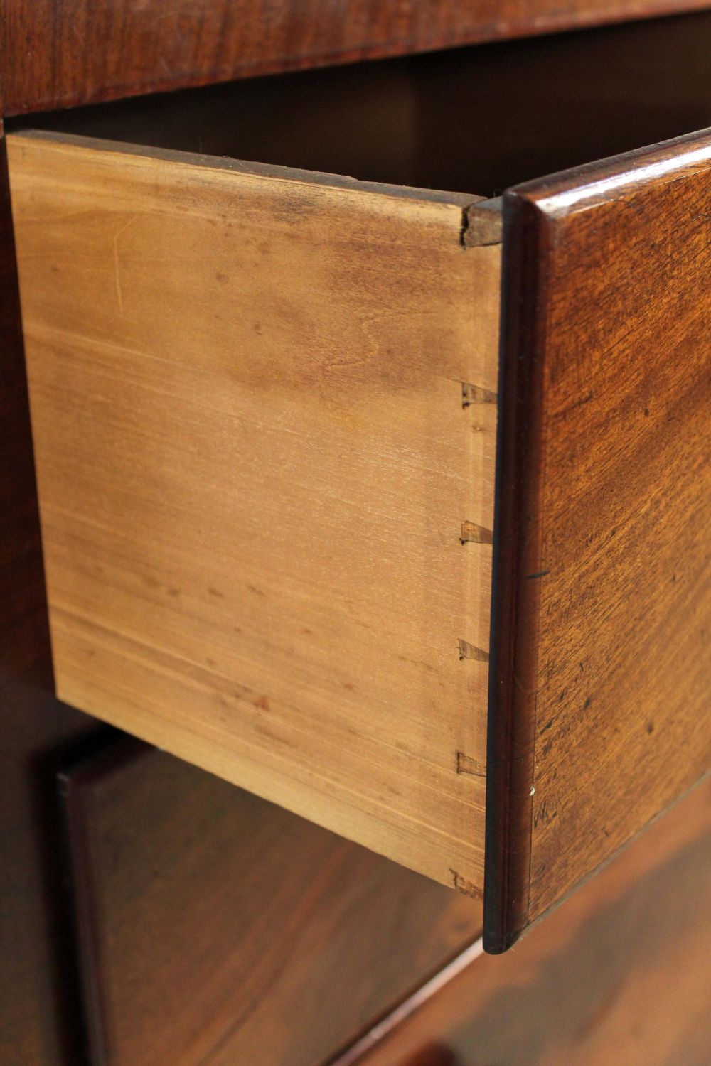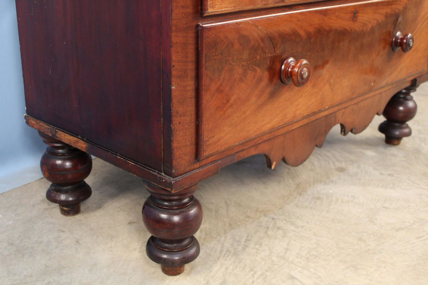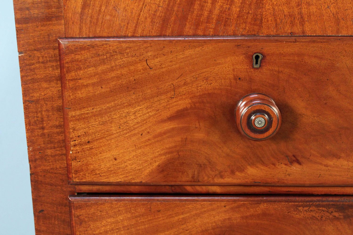 English Empire Mahogany Linen Press. Press has two blind doors with two shelves in upper section. Base has four large drawers. Condition- This piece appears to be all original with some added shelf brackets. Has some minor scratches and veneer damage. Overall good condition. See photos.