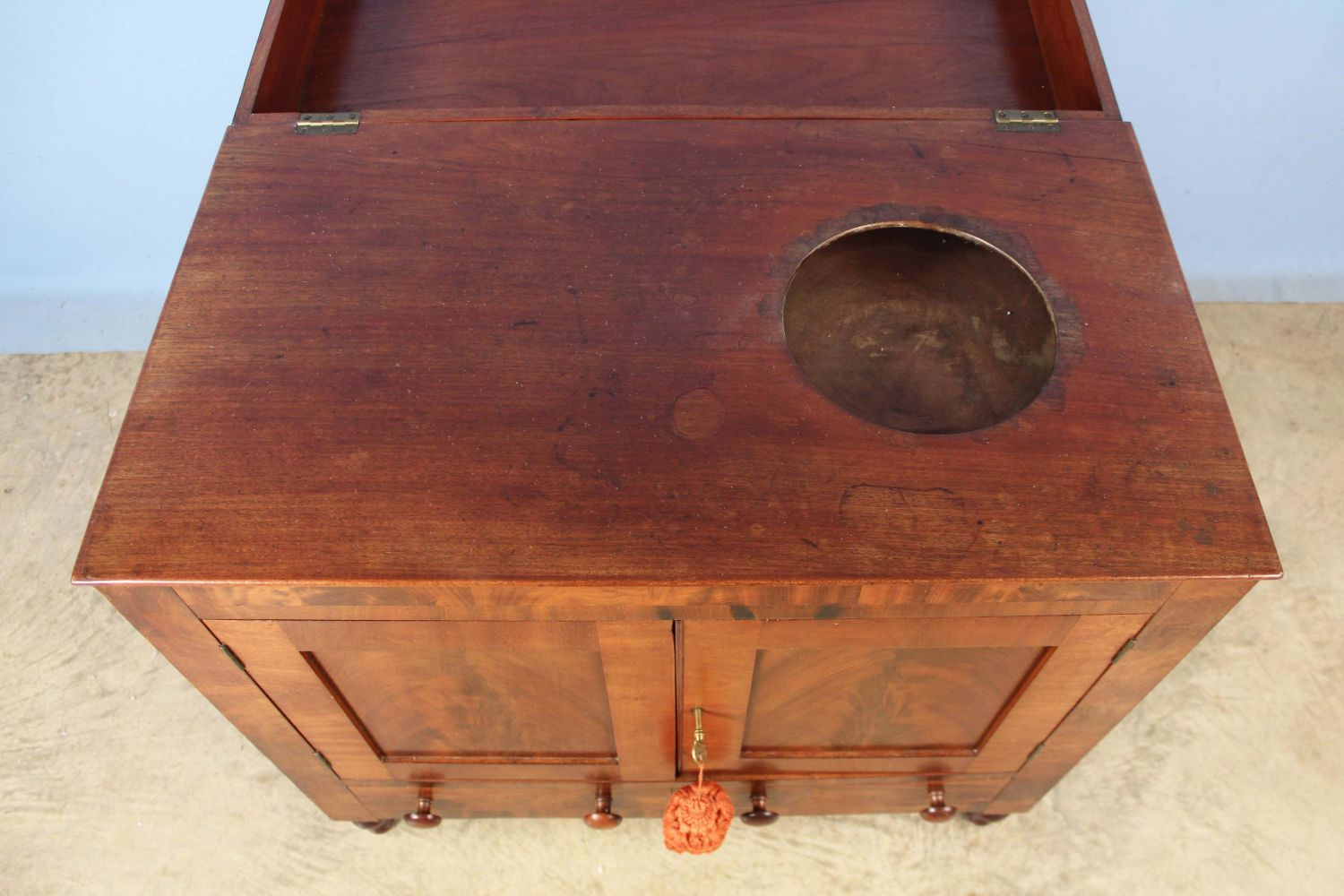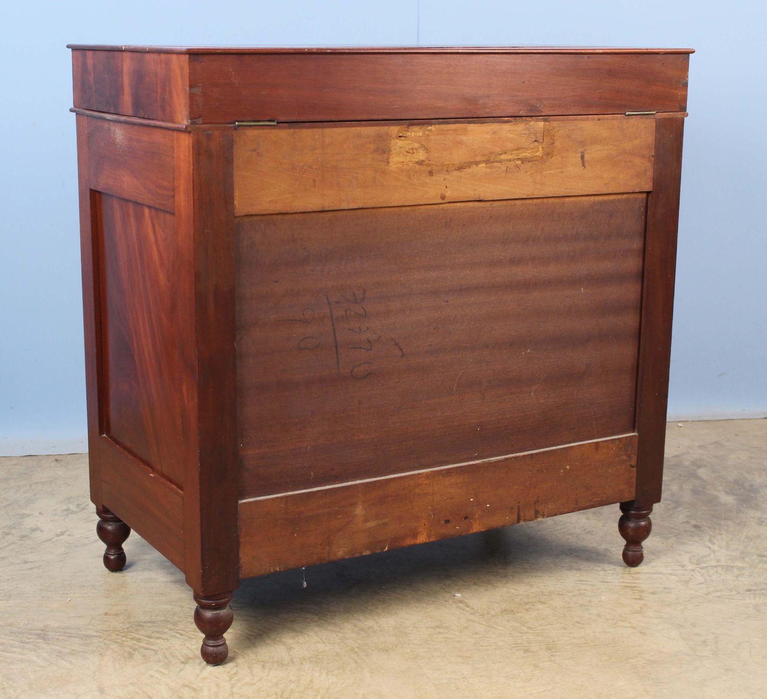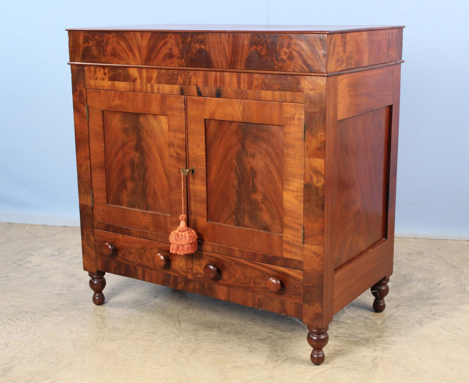 American Classical Mahogany Washstand Circa 1830. Washstand has a lift top with hole for water vessel, two blind doors with crotch mahogany panels, and two drawers below on turned legs. Measures 33 1/8" high x 33" wide x 19" deep. Condition- Washstand is in very good condition with the exception of the top. The top has one long crack that extends the width of the top and another crack in the top that is 16" long. See photos.