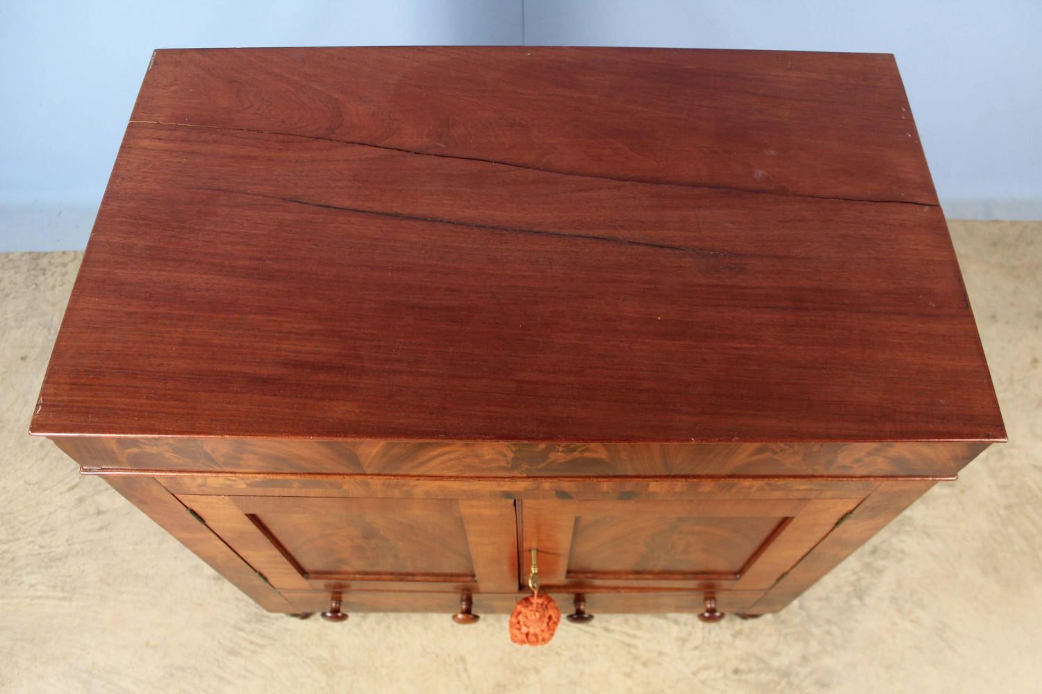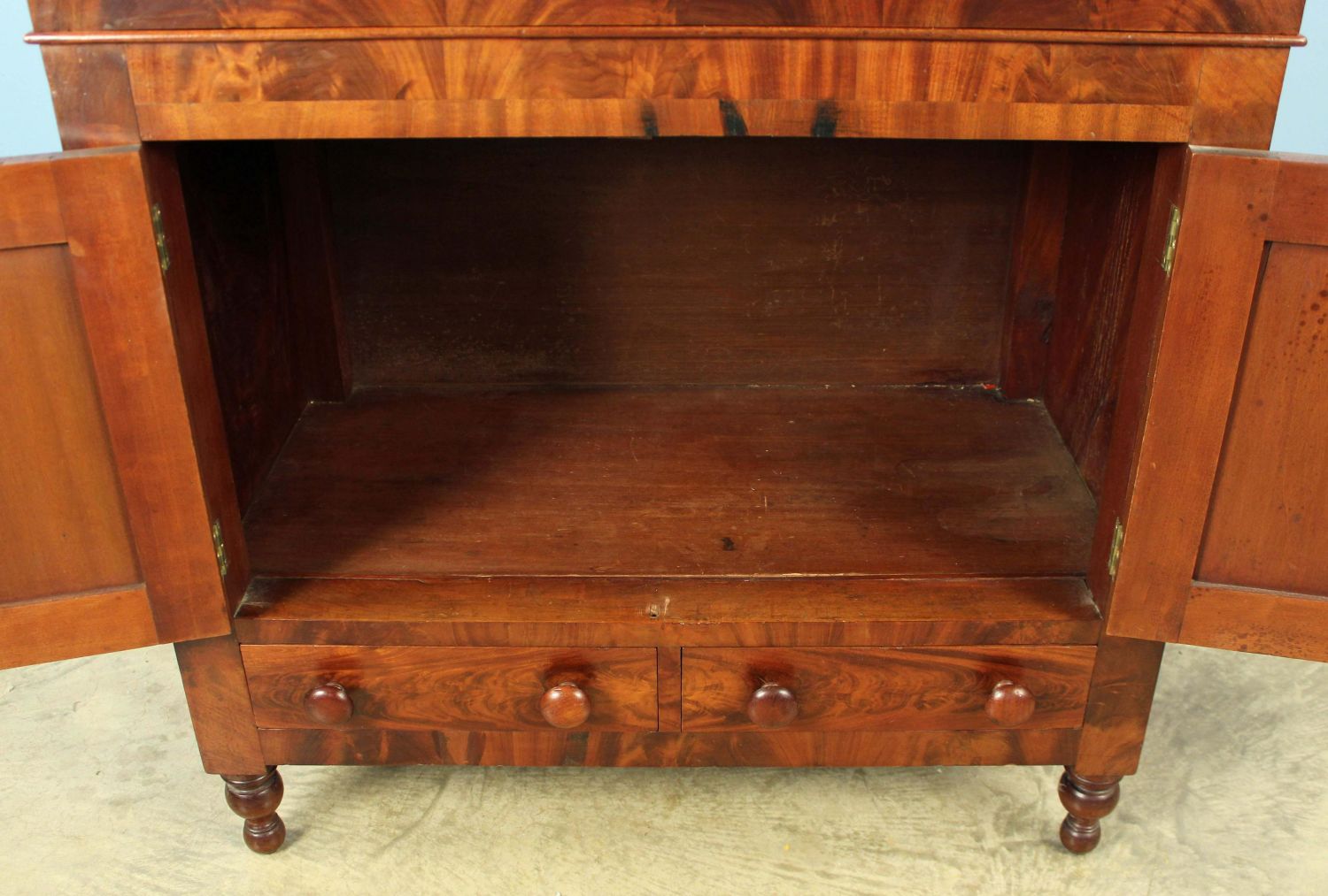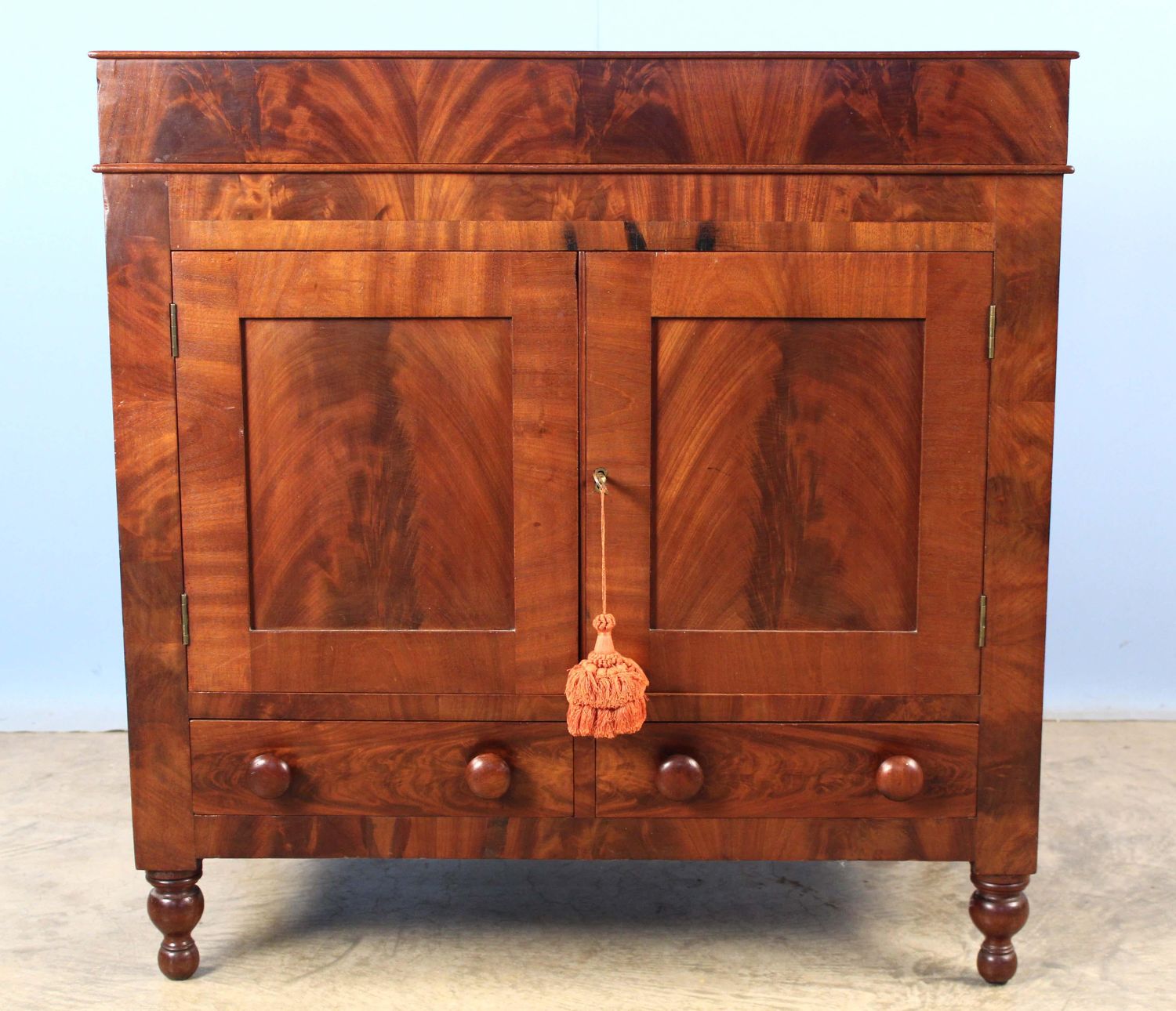 American Classical Mahogany Washstand Circa 1830. Washstand has a lift top with hole for water vessel, two blind doors with crotch mahogany panels, and two drawers below on turned legs. Measures 33 1/8" high x 33" wide x 19" deep. Condition- Washstand is in very good condition with the exception of the top. The top has one long crack that extends the width of the top and another crack in the top that is 16" long. See photos.