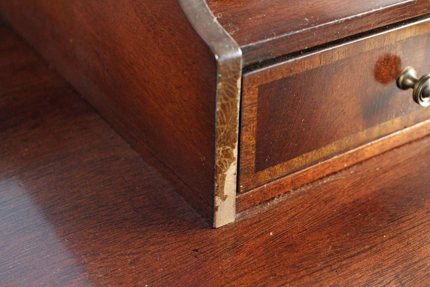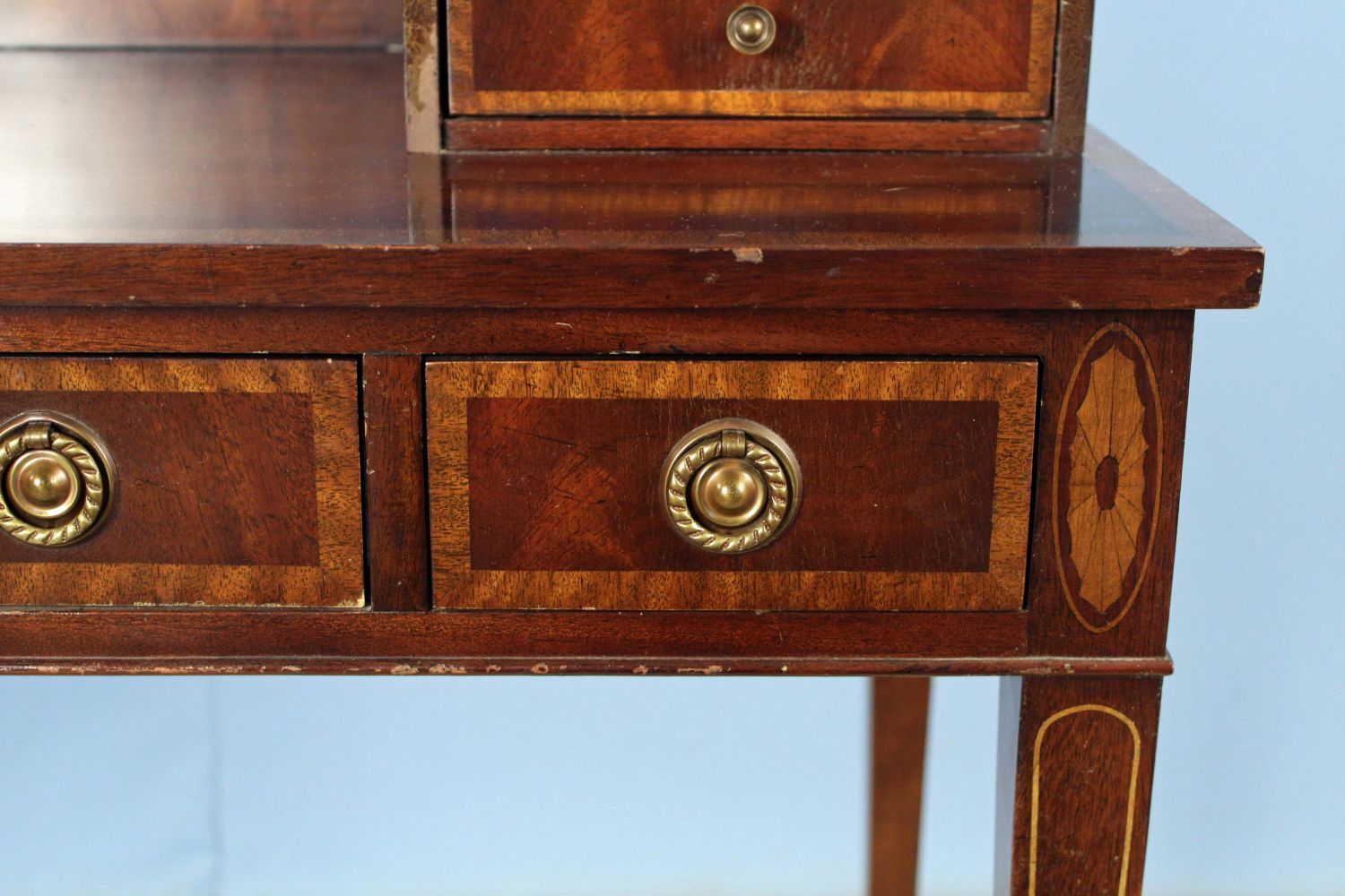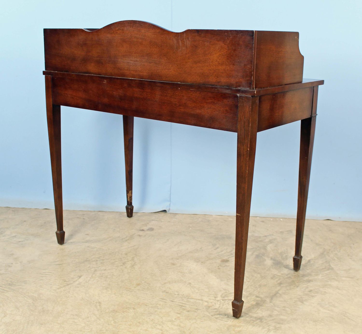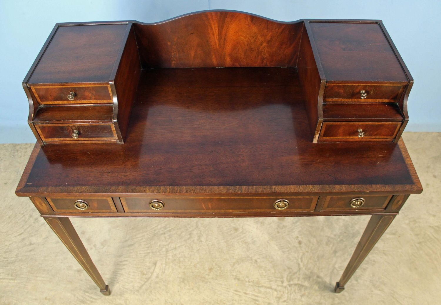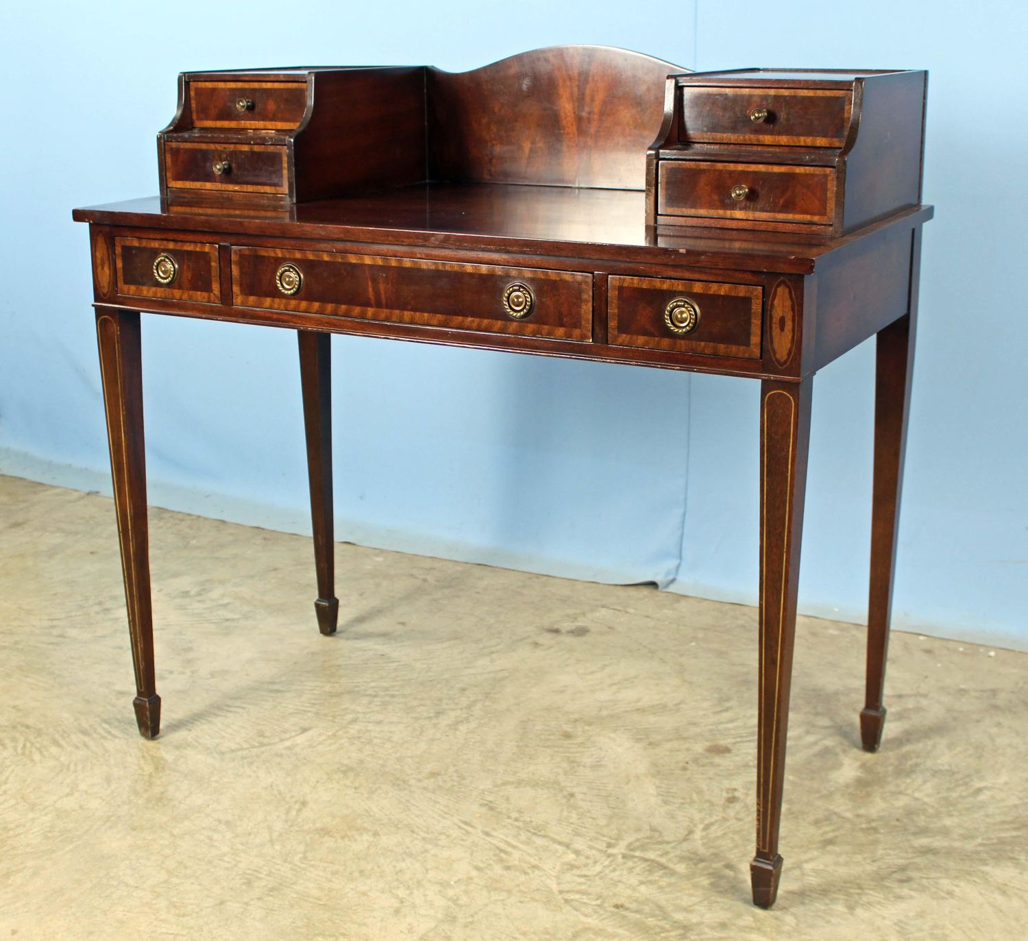 Hepplewhite Style Lady’s Mahogany Writing Desk. Desk has seven drawers with brass pulls, banded top and drawer fronts, and medallion and string inlay. Measures 35 3/4" high x 38" wide x 19" deep. Condition- Desk is in overall good condition. See photos.