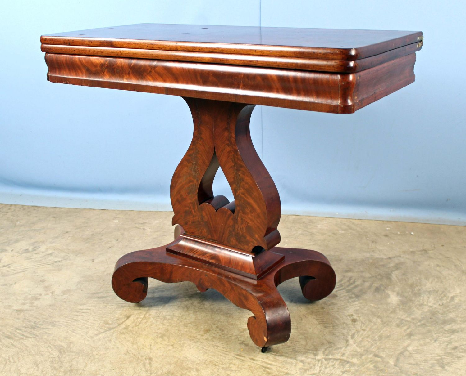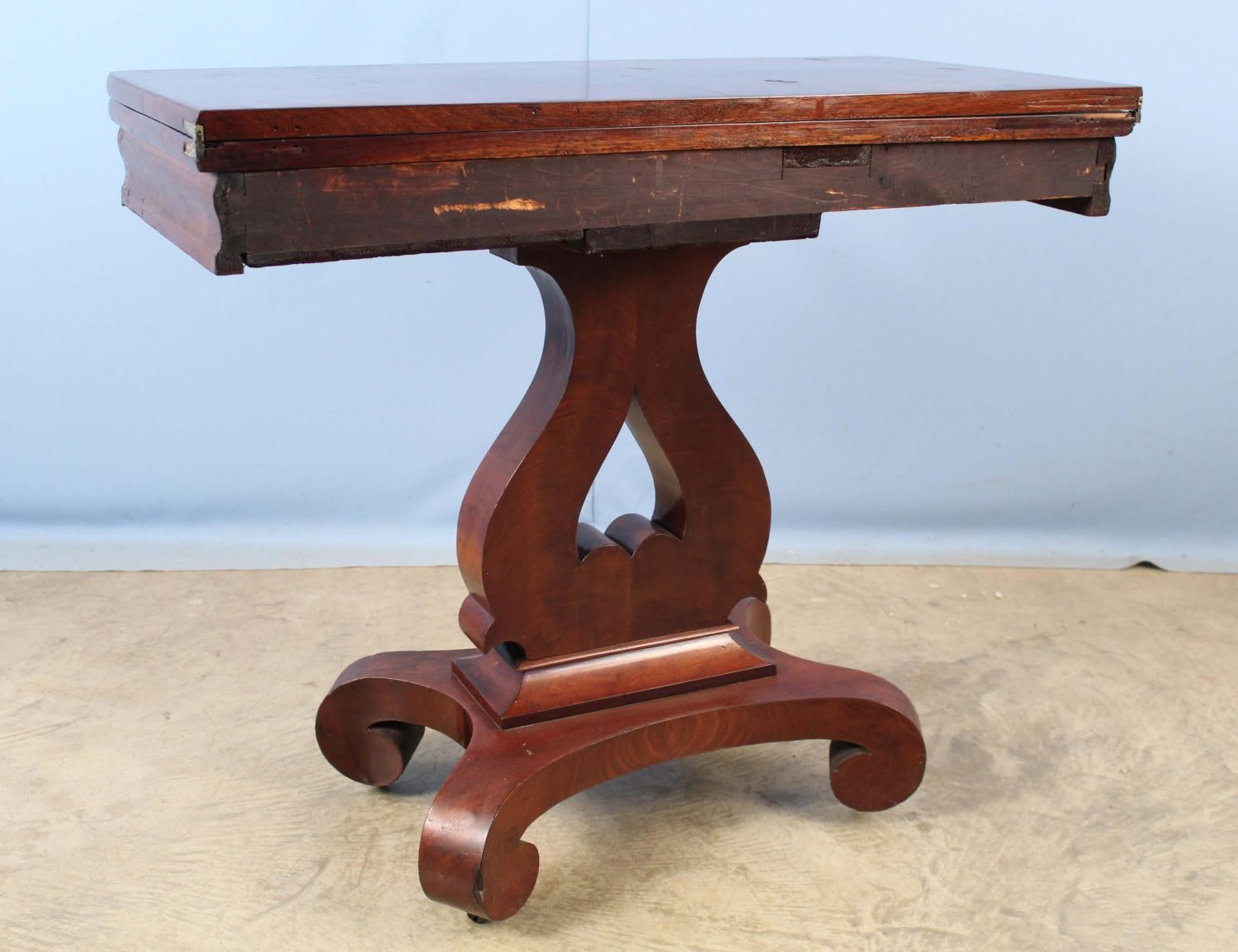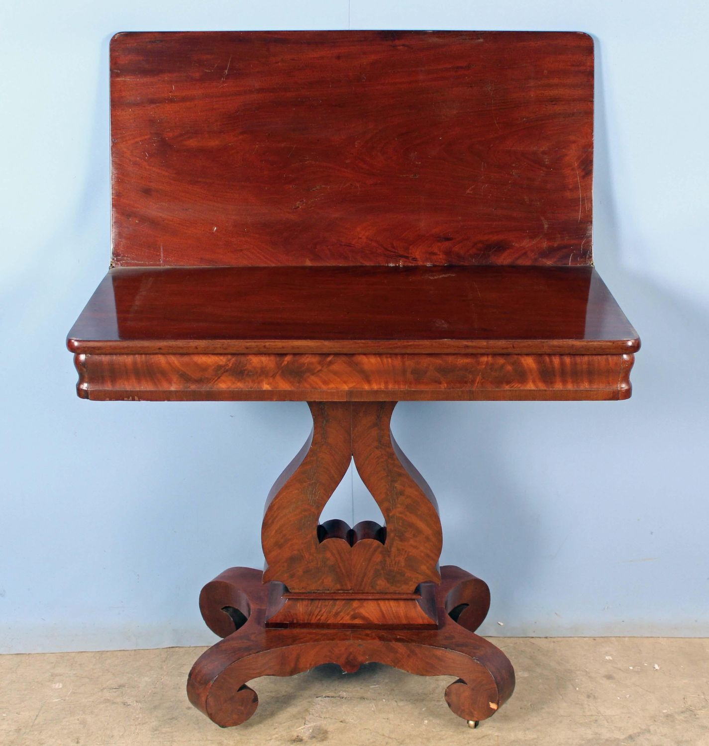 Mahogany Game Table Circa 1840. Top folds and turns to form 33" deep. Unfolded the table measures 29 3/4" high x 33 3/4" wide x 16 1/2" deep. Condition- Table is in good condition. Top does have some wear, scuffs, scratches, etc. (could possibly be polished out). See photos.