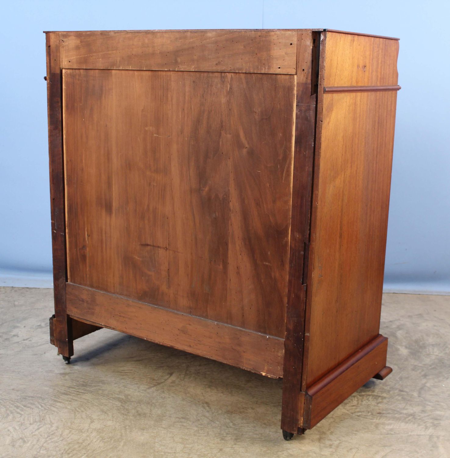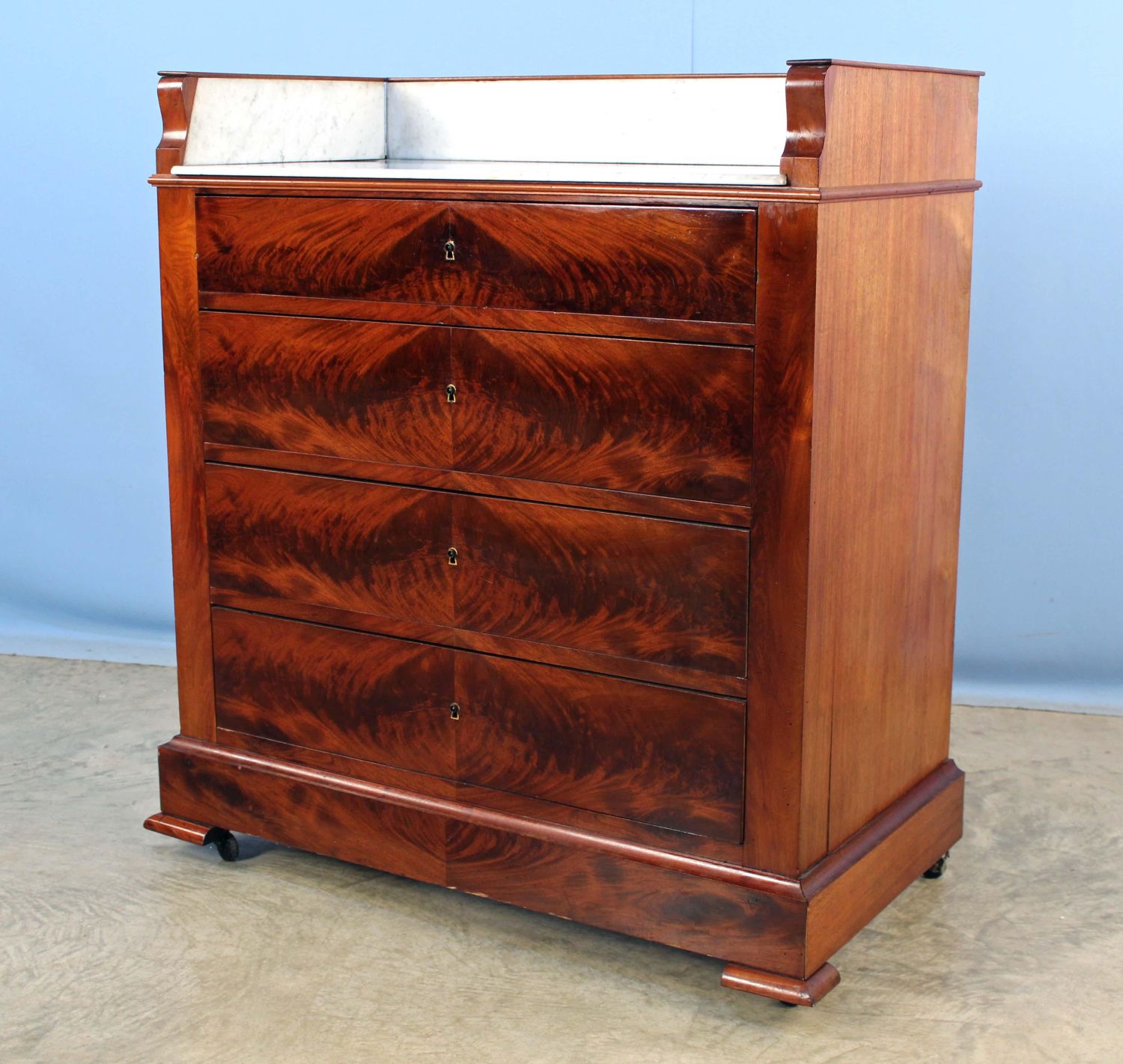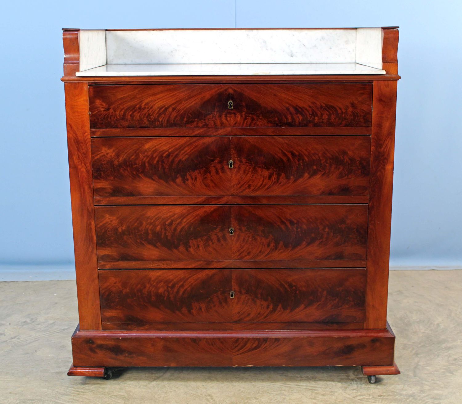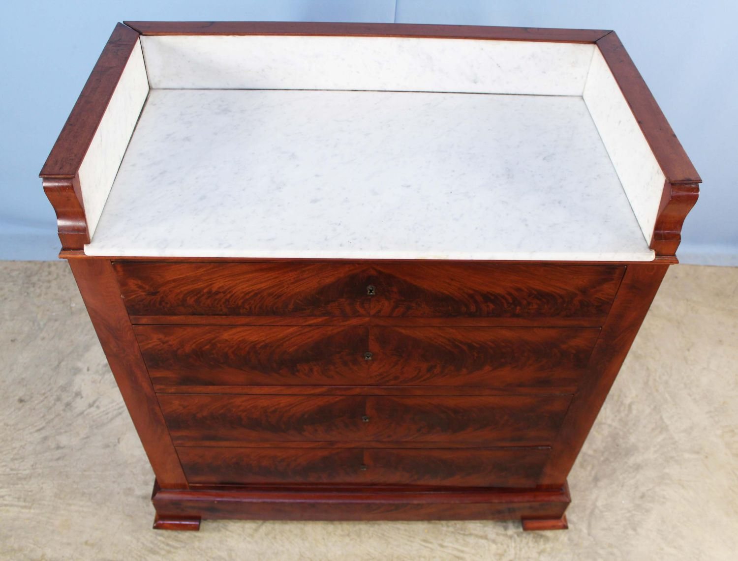 Crotch Mahogany Four Drawer Washstand with Marble Top and Splashback Circa 1840. Measures 38 1/8" high x 36 1/8" wide x 18 3/4" deep. Condition- Washstand is in overall good condition. One open glue joint on backsplash molding. See photos.
