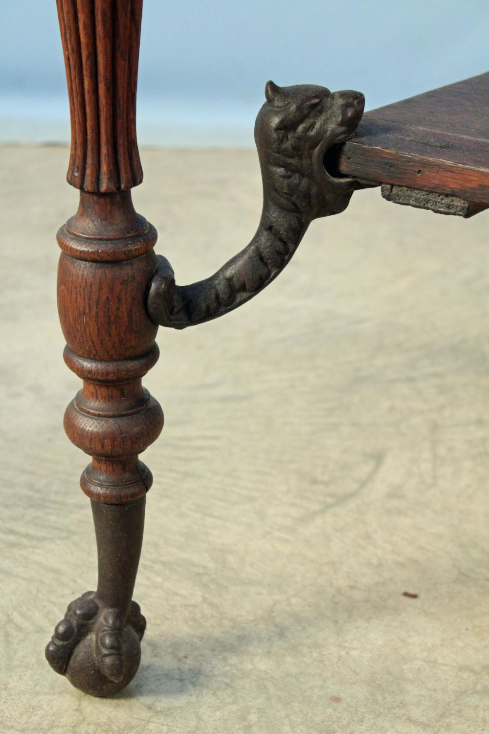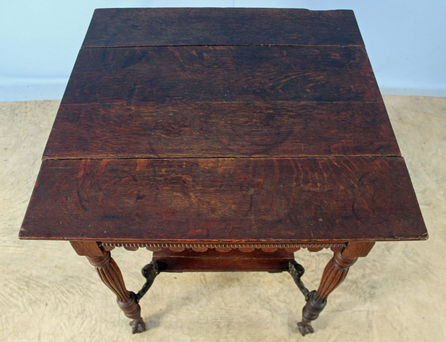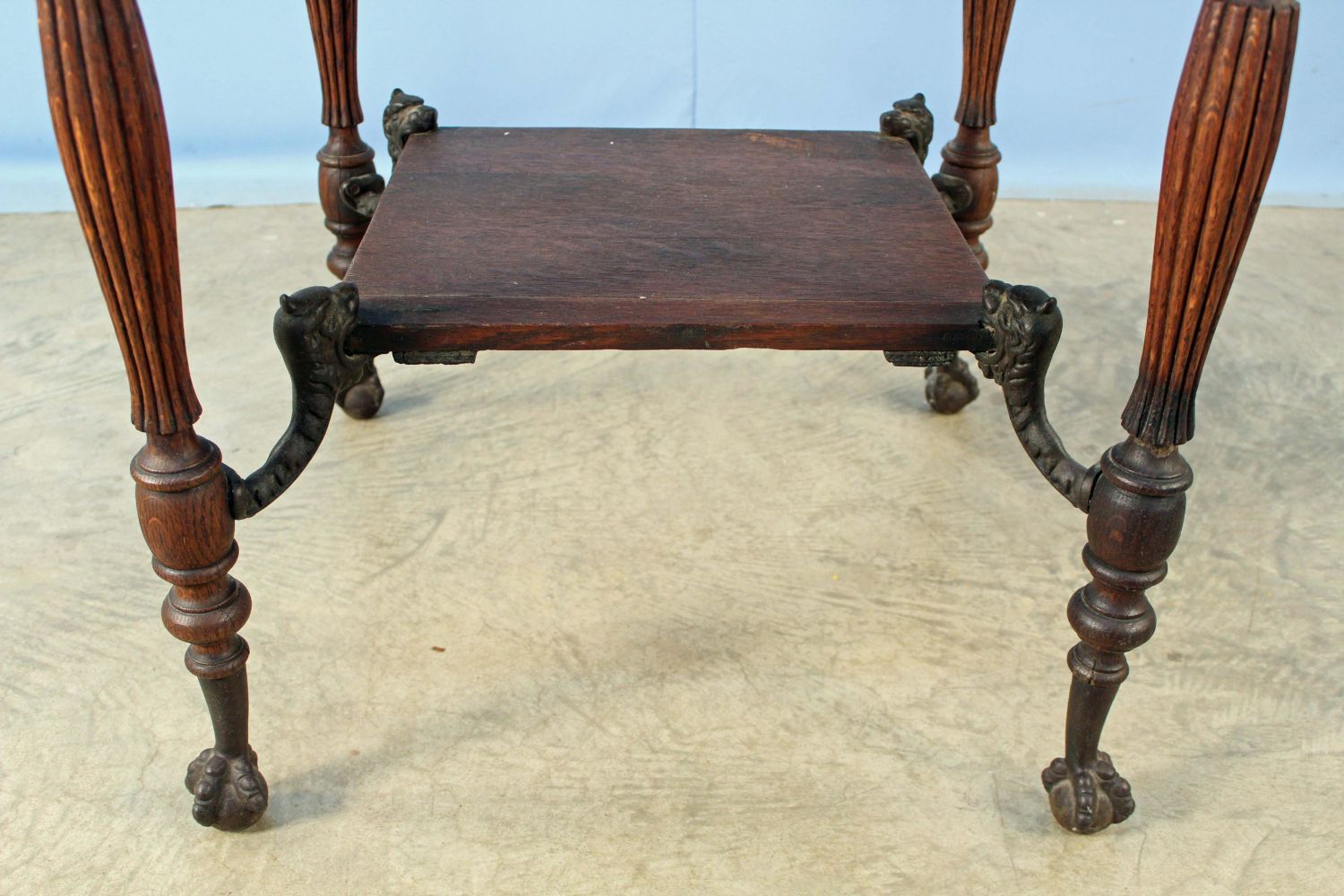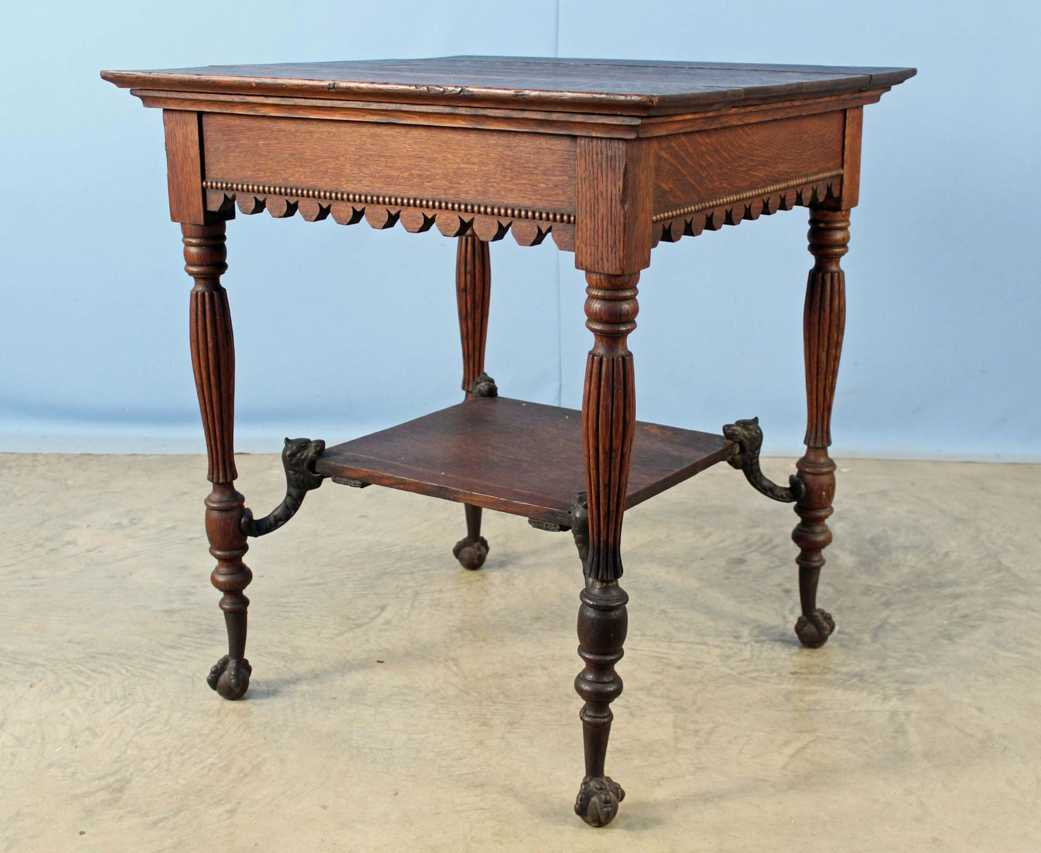 Quarter Sawn Oak Center Table with Ball & Claw Feet with Lion Shelf Brackets. Measure 31" high x 28" x 27 3/4". Condition- This table has board separation on top and bottom shelf boards, some stains, wear and missing a chip of wood at top edge. See photos.