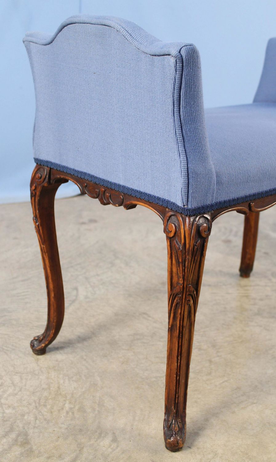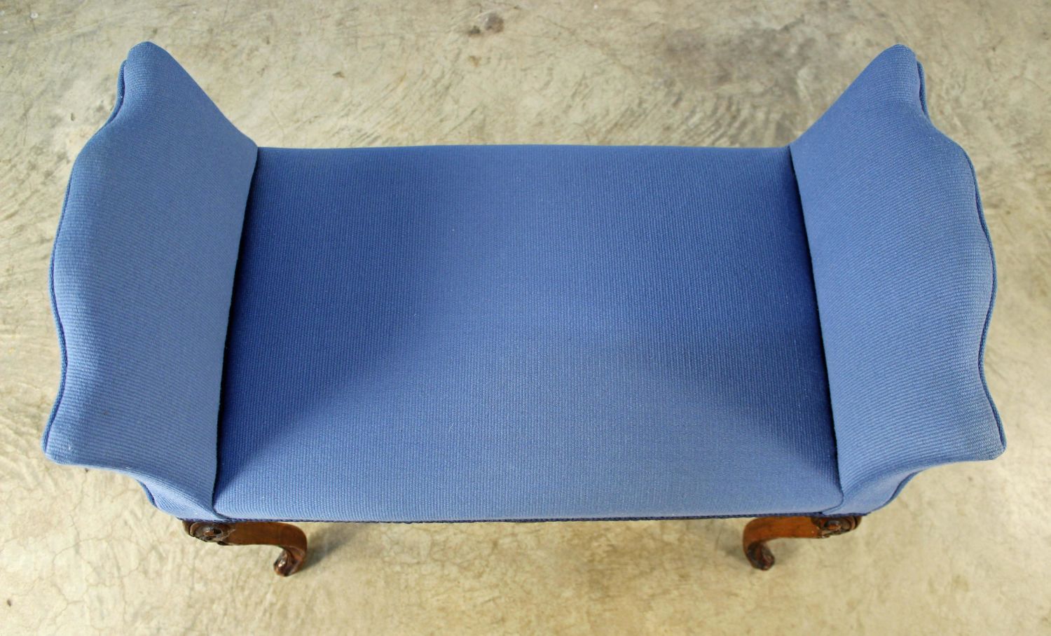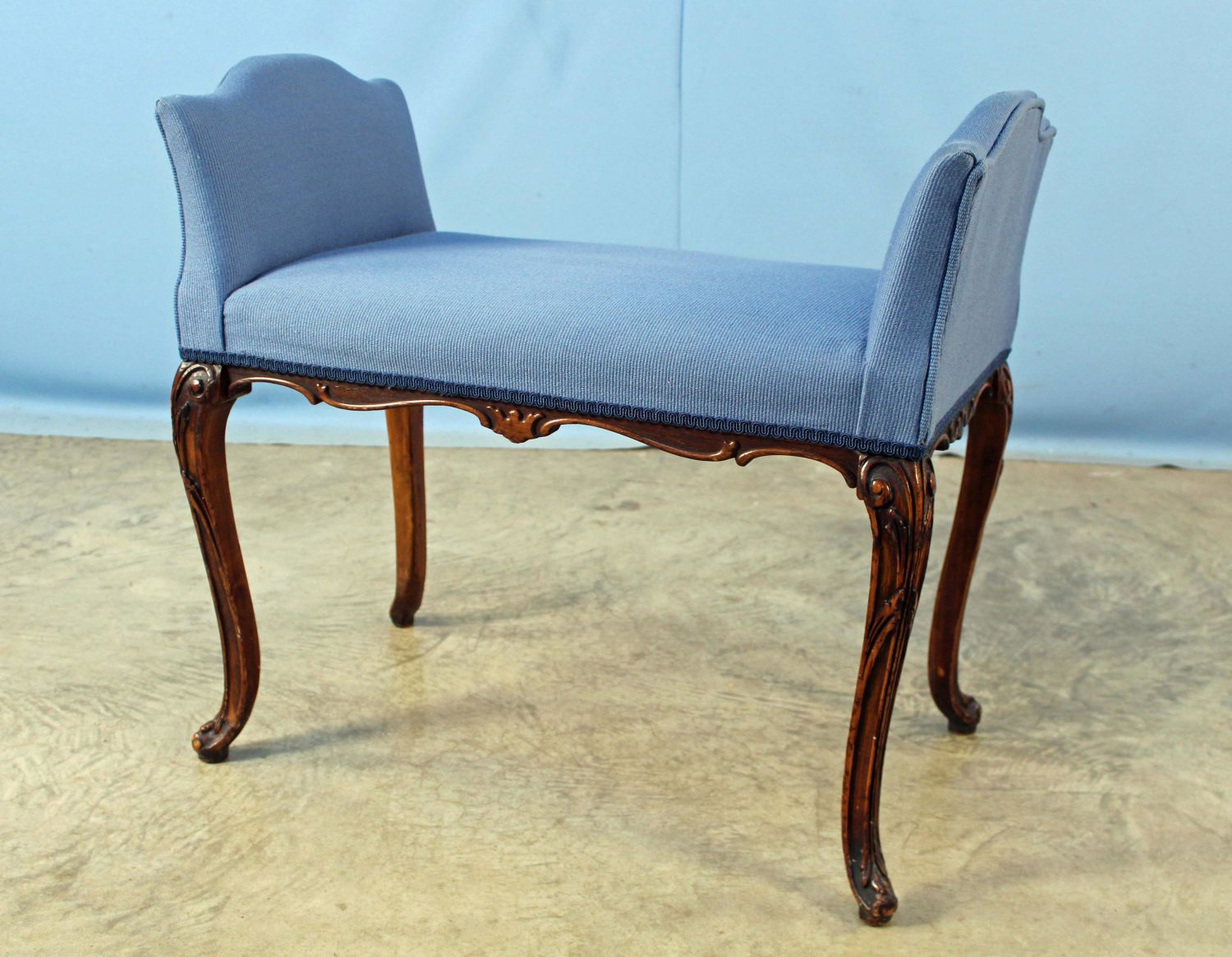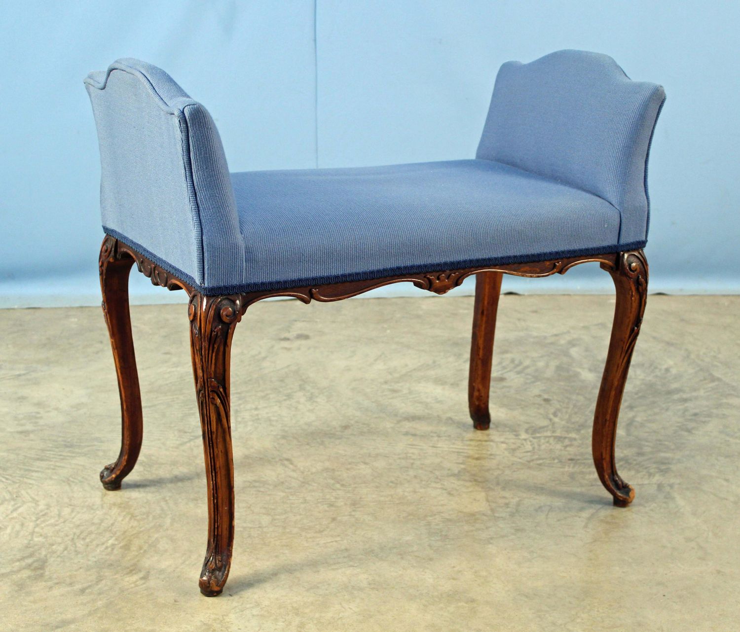 French Style Walnut Finish Stool. Measures 26" high x 28 3/4" x 16 1/2". Condition- Stool is in overall good condition with some scuffs to finish (especially on one leg). See photos.