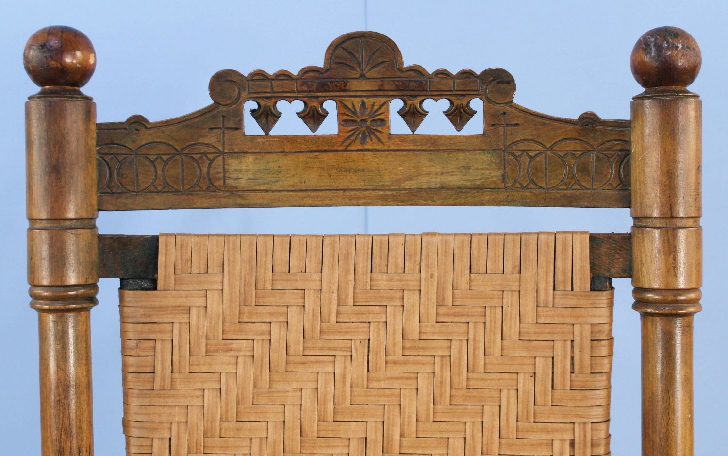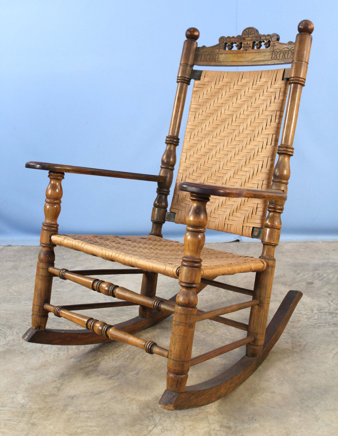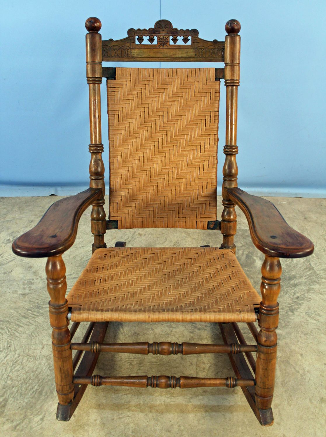 19th Century Porch Rocking Chair with Woven Seat and Back. Chair has a walnut finish. Measures 44 1/2" high x 29 1/2" wide x 35 1/2" deep. Condition- Rocking chair is in overall good condition. The fiber seat and back are not original. See photos.