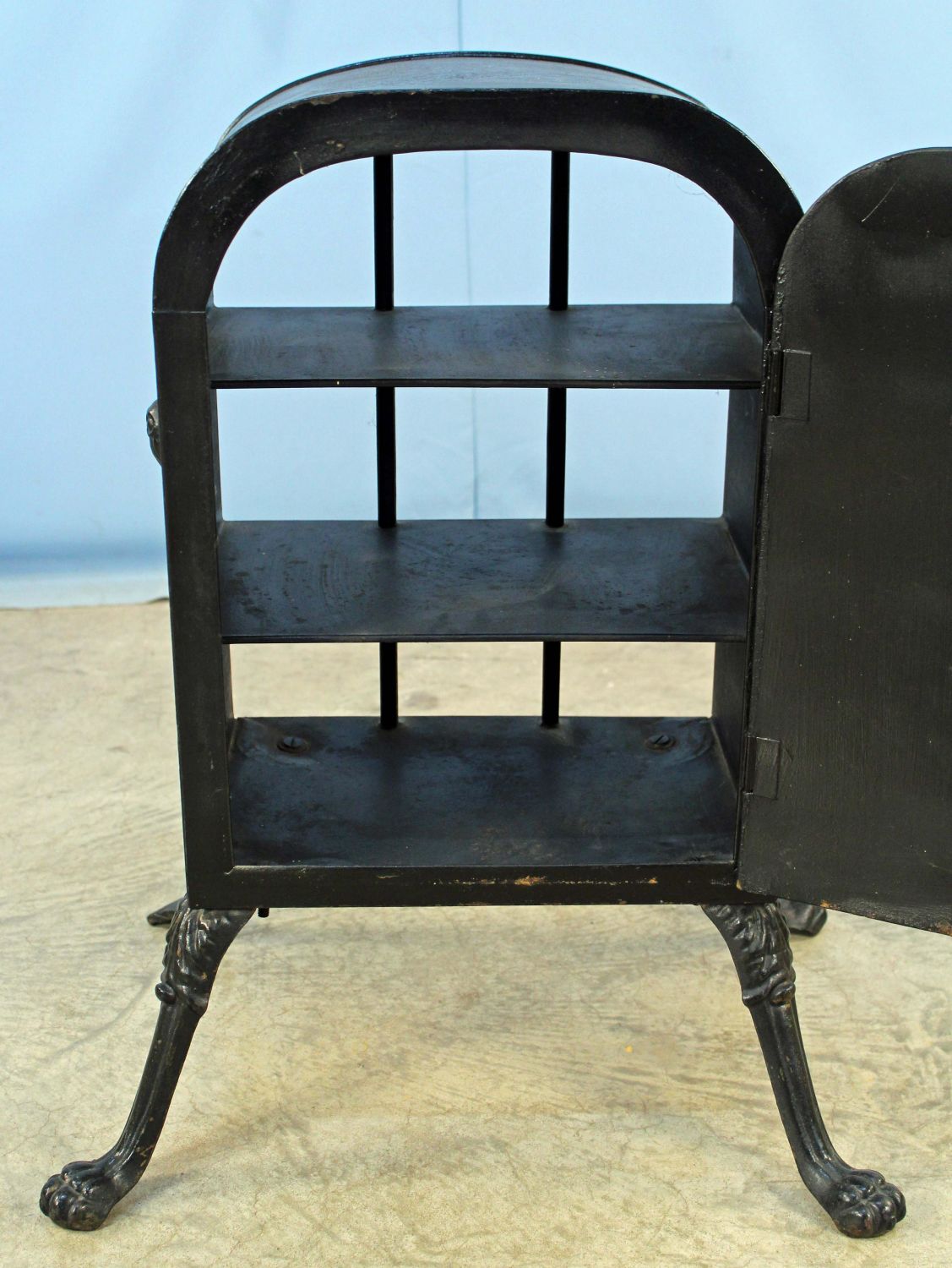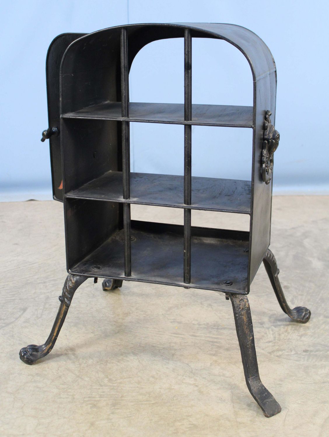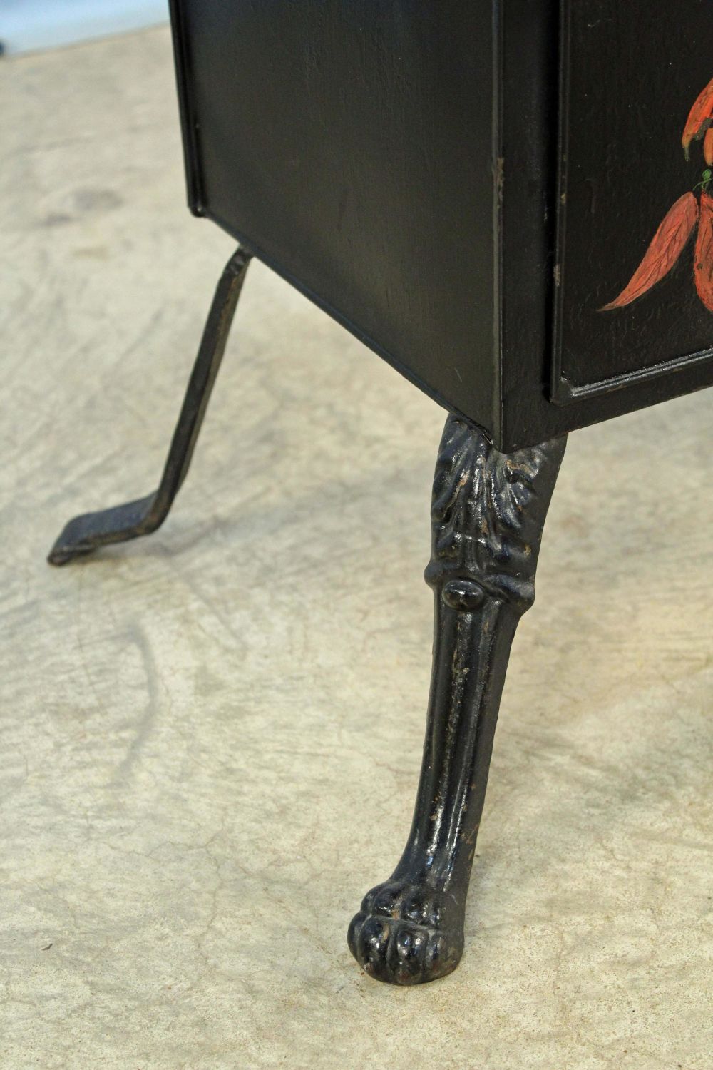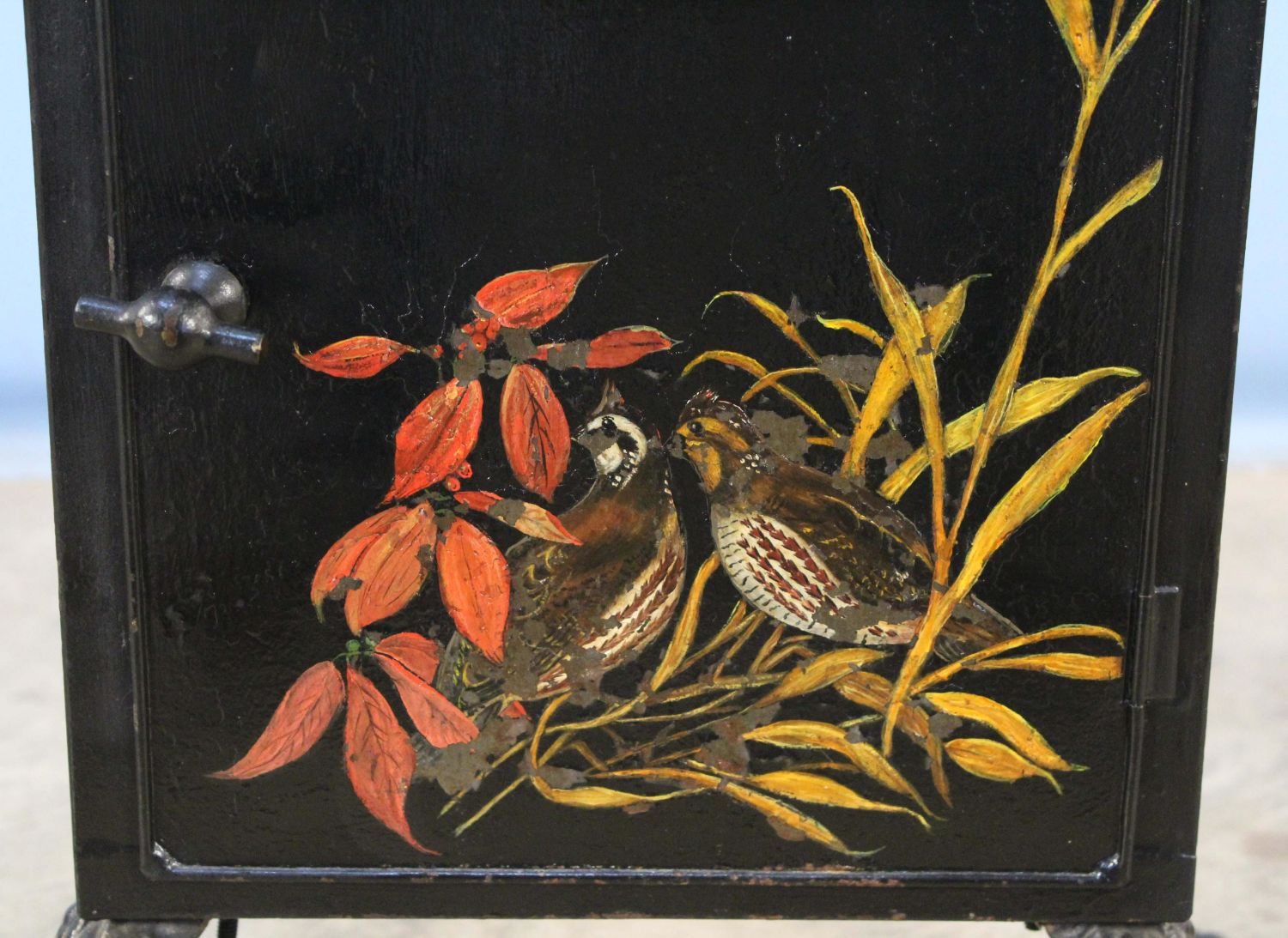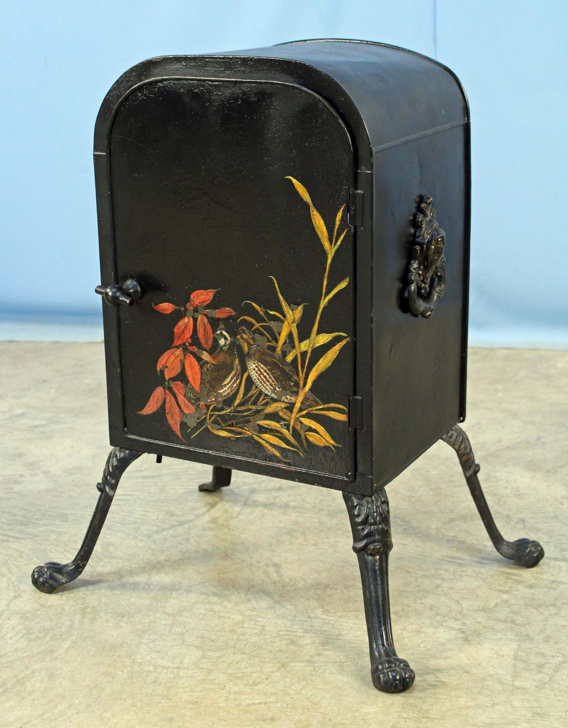 Victorian Fireplace Warmer with Hand Painted Quail Decoration On Door. Warmer has cast iron handles/legs and two metal shelves. Measures 24 3/4" high x 19 3/4" wide x 14 3/4" deep. Condition- Overall the warmer is in good condition. One leg has been replaced with a piece of flat steel.. See photos.