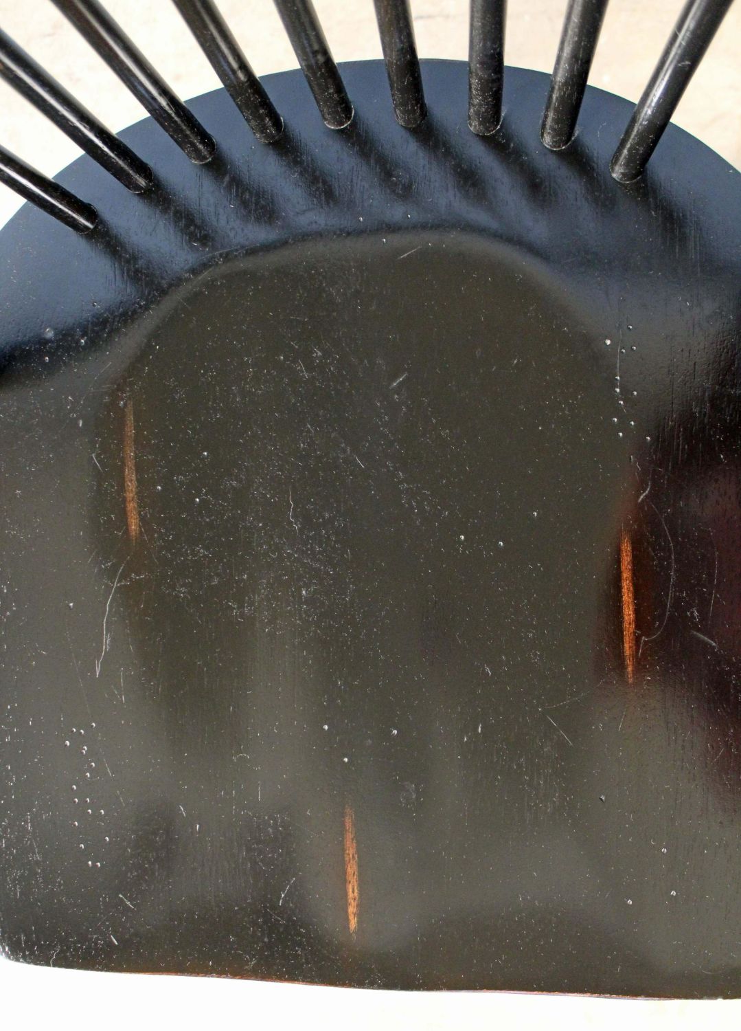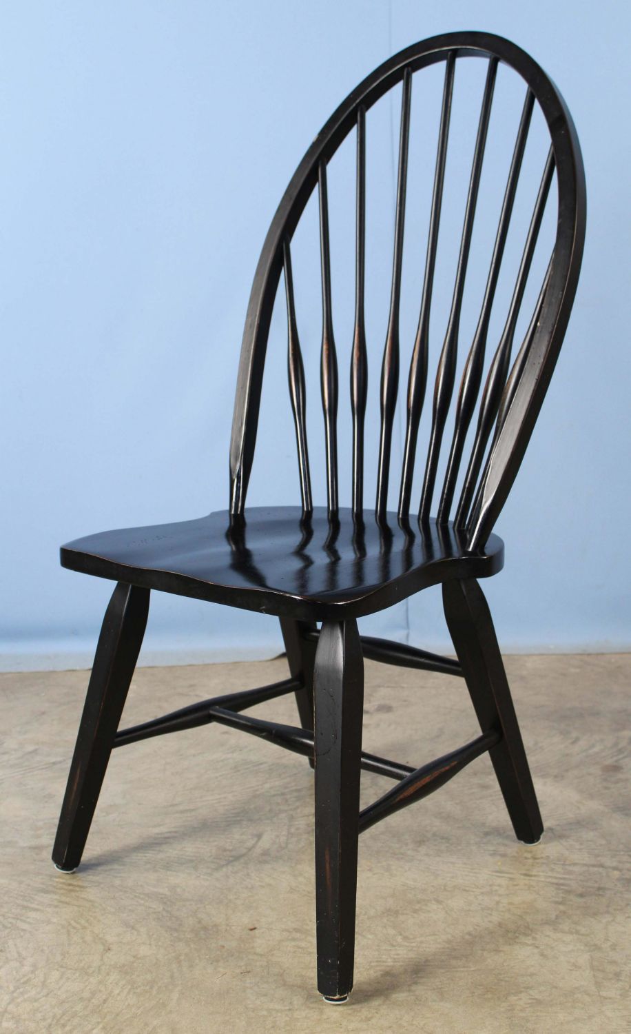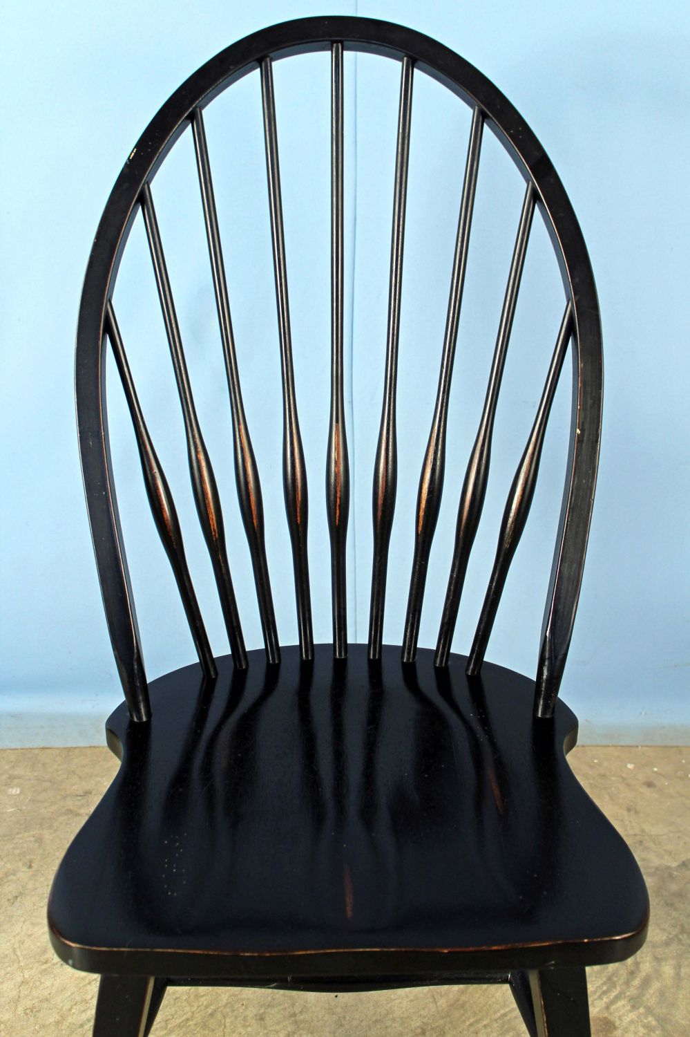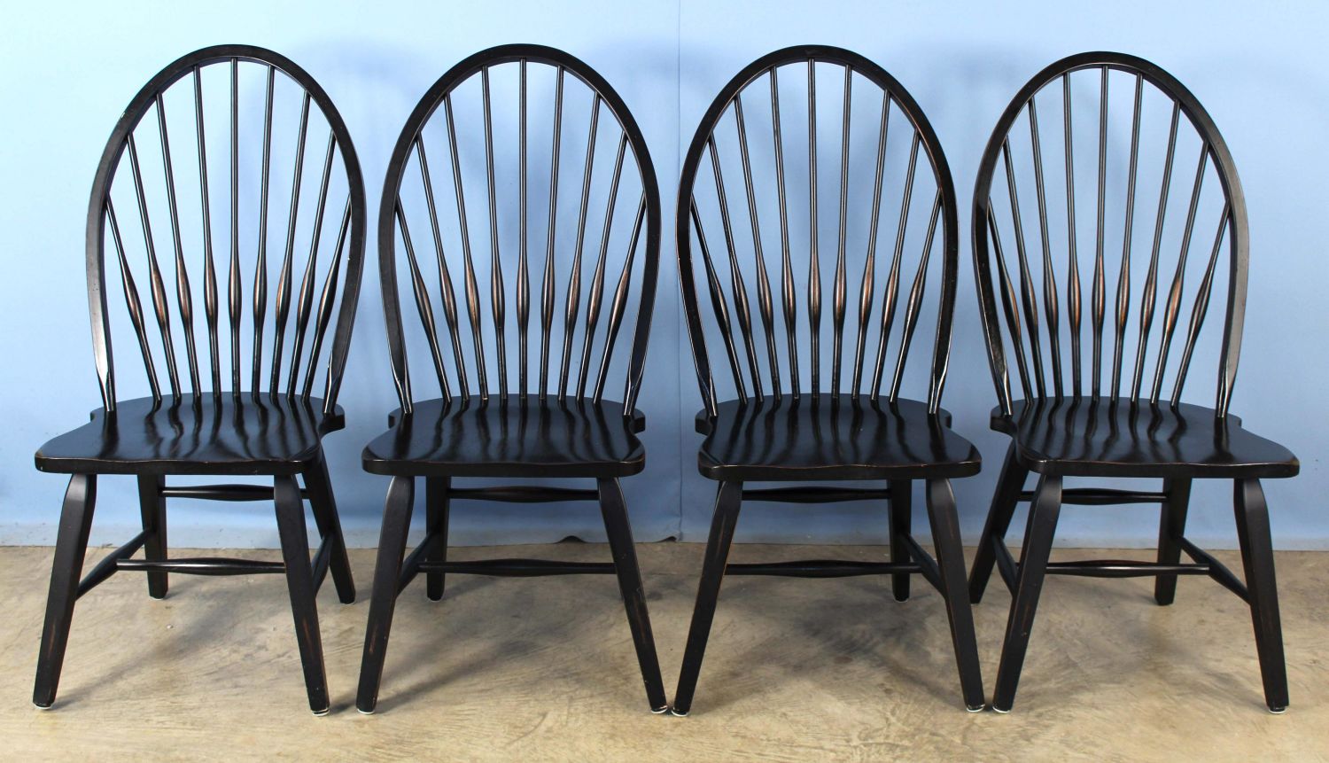 Four Black Windsor Style Dinning Chairs. Measures 43 1/2" high x 18 1/2" wide x 23" deep. Condition- Chairs are in good condition. See photos.