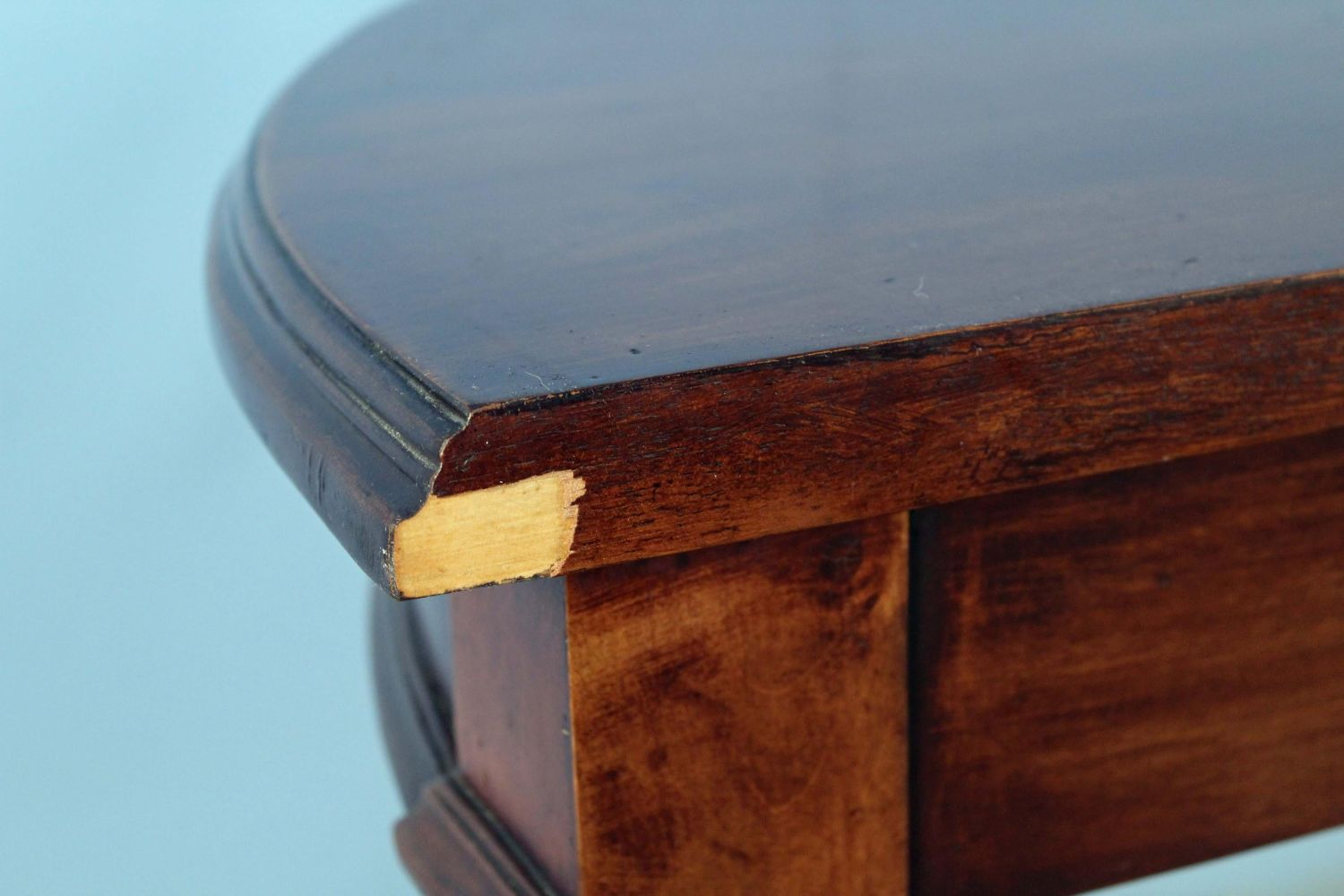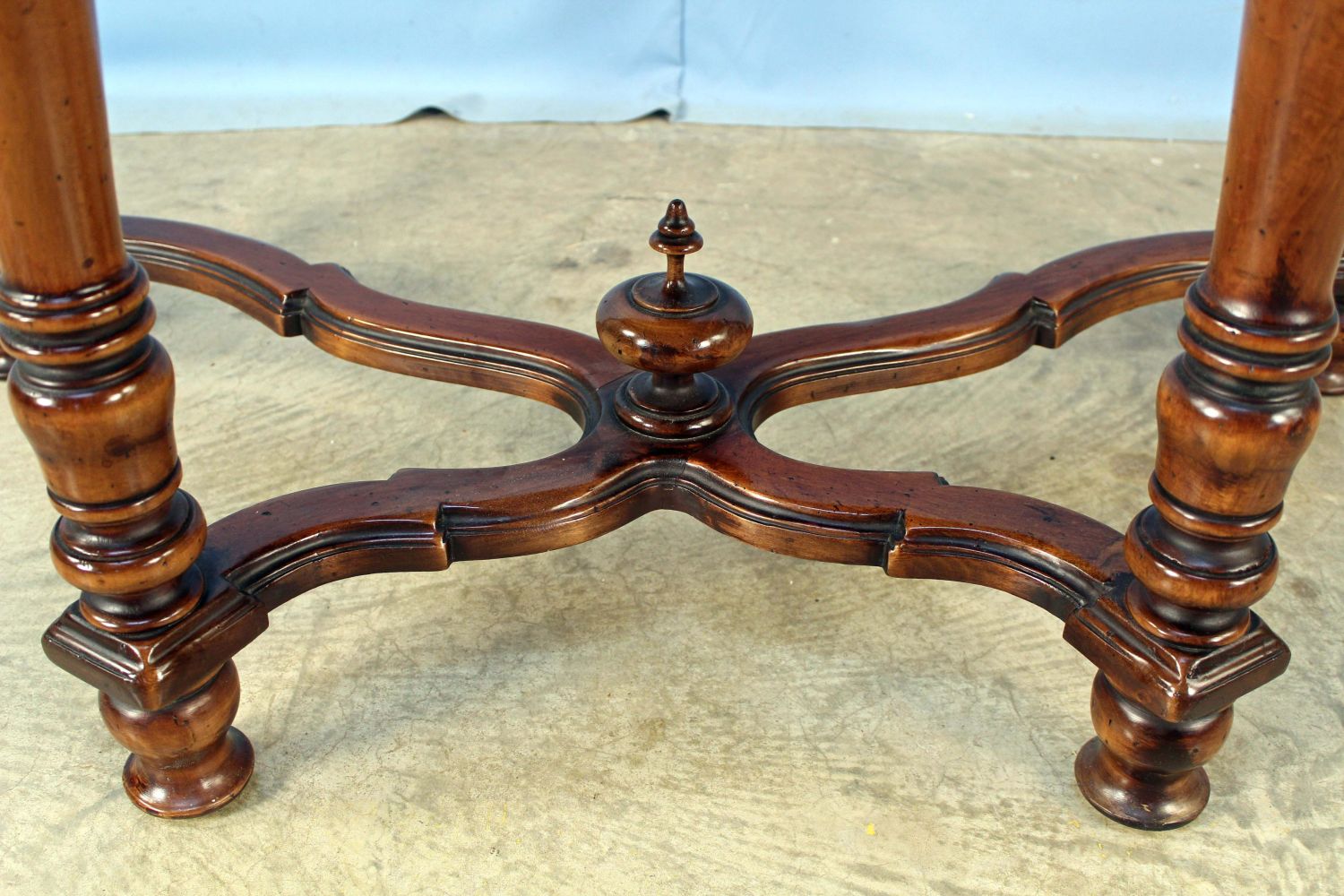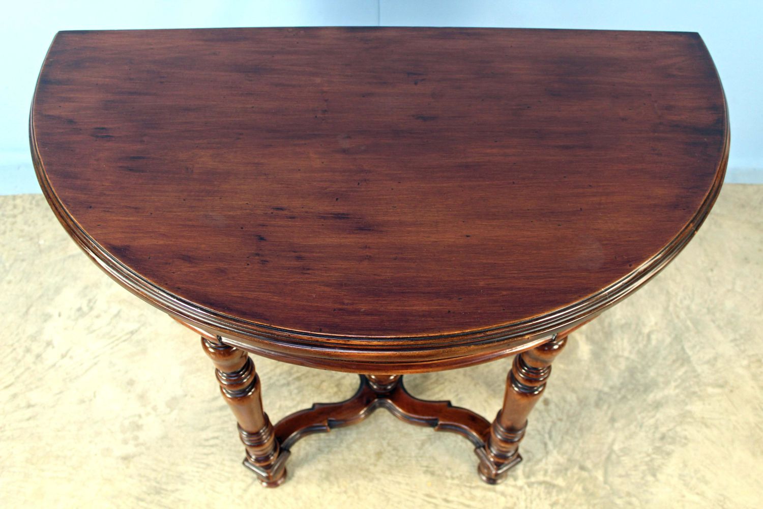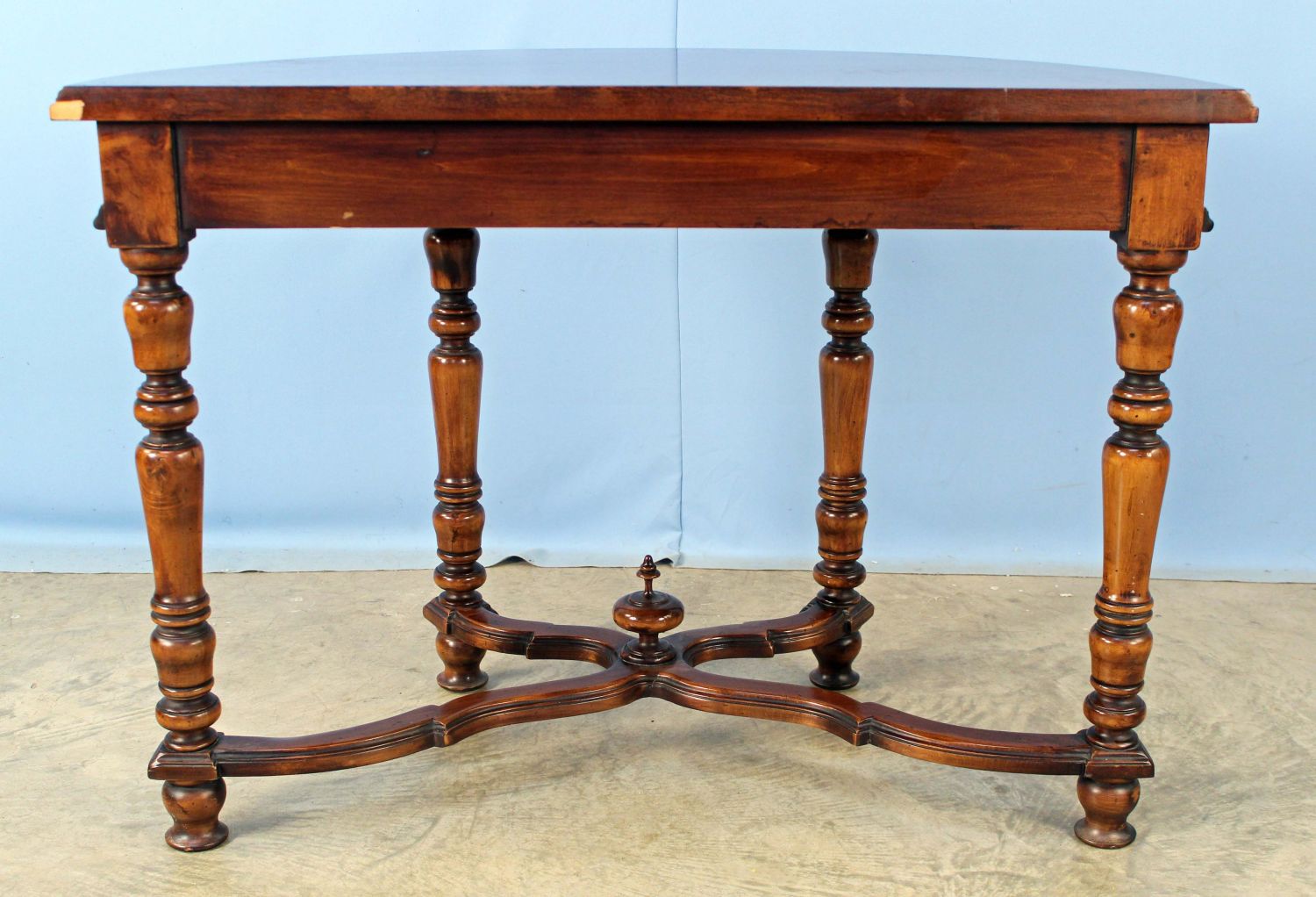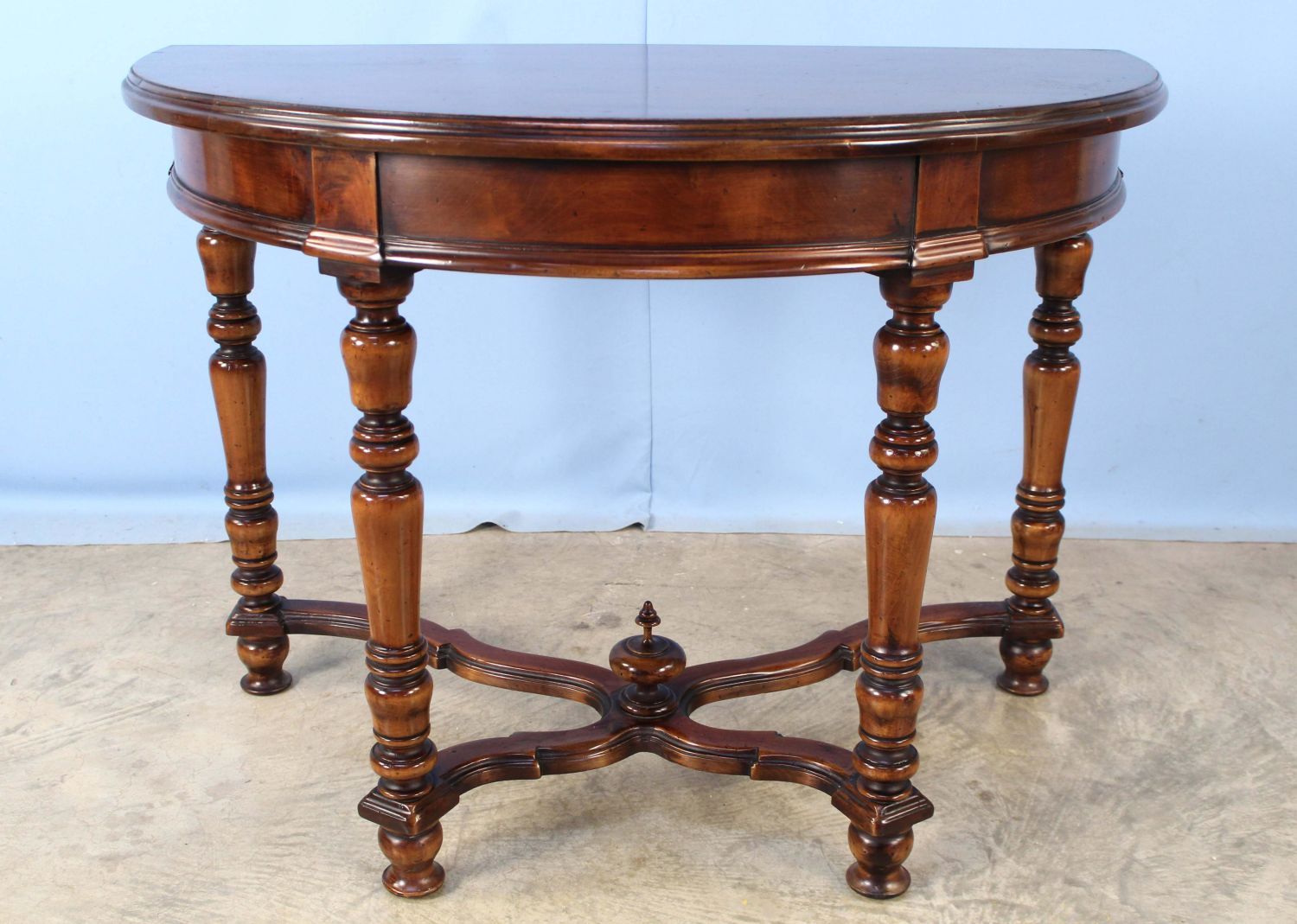 Demilune Console Table with Walnut Finish. Measures 30 1/4" high x 42" wide x 23" deep. Condition- Table is in overall good condition. Stretcher has been broken and repaired. See photos.
