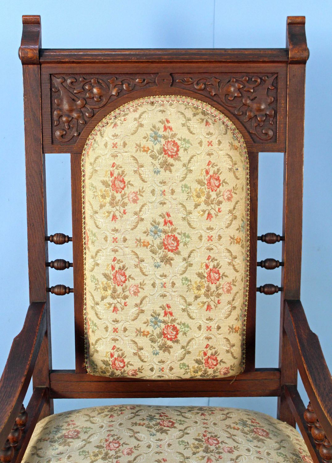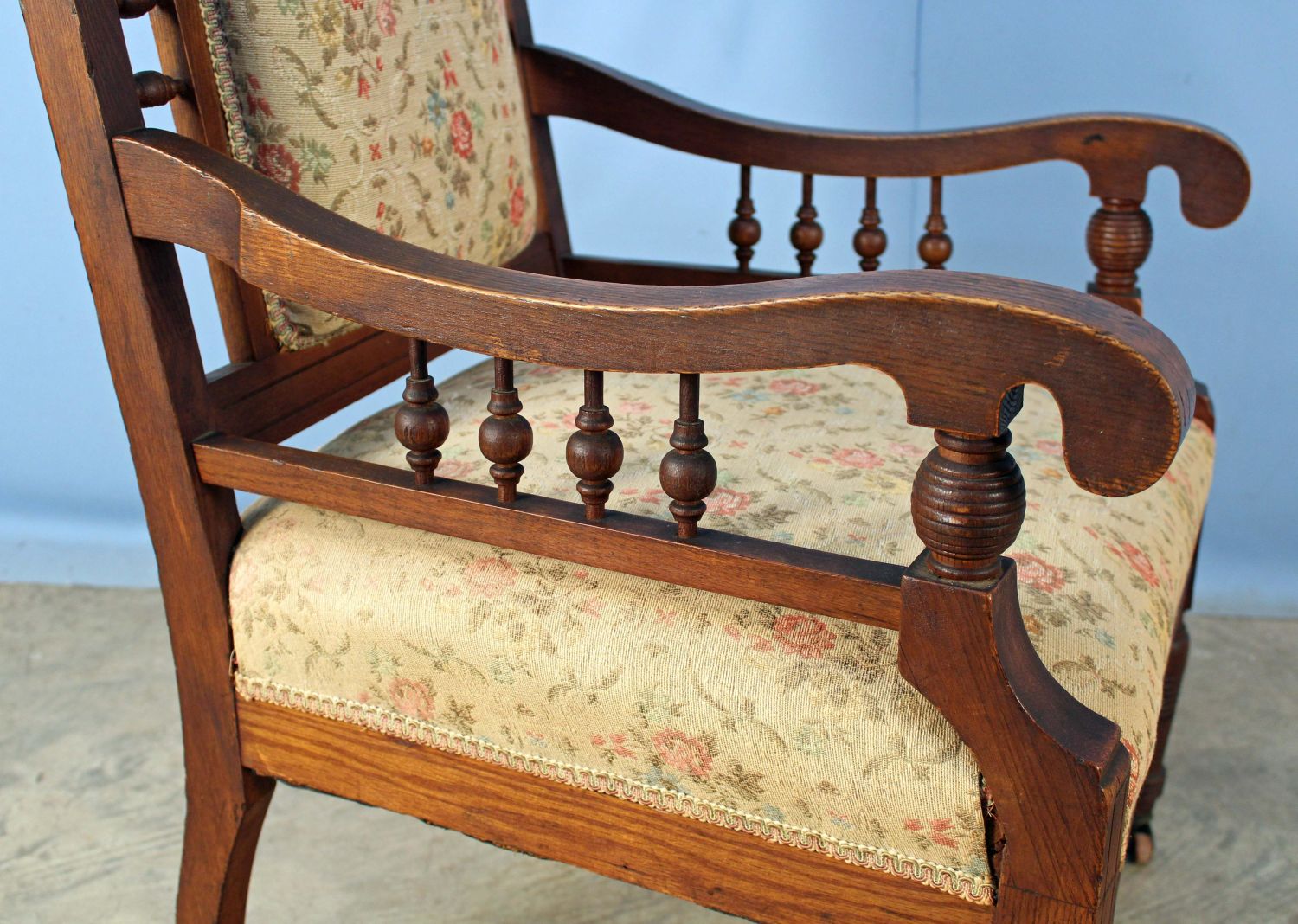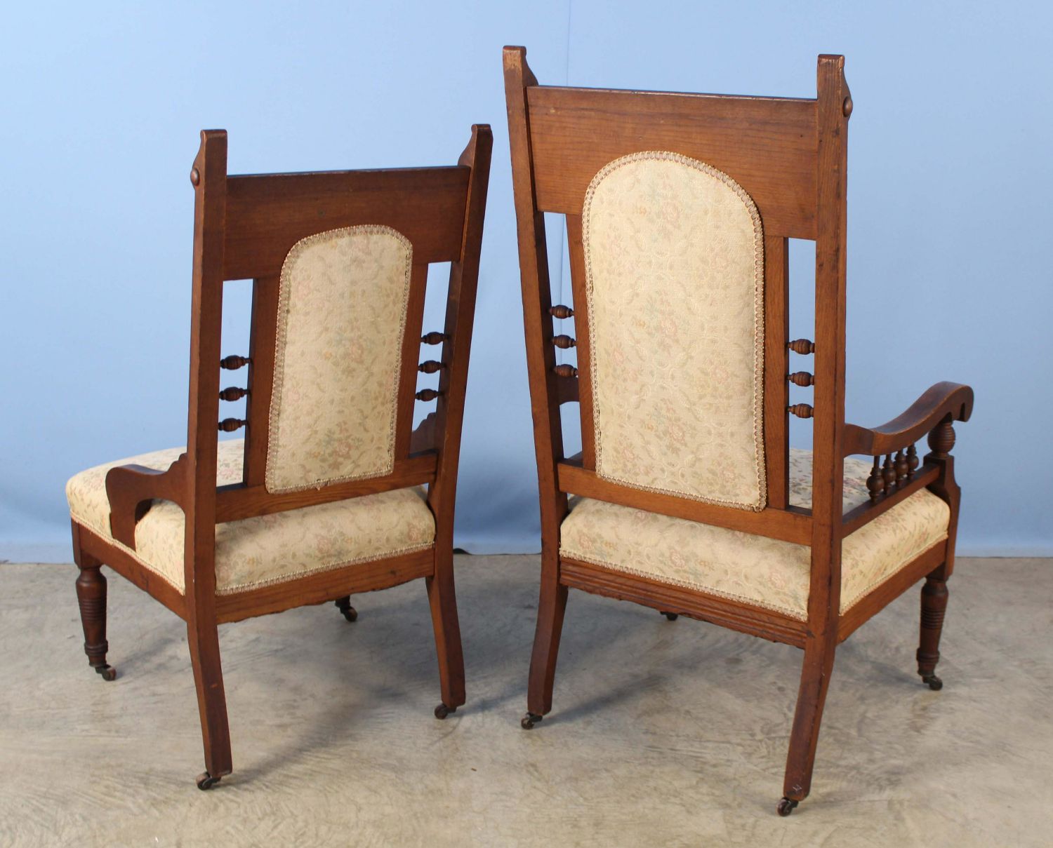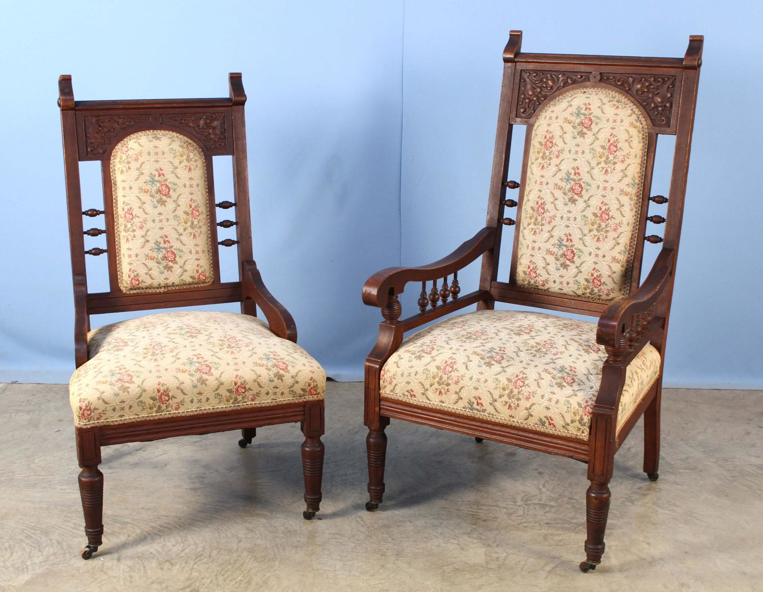 Pair of His and Hers Oak Parlor Chairs Circa 1900. The His chair measures 45 1/2" high x 23 3/4" wide x 27" deep. The Lady’s chair measures 40 3/4" high x 20 1/4" wide x 24" deep. Condition- Chairs are in overall good condition. Lady’s chair does have a chip on top post. See photos.