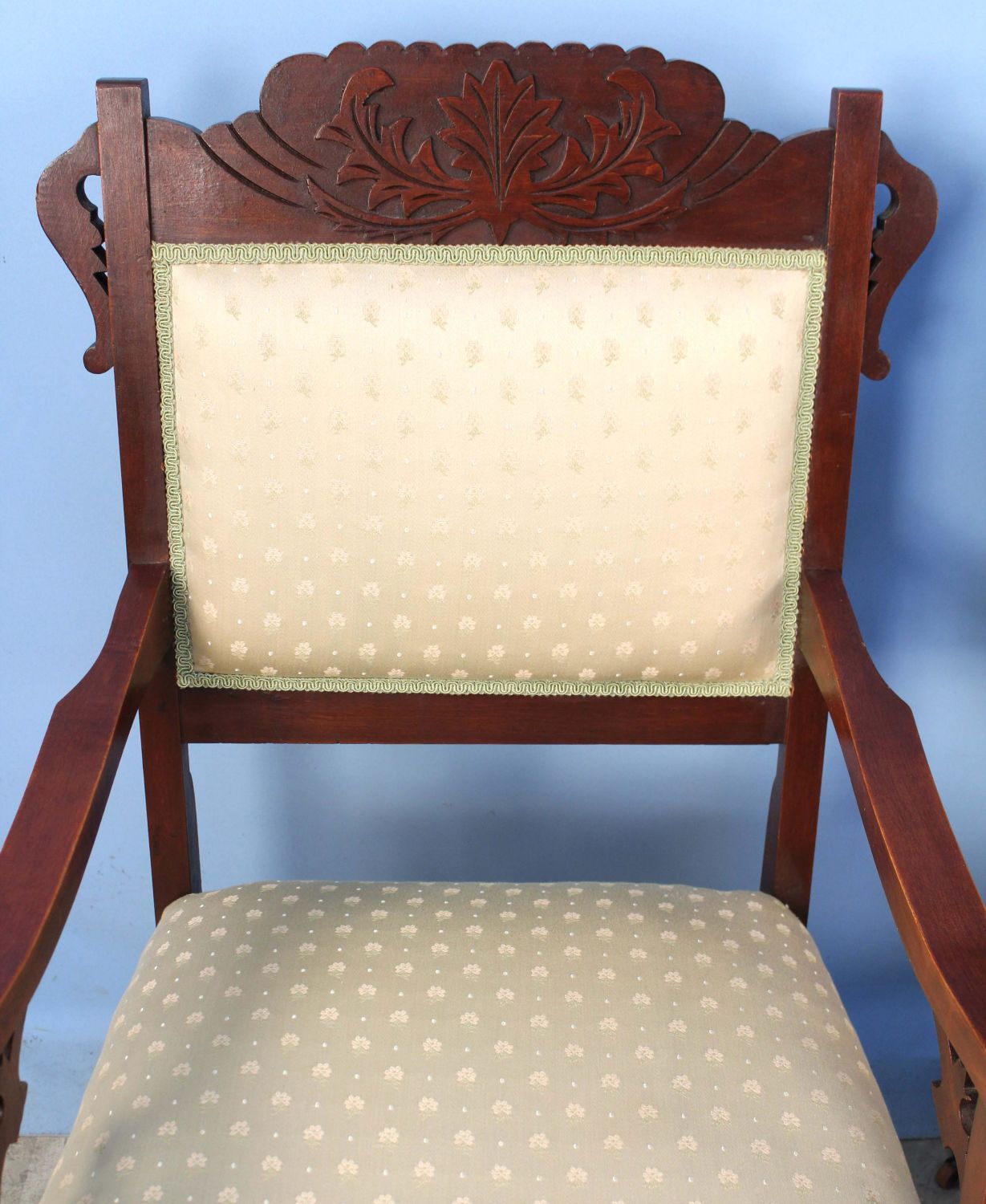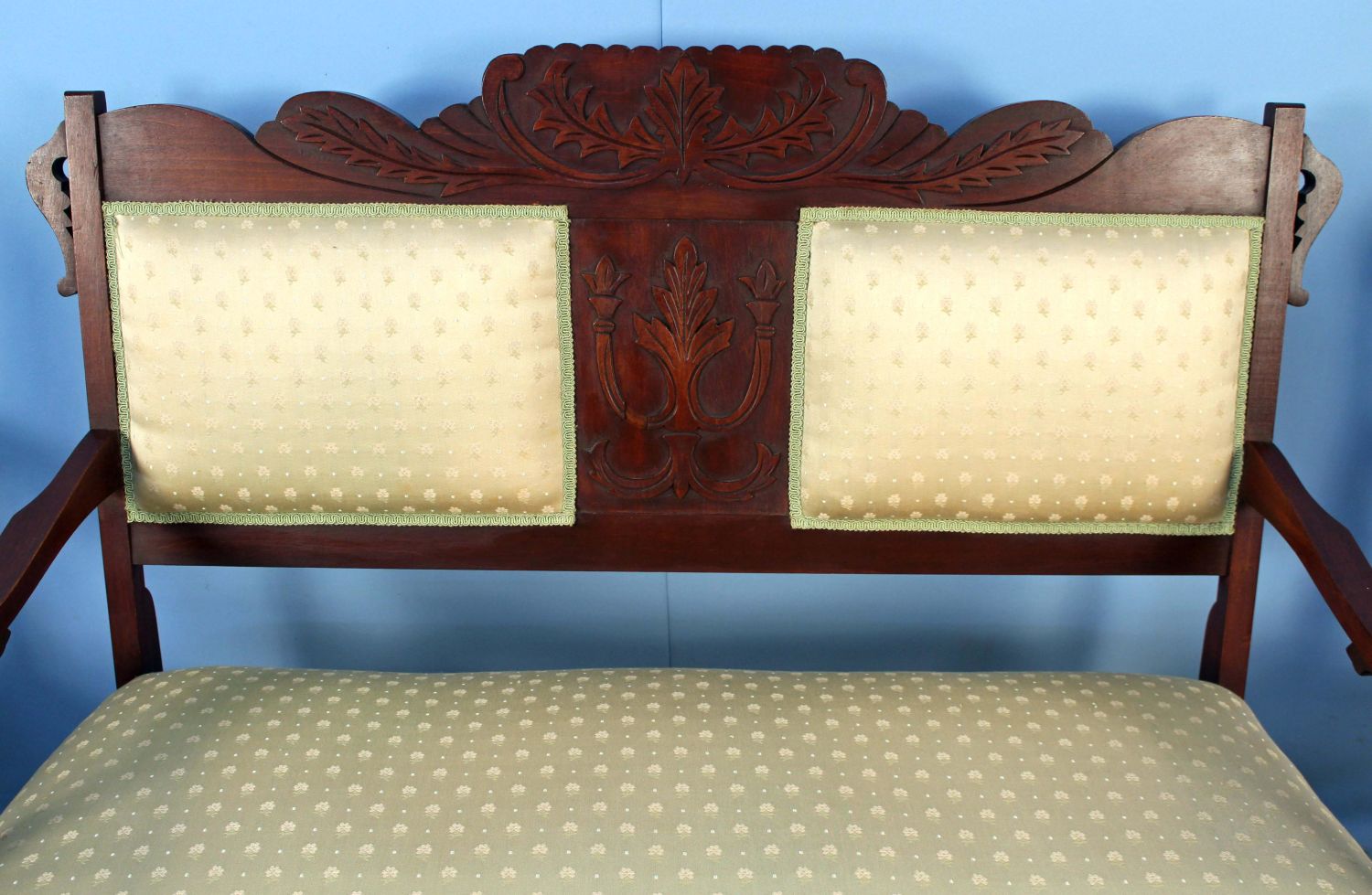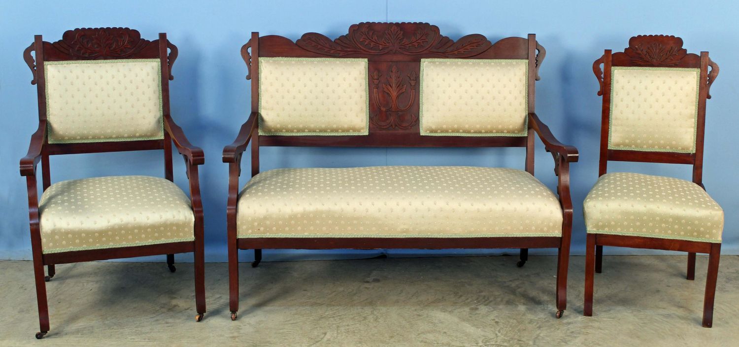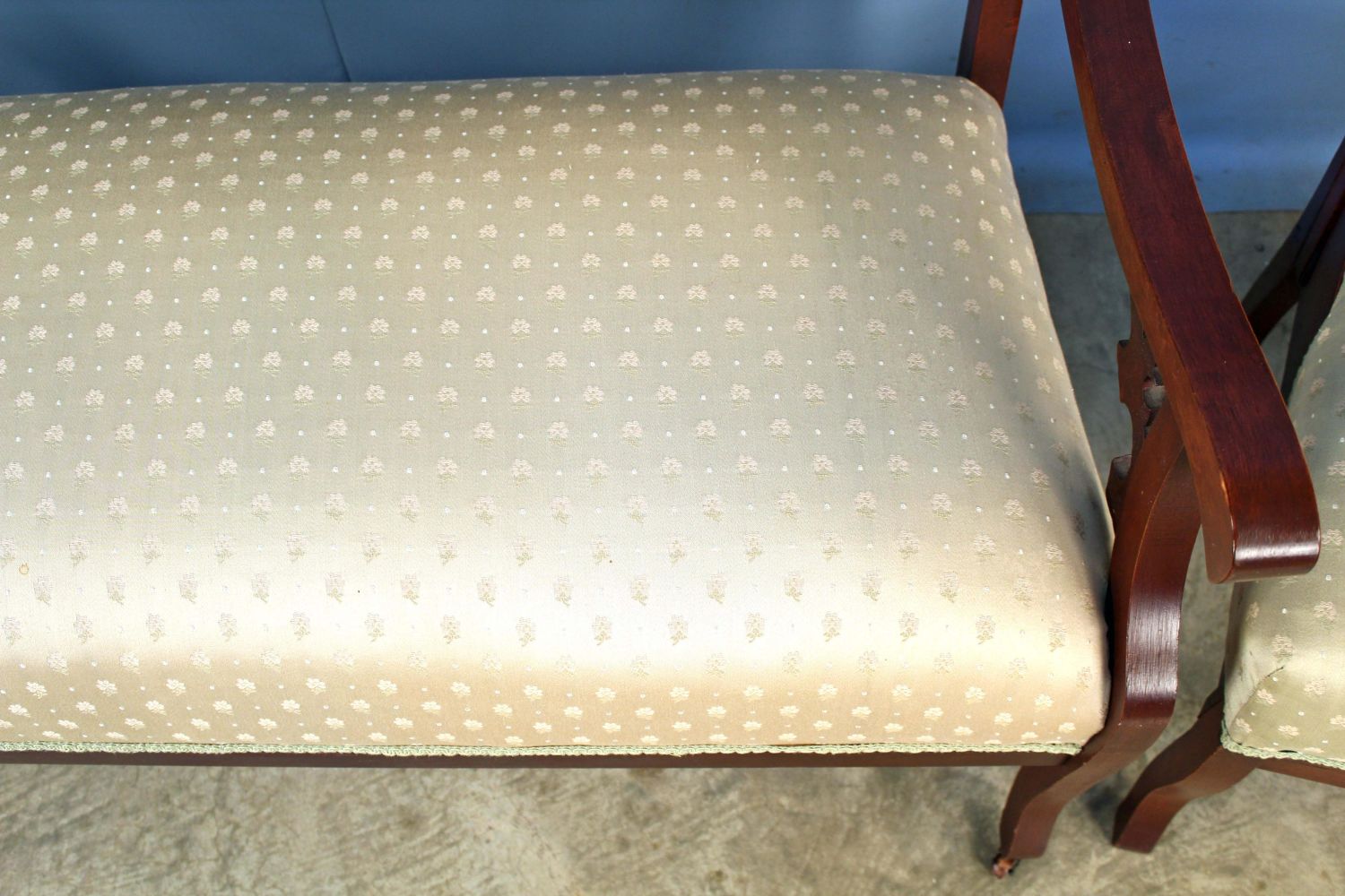 Three Piece Parlor Suite. (1) Settee measures 37 3/4" high x 48" long. (1) Armchair measures 37 1/2" high x 23 1/4" wide. Condition- Suite is in overall good condition. See photos.