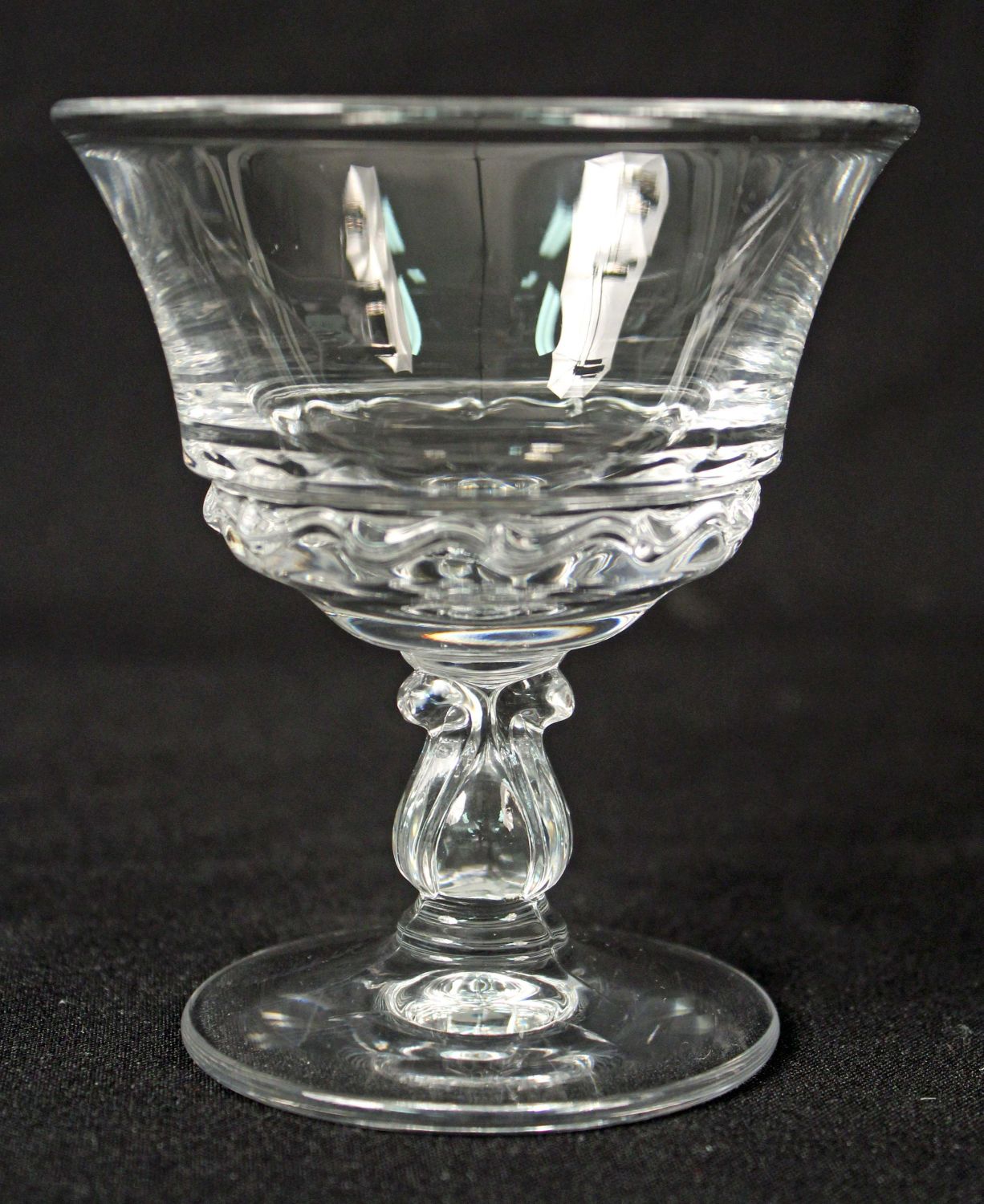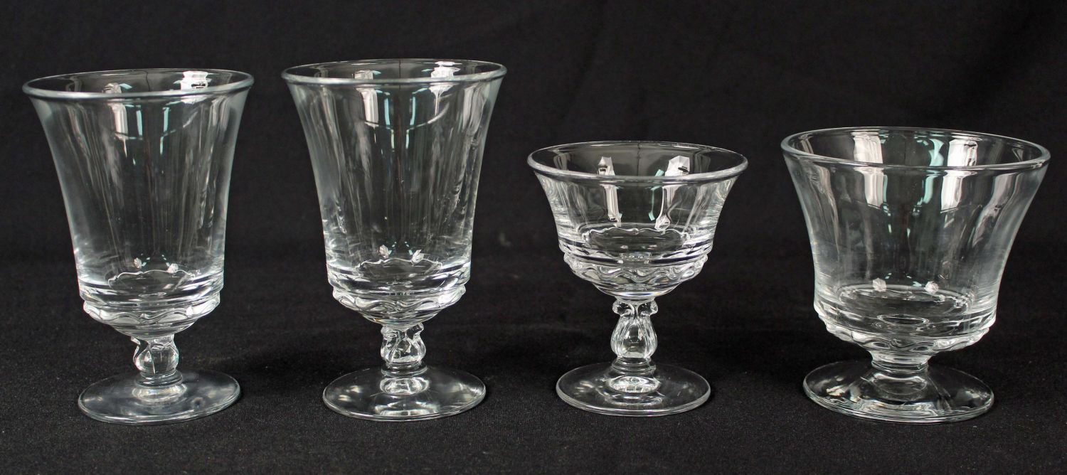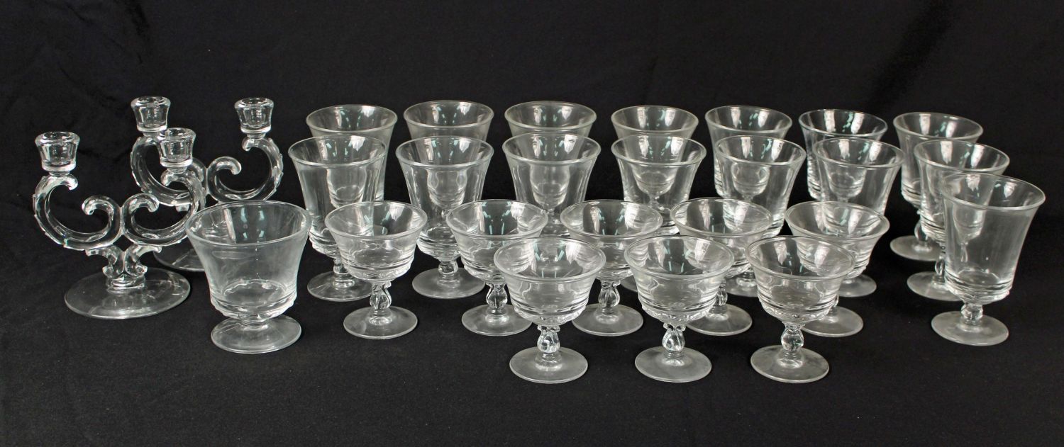 26 Pieces of Fostoria Century Glassware. (7) Water goblet. Measure 6" high. (8) 5 7/8" iced tea. (8) 4 3/8" champagne/tall sherbet. (2) Double light candlesticks, 6 7/8" high. (1) 4 7/8" high candy jar (with no lid). Condition- Glassware is in good condition. See photos.