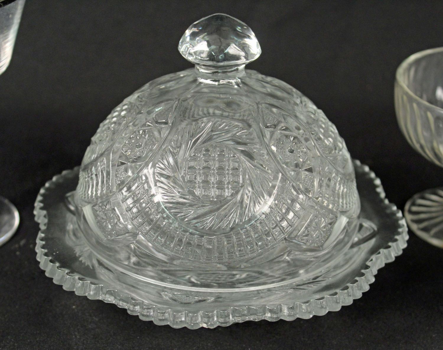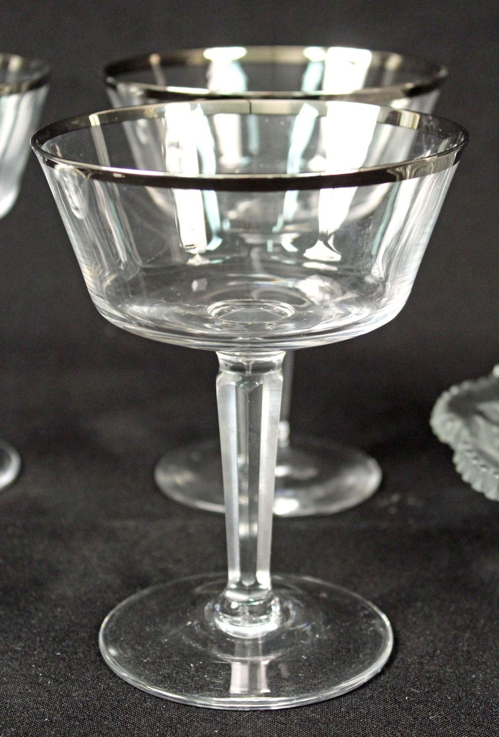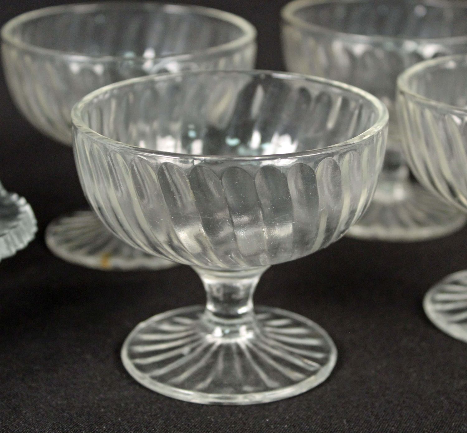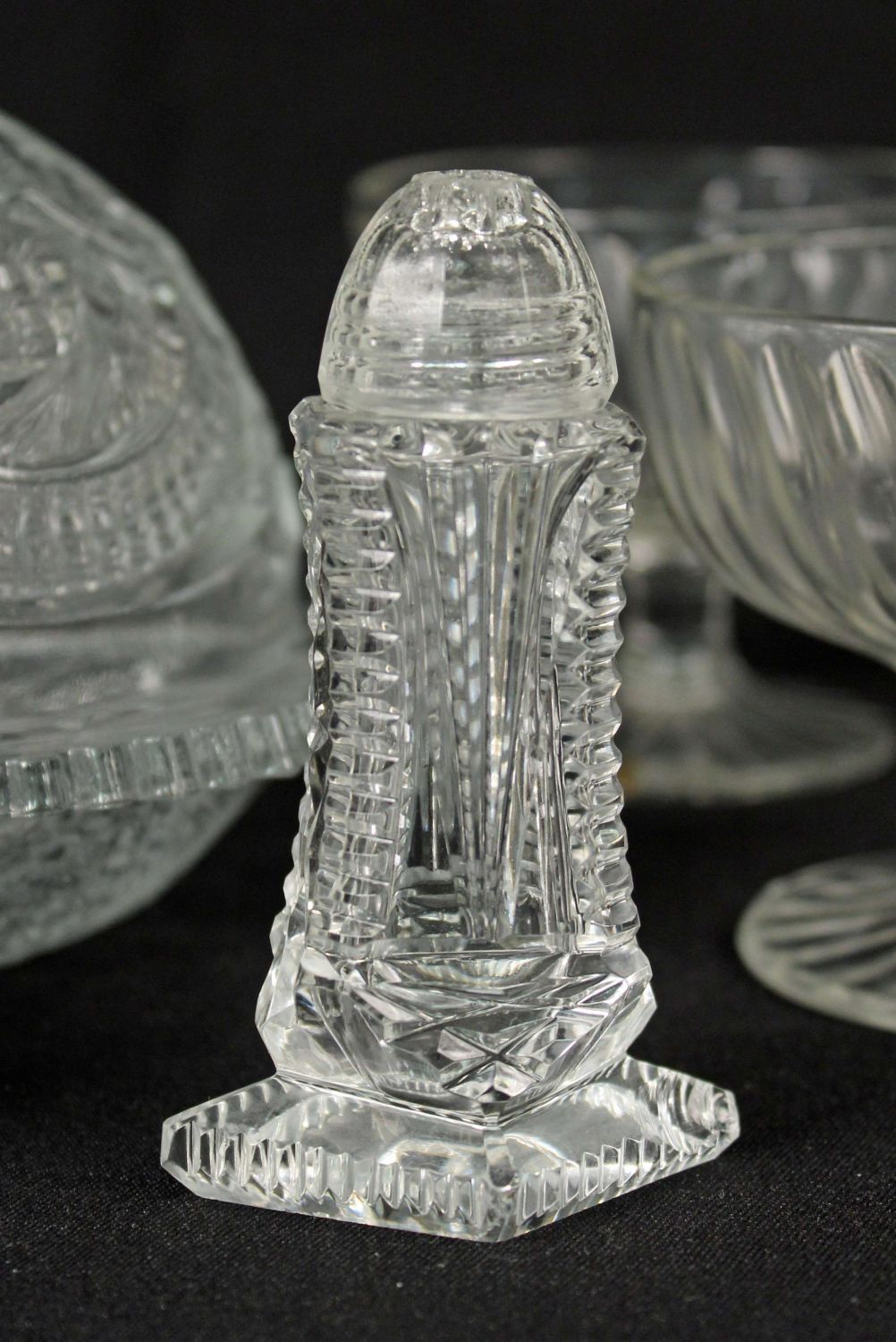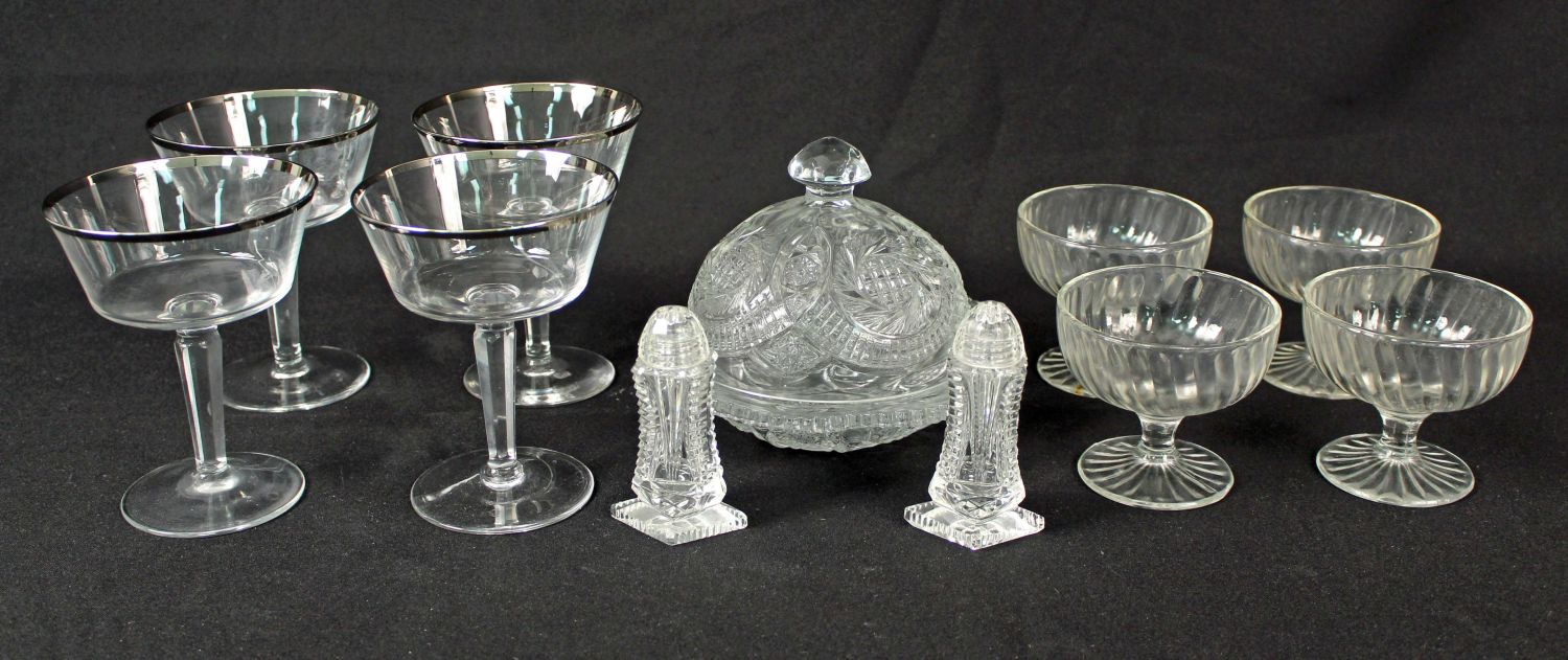Group of Glassware Lenox, Anchor Hocking, Etc. (4) Lenox Solitaire Champagne/Tall Sherbet. Measure 5 1/8" high. (4) Anchor Hocking swirl pattern footed sherbet. Measure 3 1/8" high. (1) EAPG pinwheel pattern butter dish. (2) A pair of leaded crystal salt and pepper shakers. Condition- All items are in good condition with the exception of one shaker. One shaker has a large chip at base. See photos.