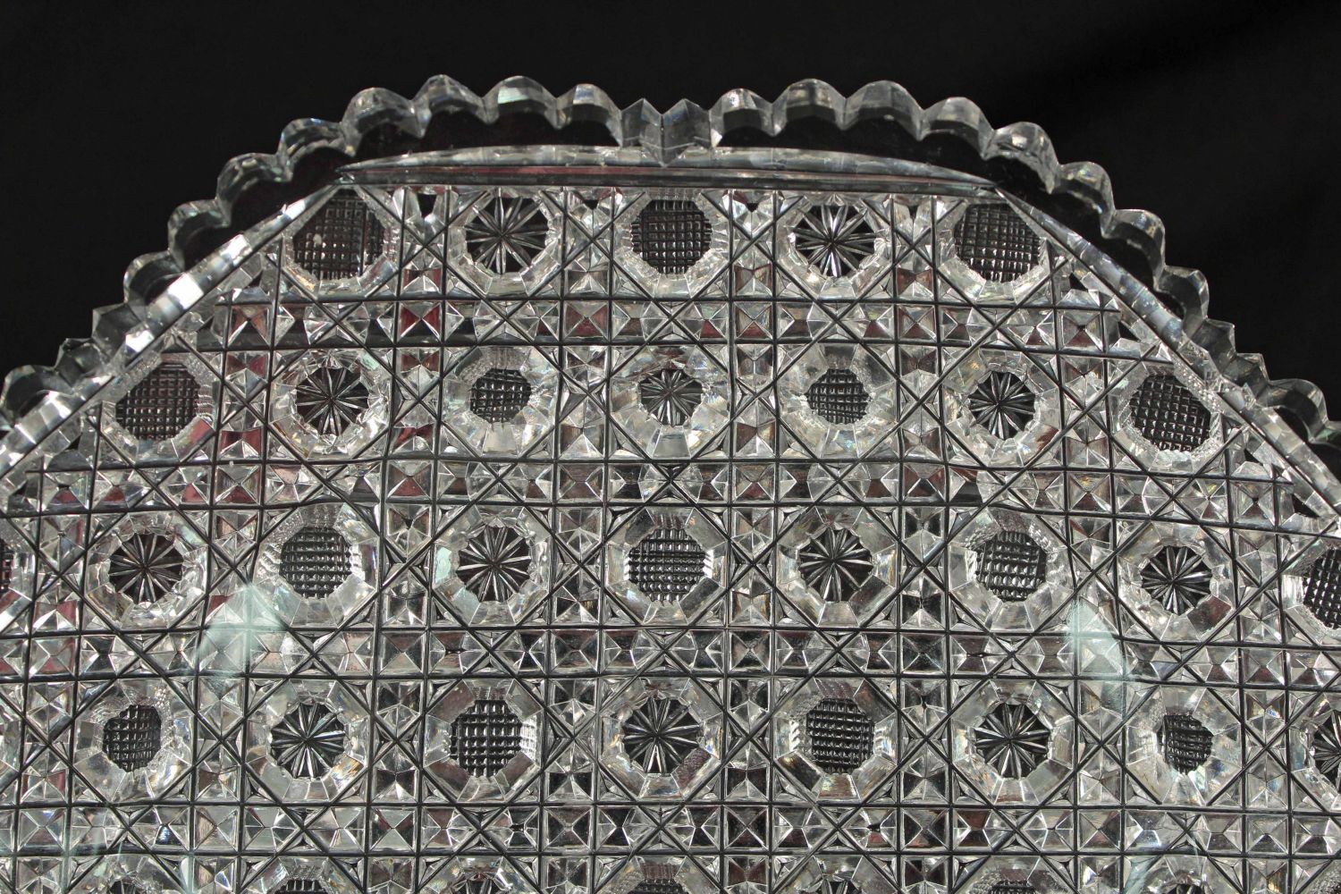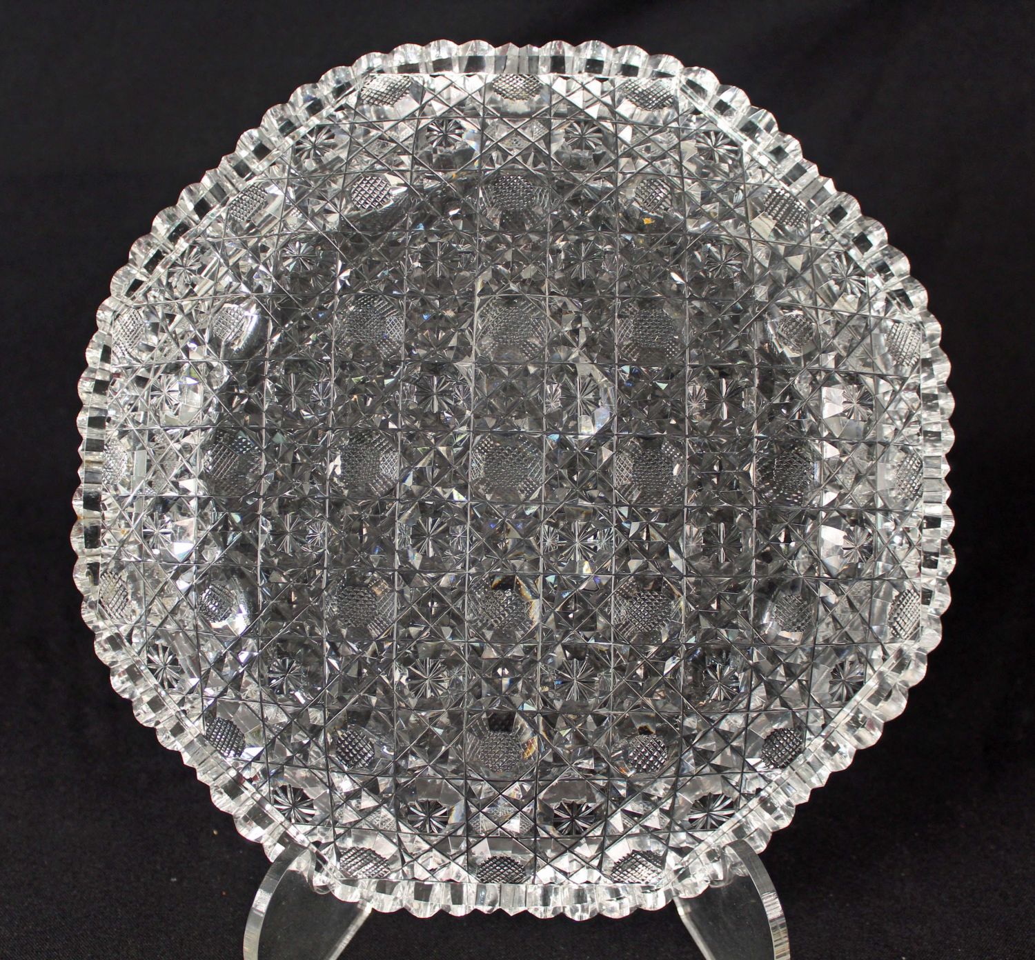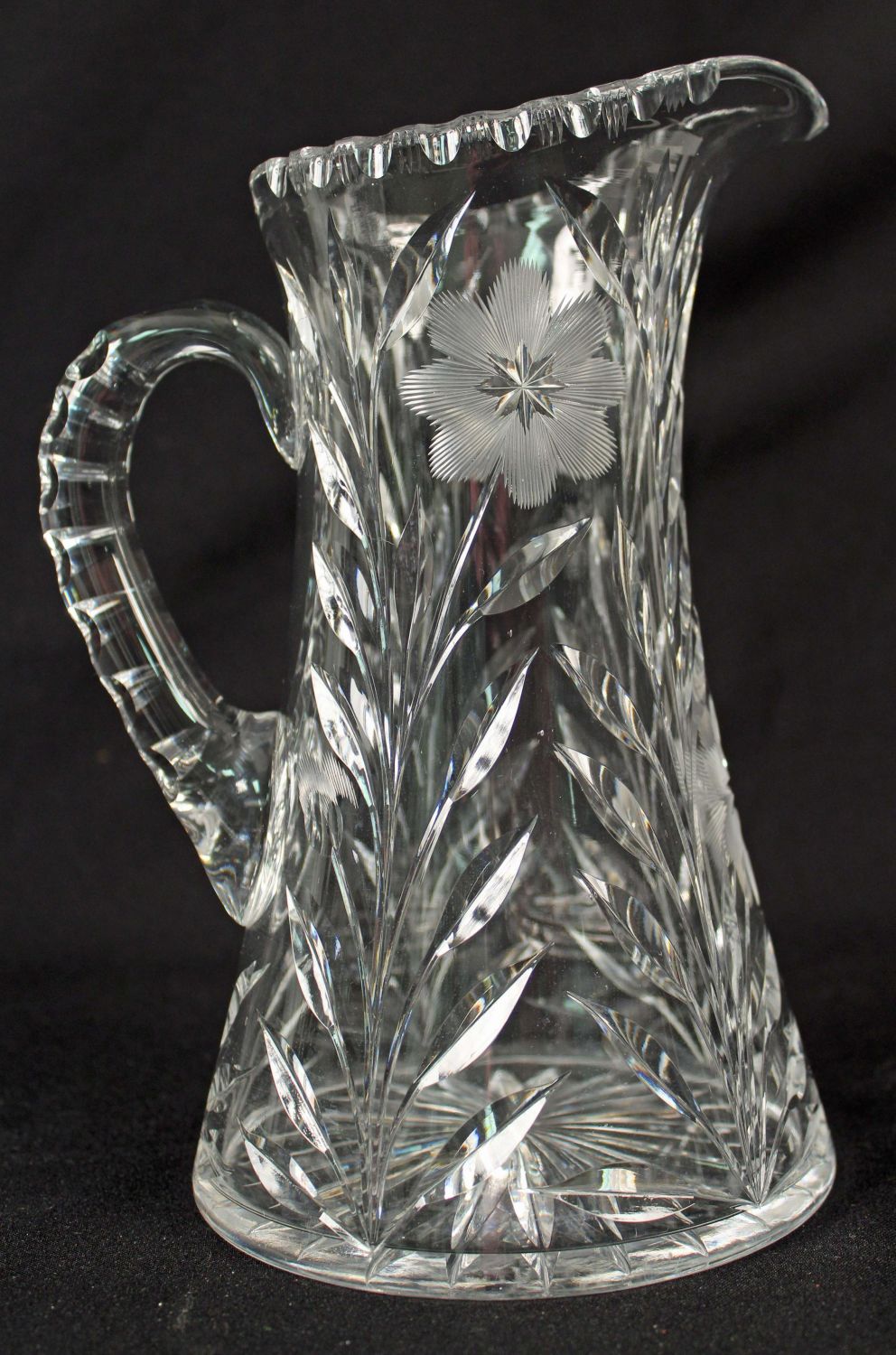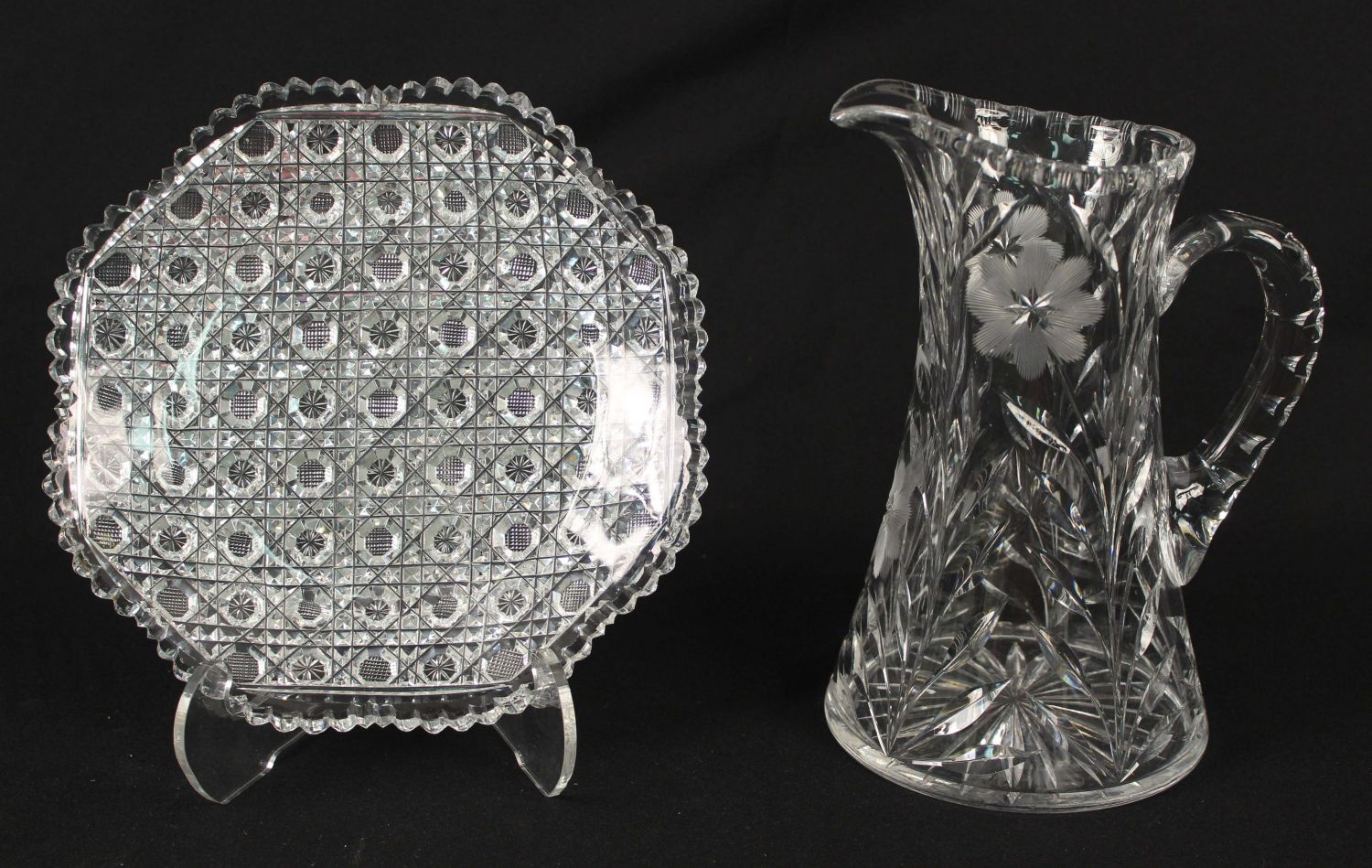 ABCG 9" Cut Glass Plate and Cut Glass Pitcher. (1) American Brilliant Period 9" Cut Glass Plate. (1) 9 1/4" cut glass pitcher. Condition – No chips or cracks. The plate does have two extremely small inter rim nicks. The pitcher is in good condition, no chips or cracks.