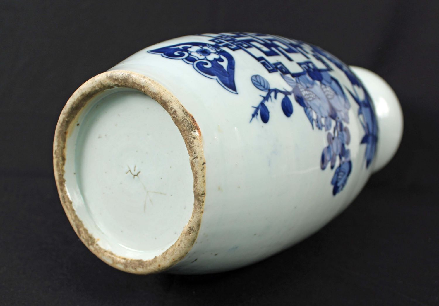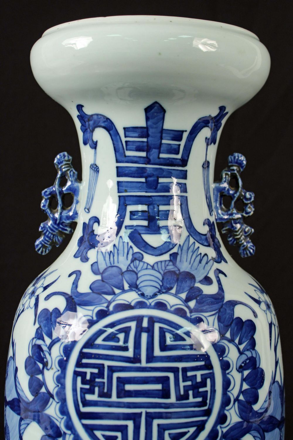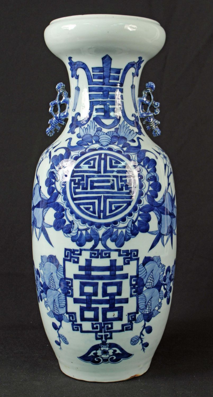 Chinese Blue and White Porcelain Double Happiness Vase. The vase is late 19th or early 20th Century and measures approx. 23" high. Condition- The vase is in good condition with signs of wear commensurate with age. Vase does have a minor hairline crack in glaze at base. See photos.