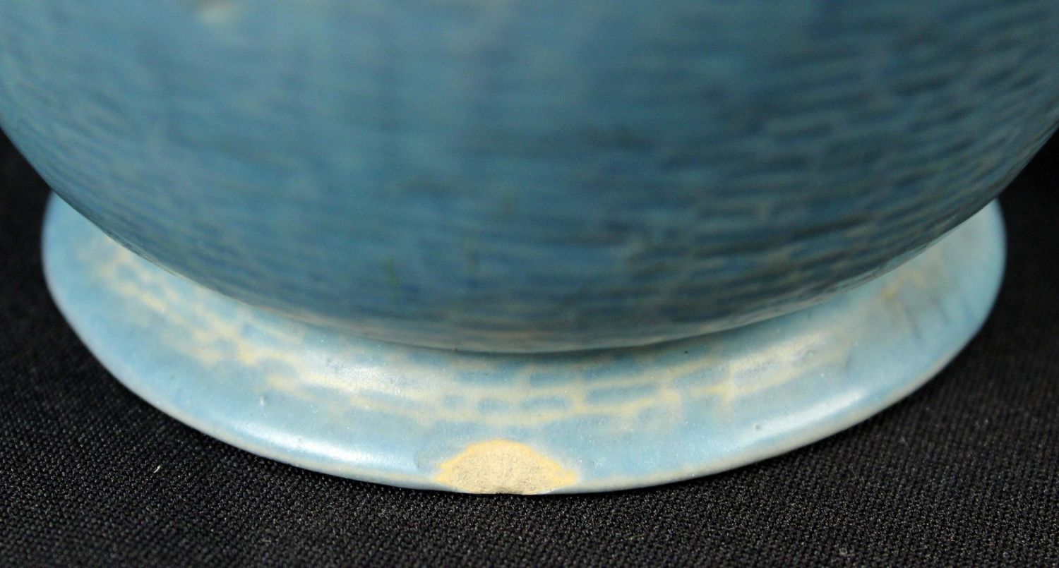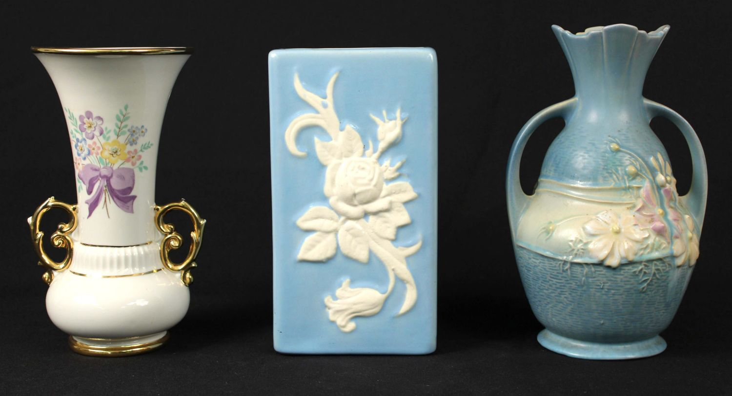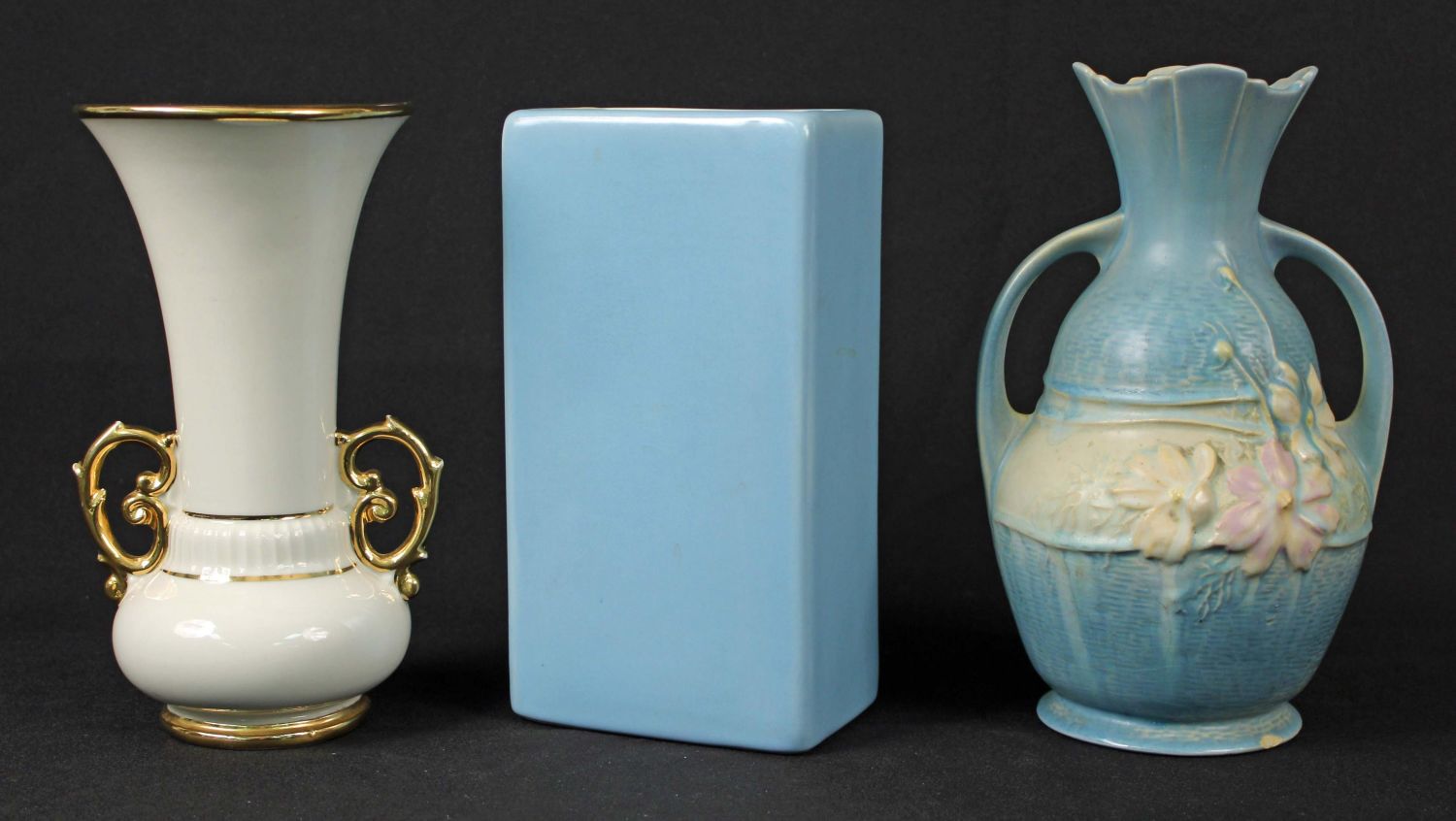 Group of Pottery Vases, Roseville, Weller, Etc. (1) Roseville Cosmos 952-9" blue vase. (1) Abingdon USA vase with flowers and gold trim. Measures 8 3/4" high. (1) Weller Pottery vase light blue cameo rose. The vase is very faintly signed Weller. Measures 8 5/8" high. Condition – Pottery is in overall good condition. The Roseville vase has a small chip at the base. See photos.