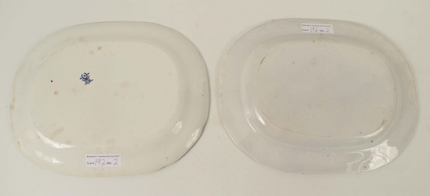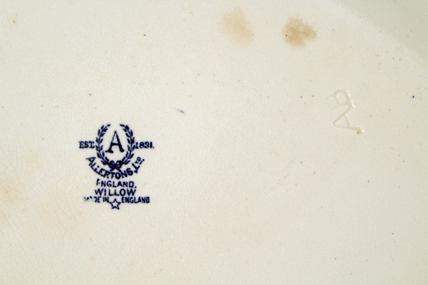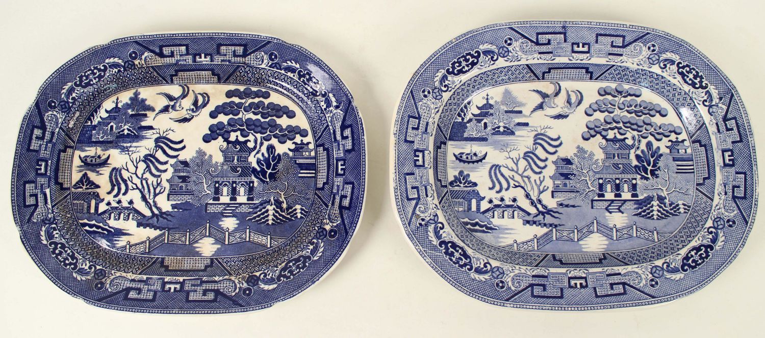 Two Antique English Blue Willow Platters. (1) Platter signed , Allertons Ltd. Measures 12 1/4" x 15 1/2" oval. (1) Unsigned platter. 12 1/2" x 15 3/4" oval. Condition- Unsigned platter has two hairline cracks. The other platter is in good condition. See photos.