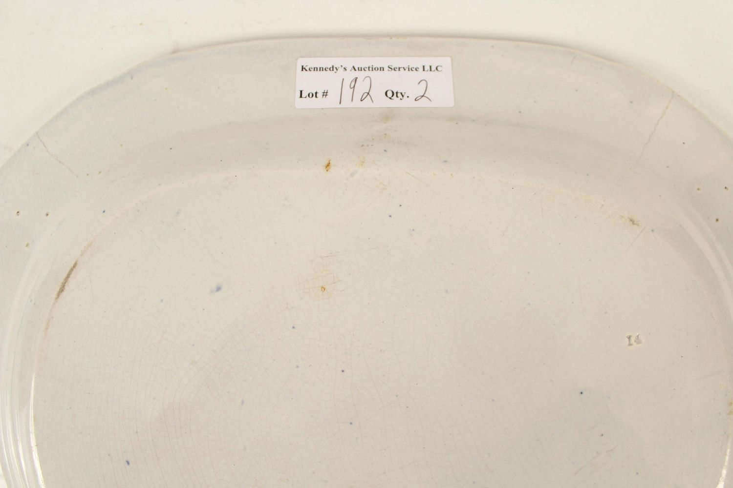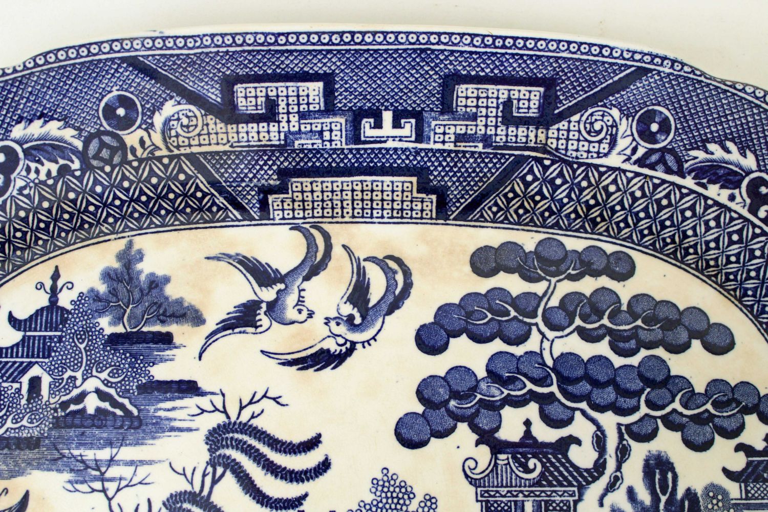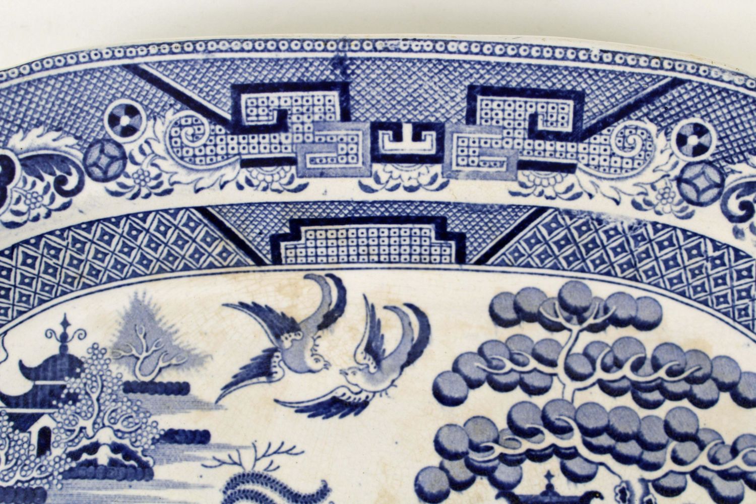 Two Antique English Blue Willow Platters. (1) Platter signed , Allertons Ltd. Measures 12 1/4" x 15 1/2" oval. (1) Unsigned platter. 12 1/2" x 15 3/4" oval. Condition- Unsigned platter has two hairline cracks. The other platter is in good condition. See photos.