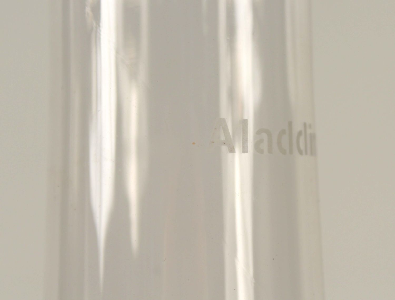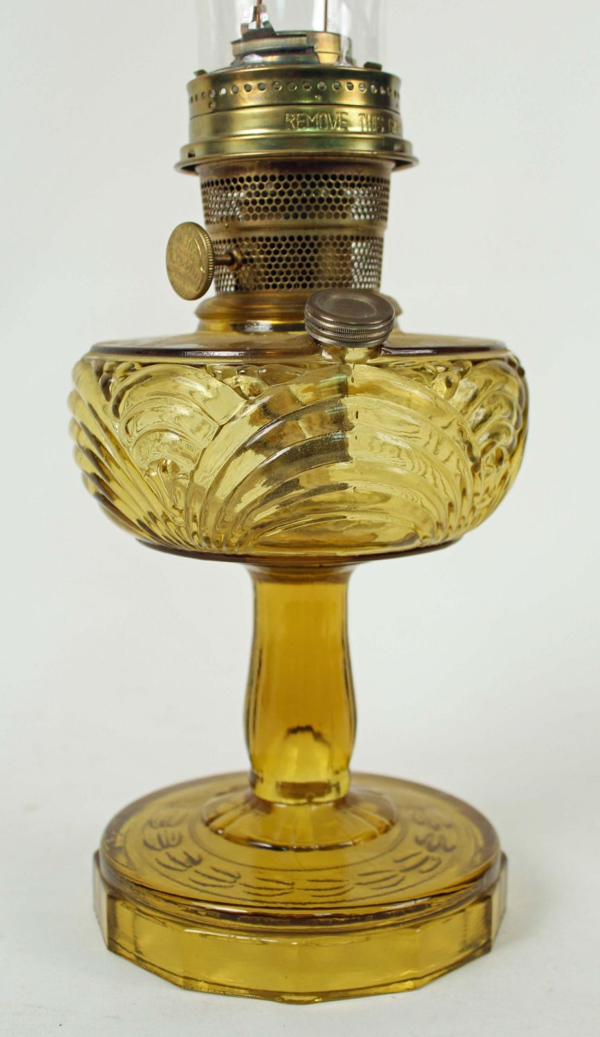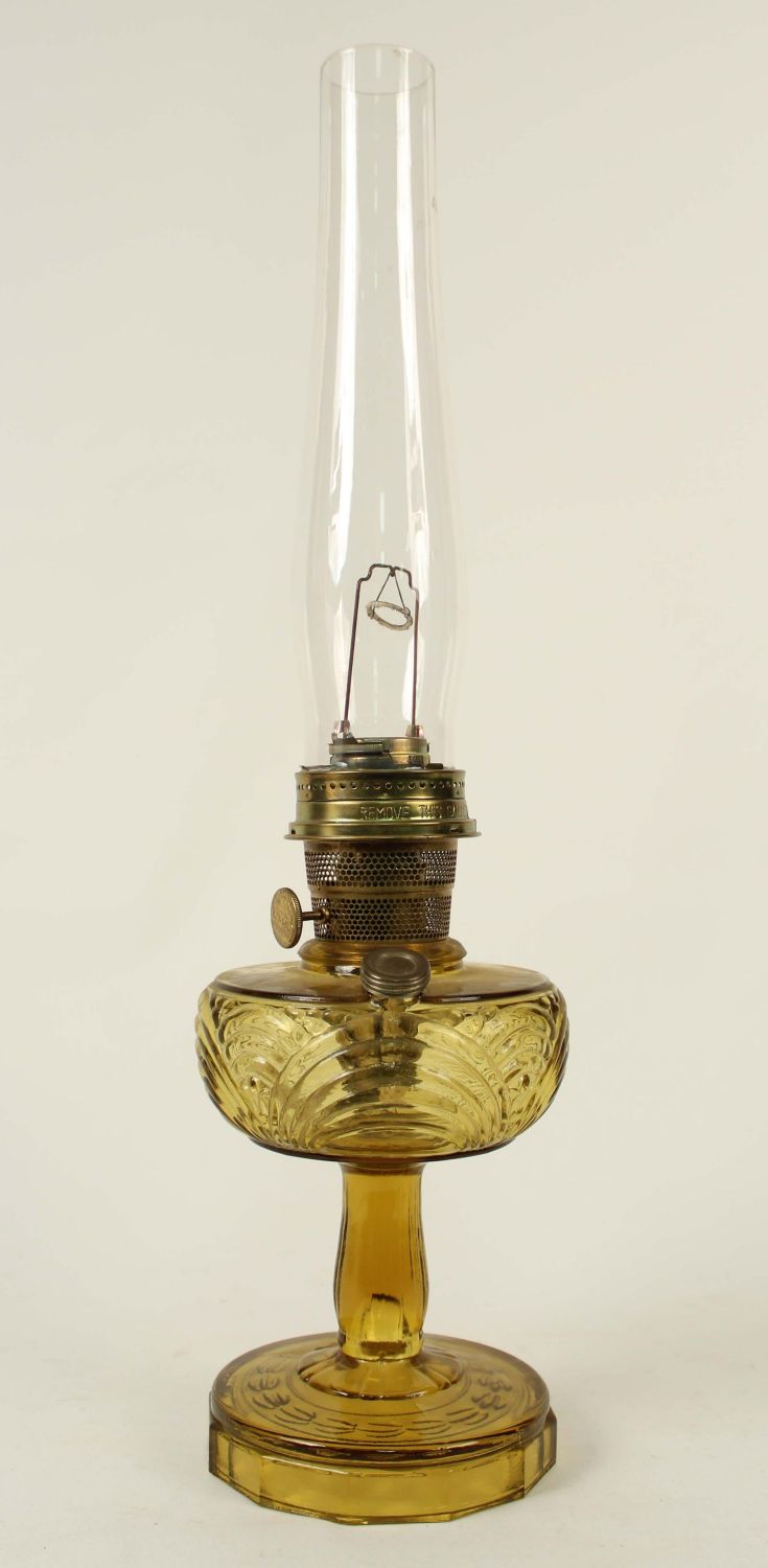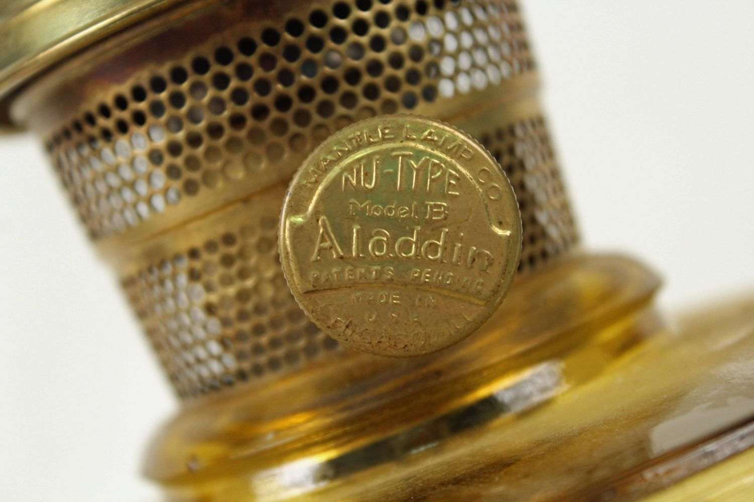 Amber Aladdin Washington Drape Lamp. Measures 24" high to the top of the chimney. The chimney is a lock on style signed Aladdin. Burner is also signed Aladdin. Condition- Lamp is in good condition. Chimney is in good condition. Fitter for chimney is not original and has a crack in the brass. (See photos)