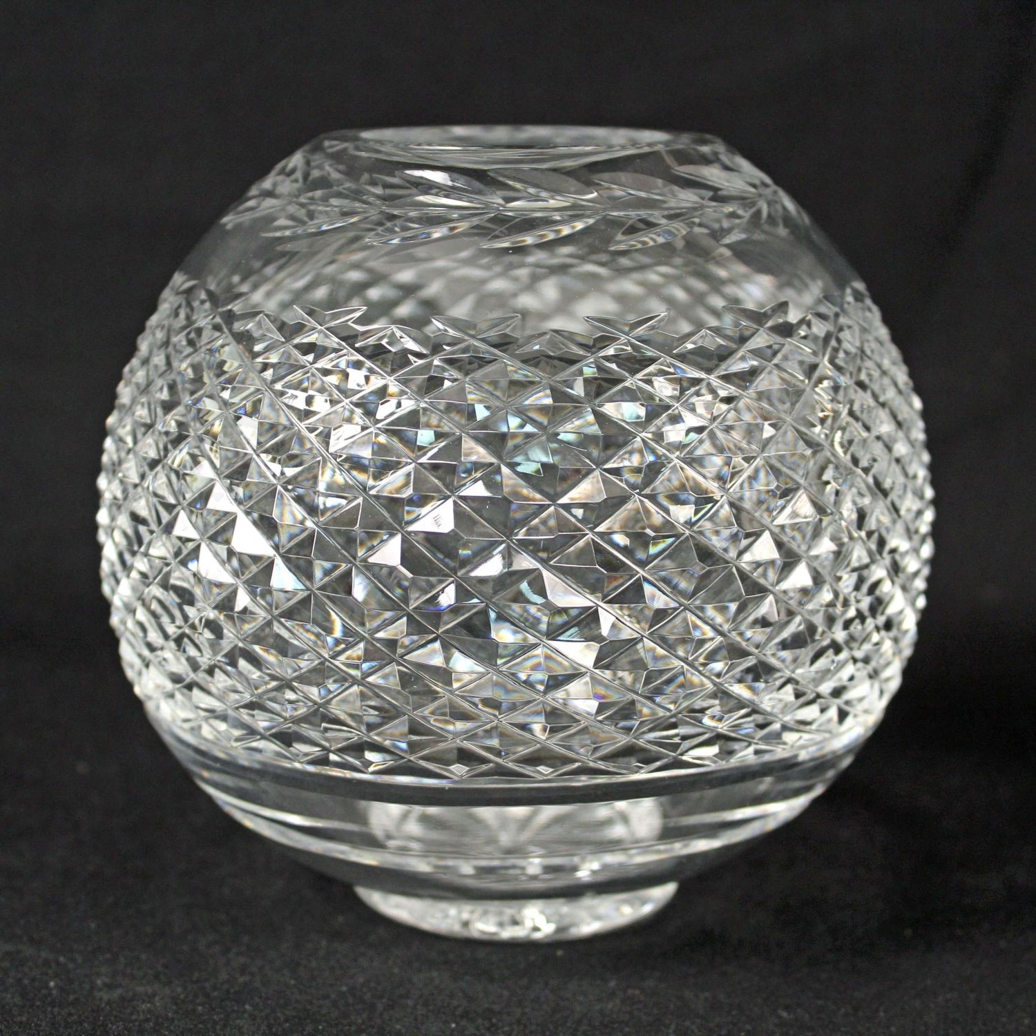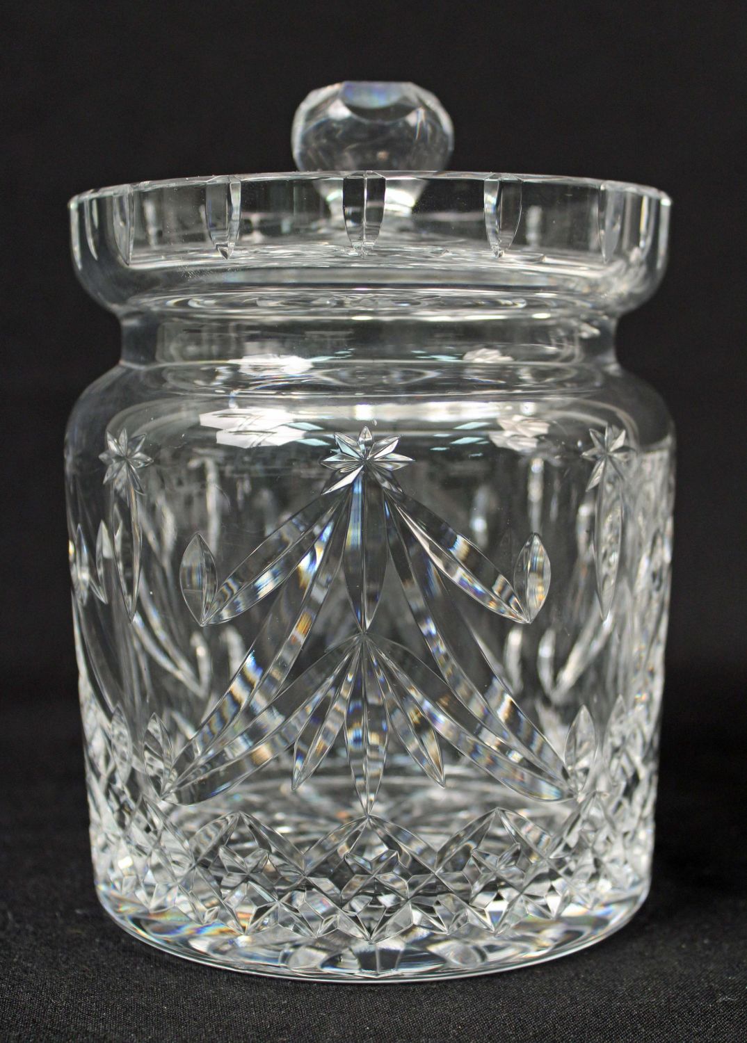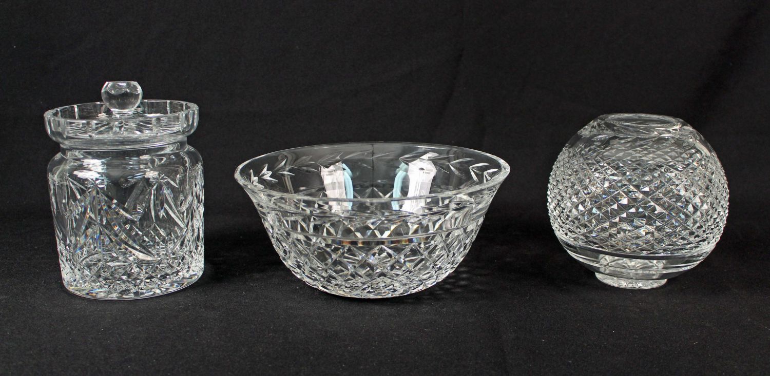Three Pcs. Waterford Crystal w/ Cookie Jar. (1) Glandore rose bowl 5 3/4" High. (1) Glandore heavy crystal fruit bowl 4" High X 9" Dia. (1) Waterford Crystal Christmas Tree biscuit barrel cookie jar. Measures 6" high x 5" dia. Condition- All pieces are in good condition. See photos.