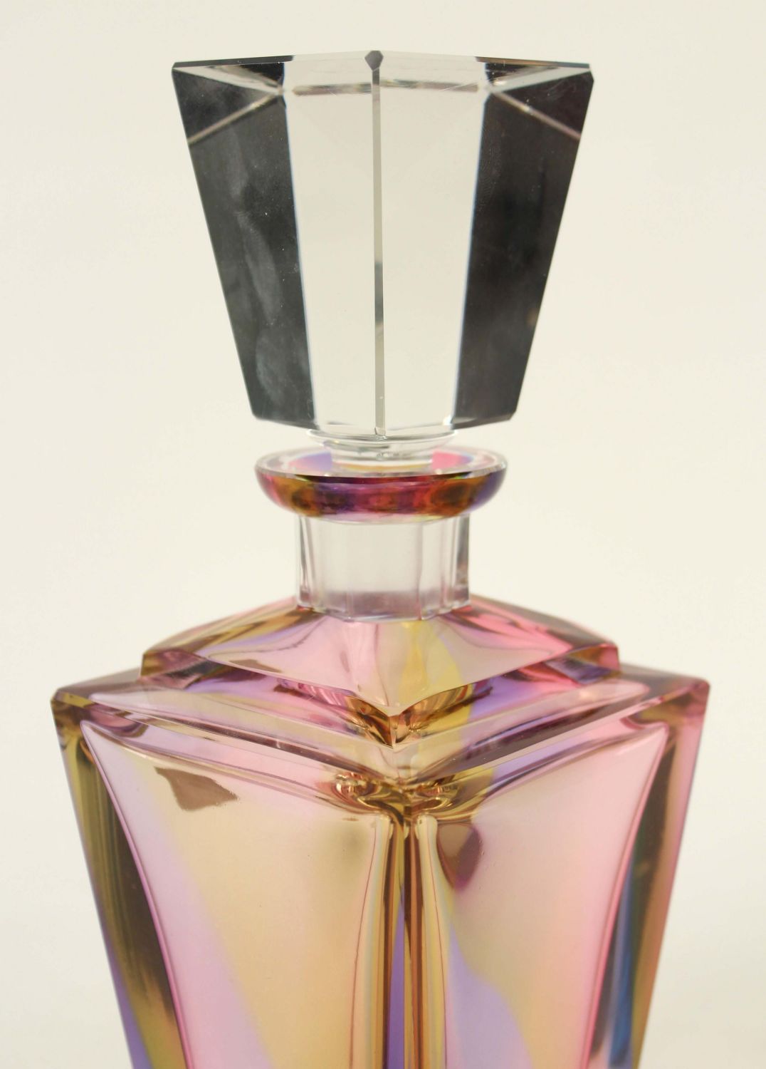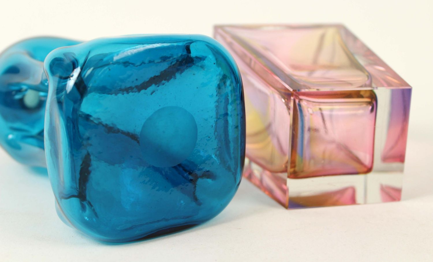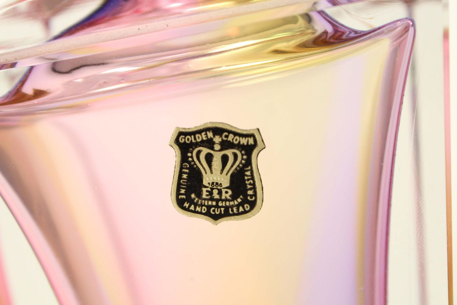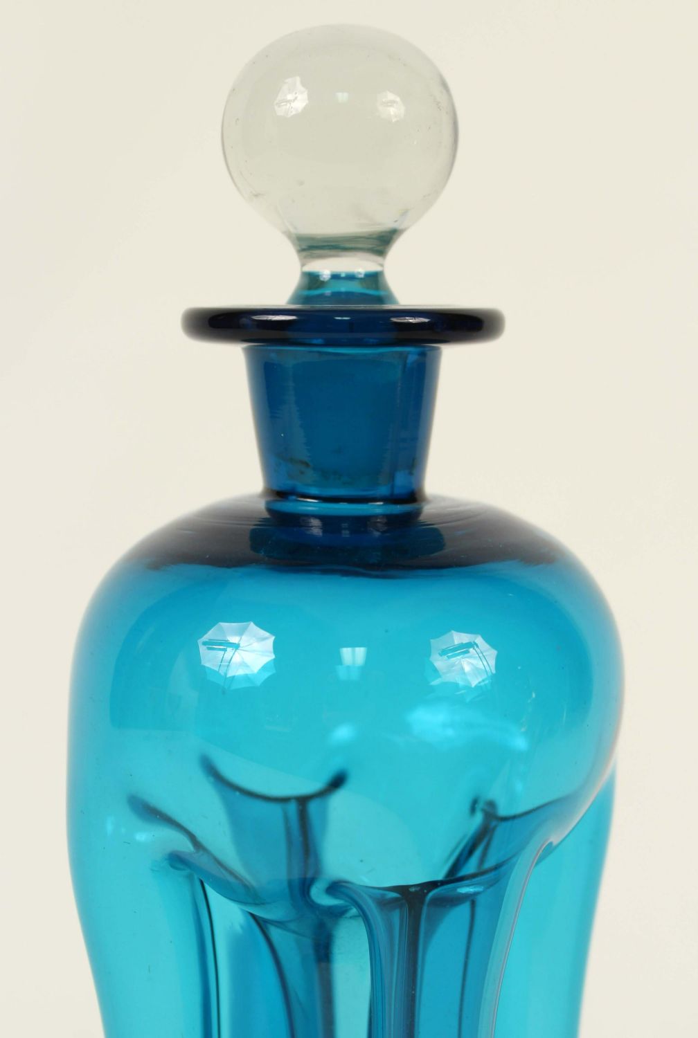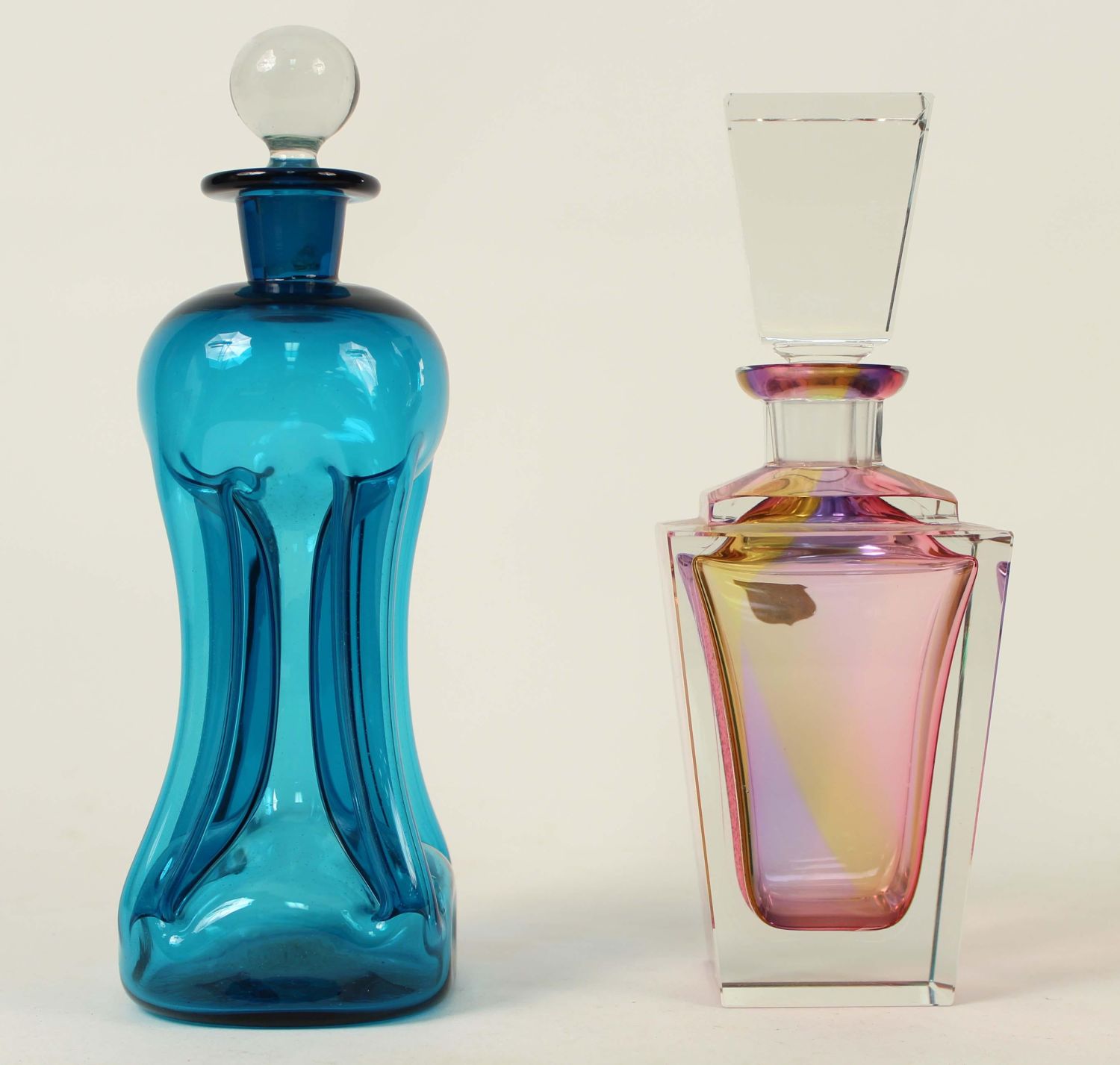 Kastrup Glas "Kluk Kluk" & Golden Crown Decanters. (1) Danish Pre 1965 Kastrup Glas "Kluk Kluk" blue glass decanter by Jacob Bang. Measures 10 3/4" high (with stopper). (1) E&R Golden Crown West Germany leaded crystal perfume bottle. Measures 10" high (with stopper). Condition- Both decanters are in good condition. See photos.