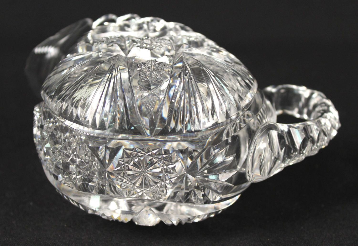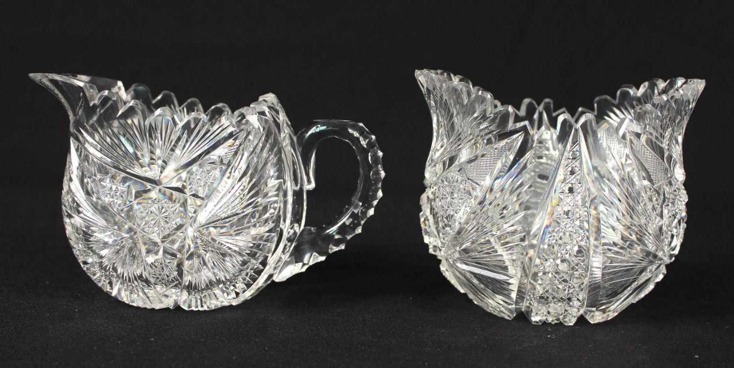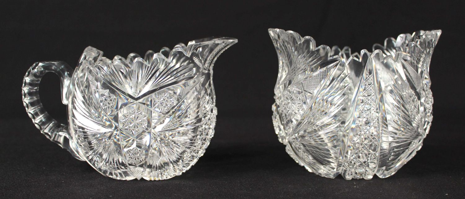 Rare Libbey ABCG Eulalia Shape Creamer and Sugar. (1) Creamer measures 3 3/4" high x 3" x 6 1/8". (1) Sugar measures 4 1/8" high x 3 1/4" x 4 7/8". Condition- The sugar is in good condition and believed to be near perfect. There is nothing on the creamer that we can see that needs to be called. The creamer has some small chips at spout. There is nothing else to call on the creamer. See photos.