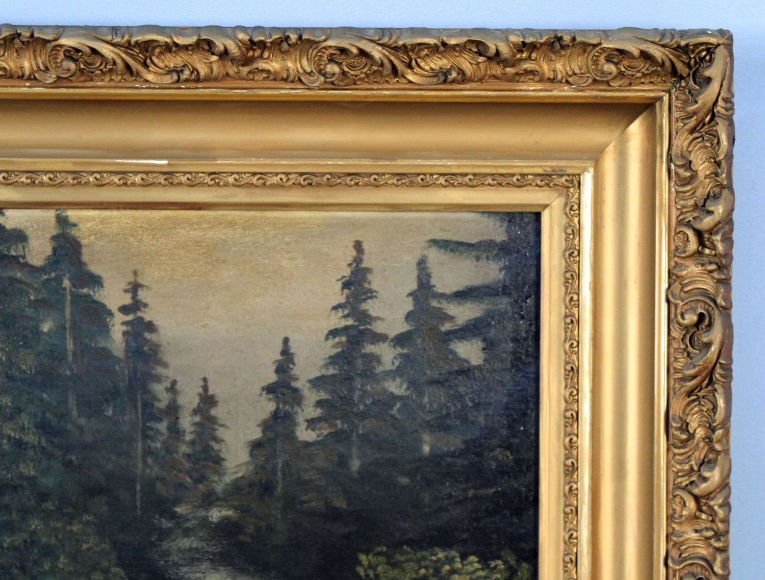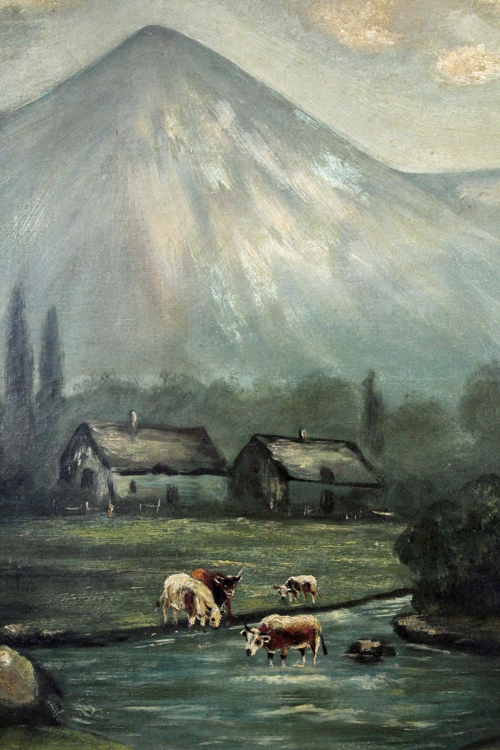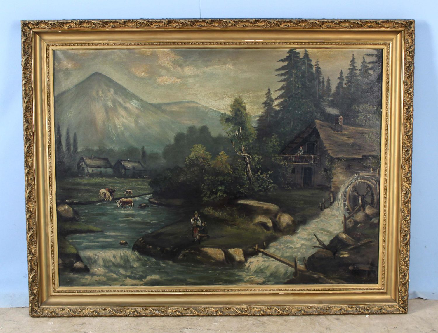 "Unknown Artist" Circa 1890 Oil on Canvas Landscape, Swiss Mountain Farm Scene. Scene depicts life in a Swiss valley with cows, houses, grist mill, and stream. Painted gesso frame looks to be original and measures 41 1/2" x 53 1/2". The painting itself measures 34" x 46 1/2". Condition- The canvas has overall craquelure and some stretcher lines are evident. See photos.