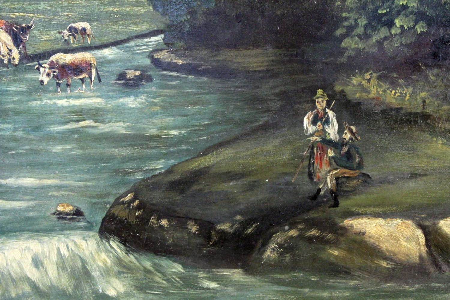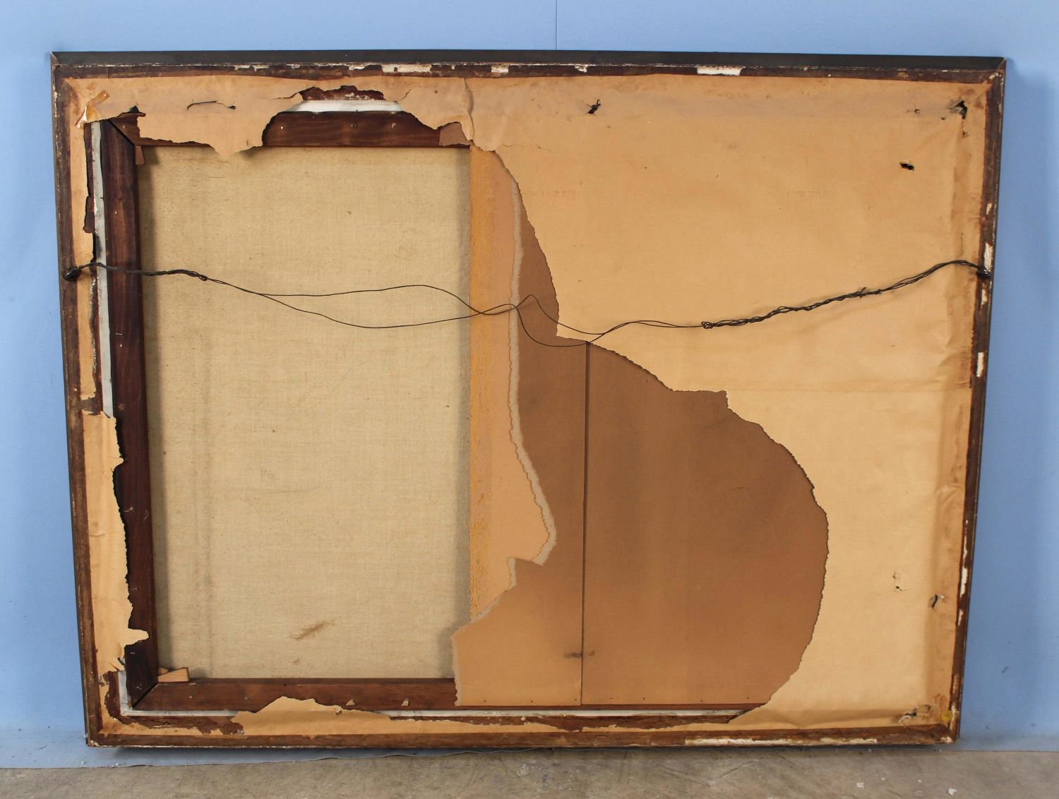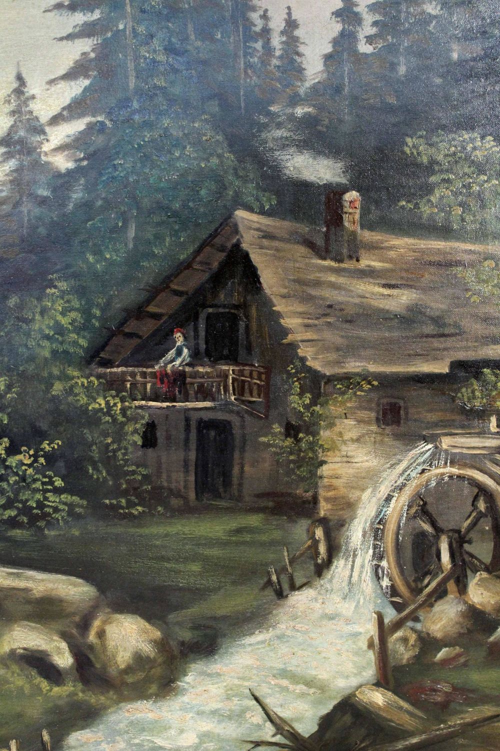 "Unknown Artist" Circa 1890 Oil on Canvas Landscape, Swiss Mountain Farm Scene. Scene depicts life in a Swiss valley with cows, houses, grist mill, and stream. Painted gesso frame looks to be original and measures 41 1/2" x 53 1/2". The painting itself measures 34" x 46 1/2". Condition- The canvas has overall craquelure and some stretcher lines are evident. See photos.