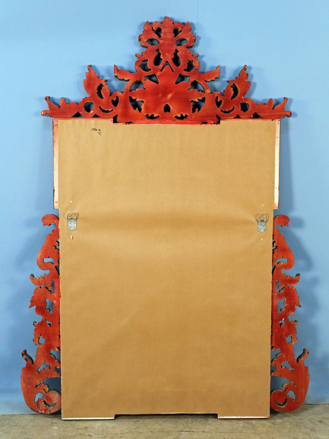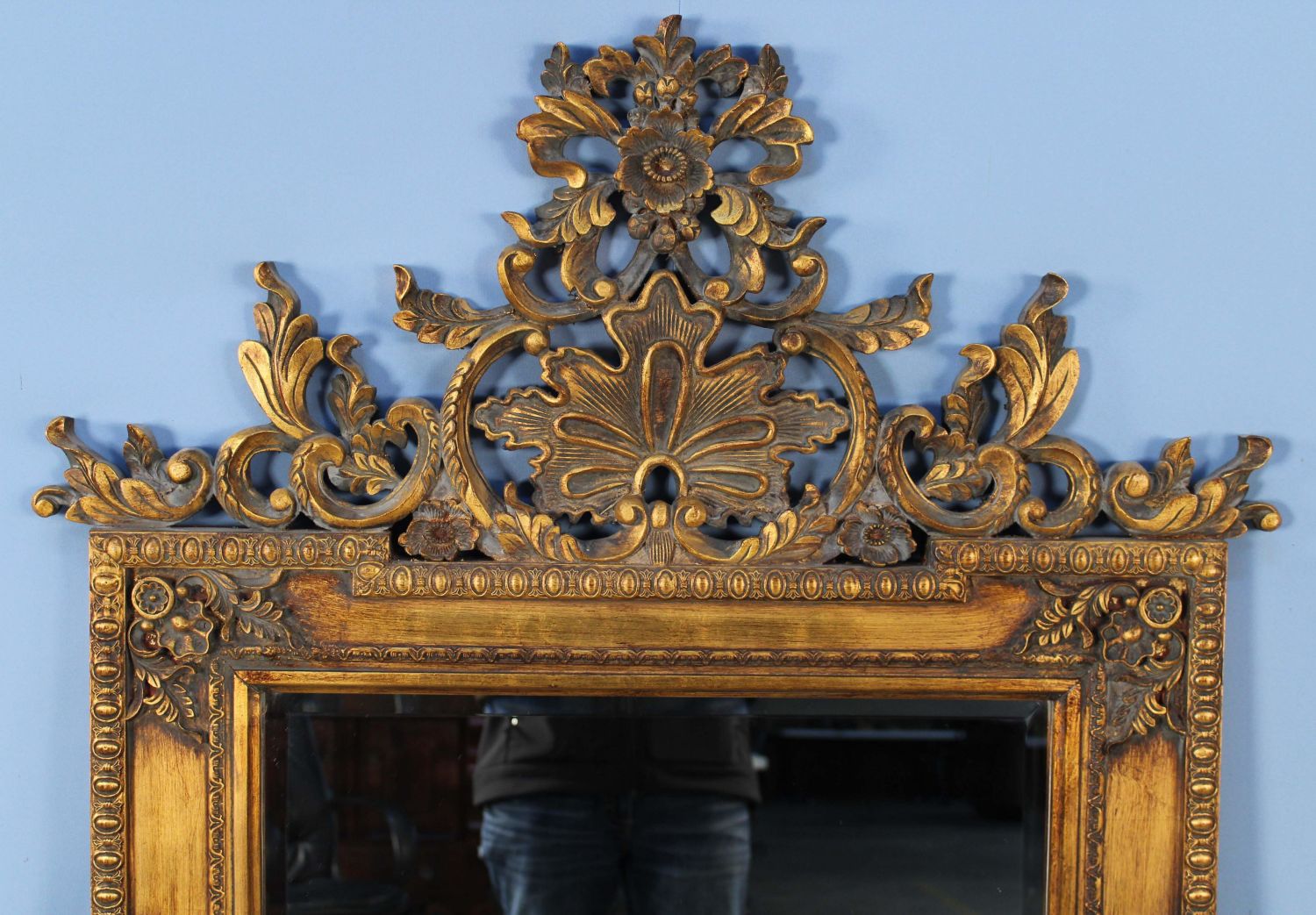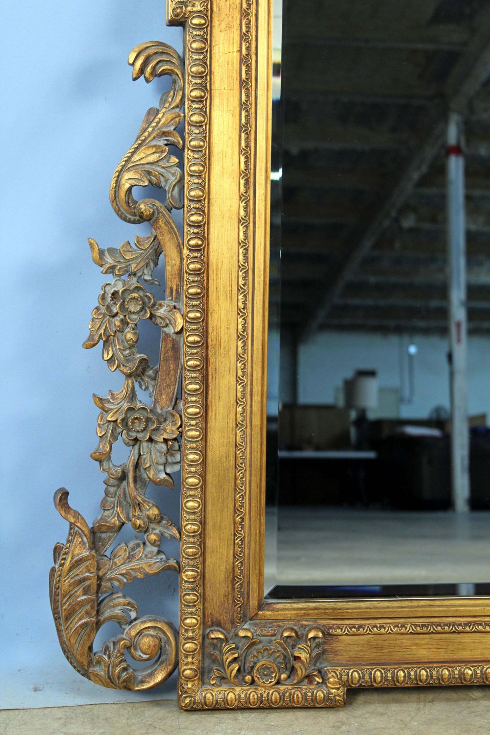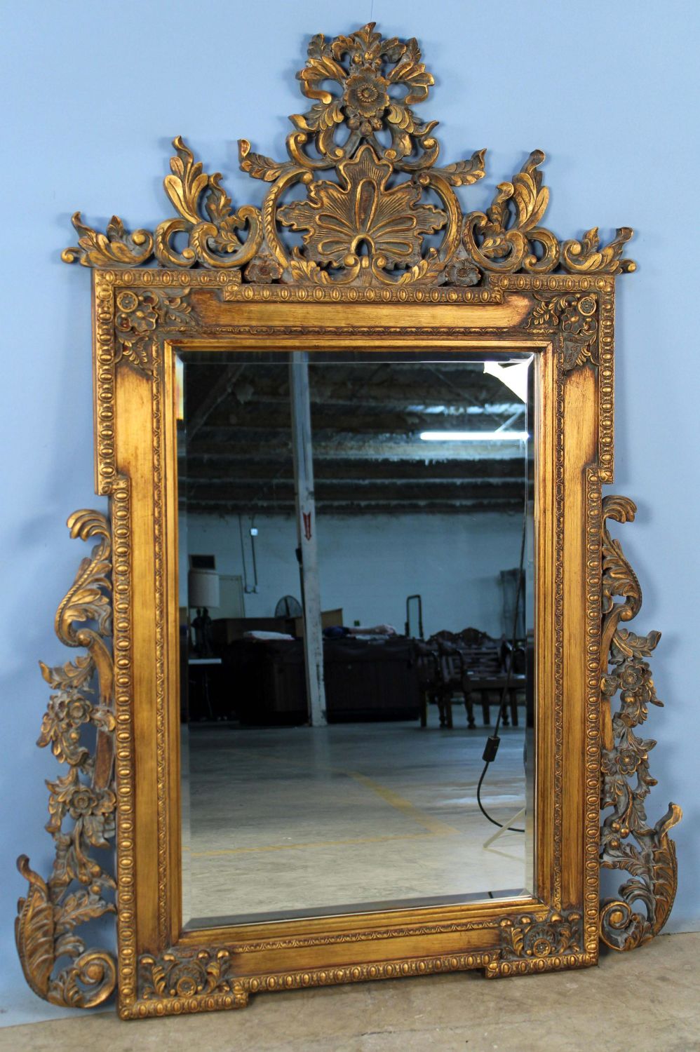 Contemporary French Style Carved Wood Frame with Antiqued Gold Gilt Wall Mirror. The mirror is beveled. Measures 43 3/4" x 60". Condition- The wall mirror is in good condtion. See photos.
