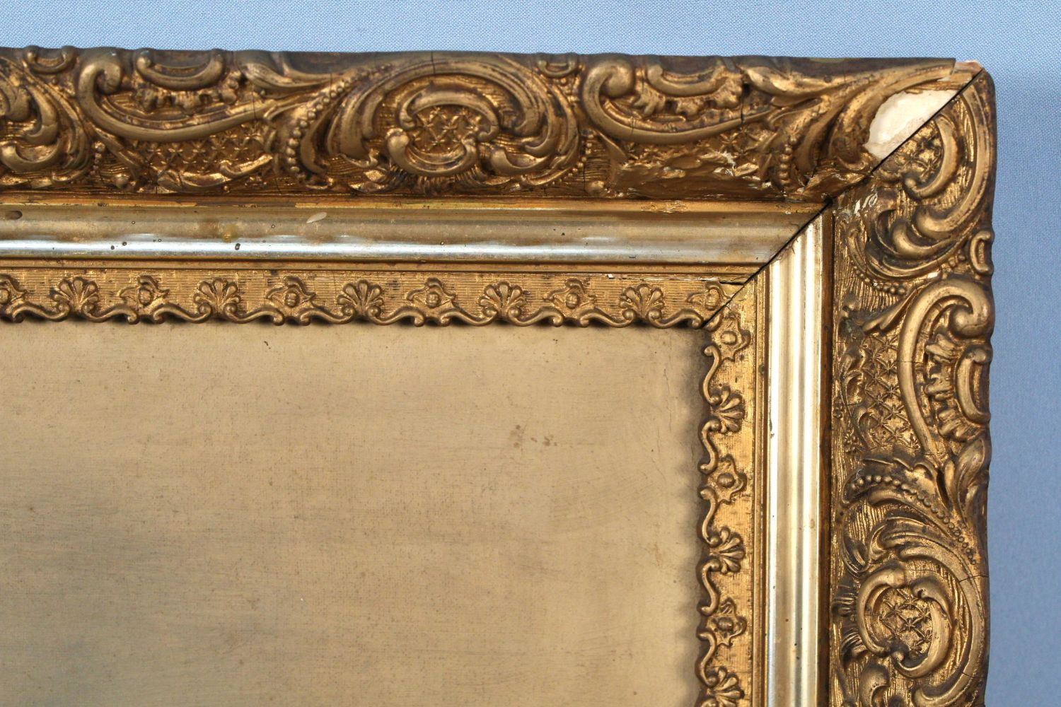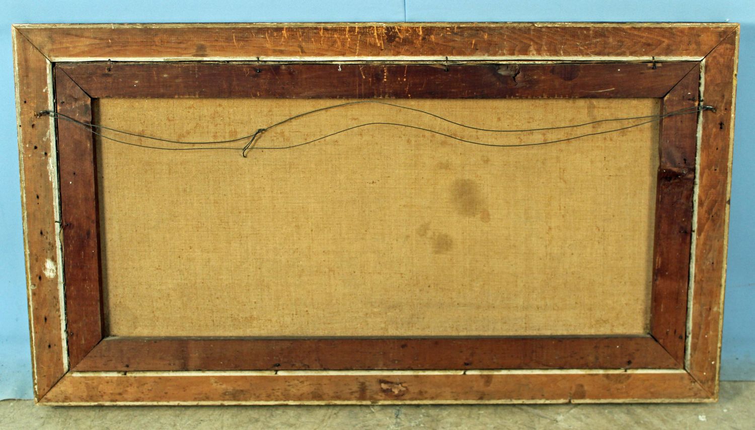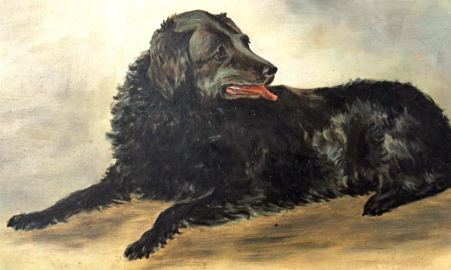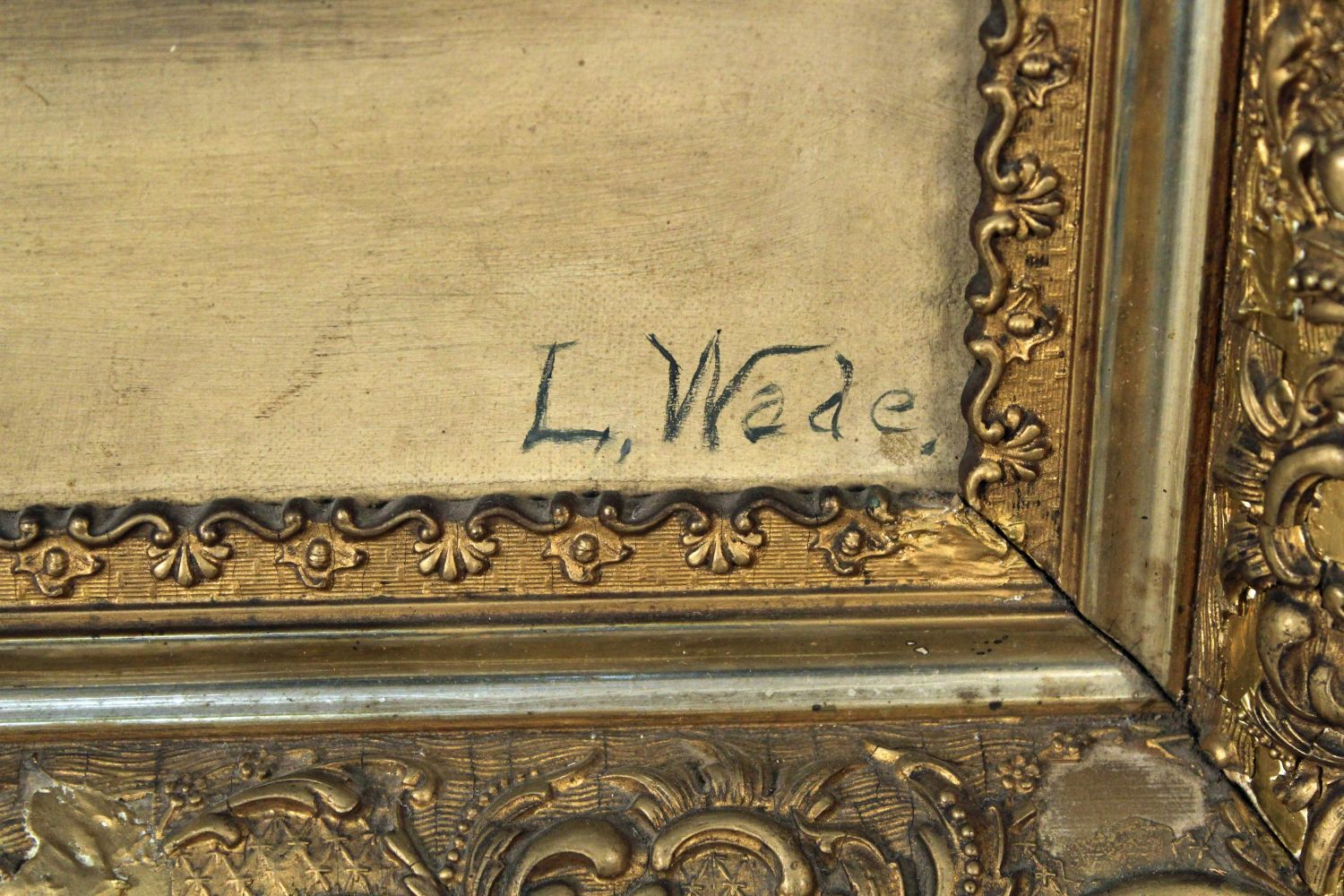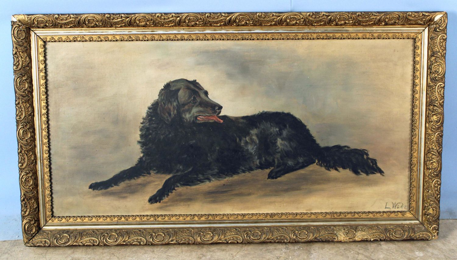 L. Wade, C. 1900 Oil on Canvas "Black Dog" . Painted gesso frame measures 22 1/2" x 41 1/2". Painting measures 18" x 36 1/2". Condition- Painting has some small losses and imperfections, overall good condition. Frame has old repairs, gesso loss, open corners, etc. See photos.