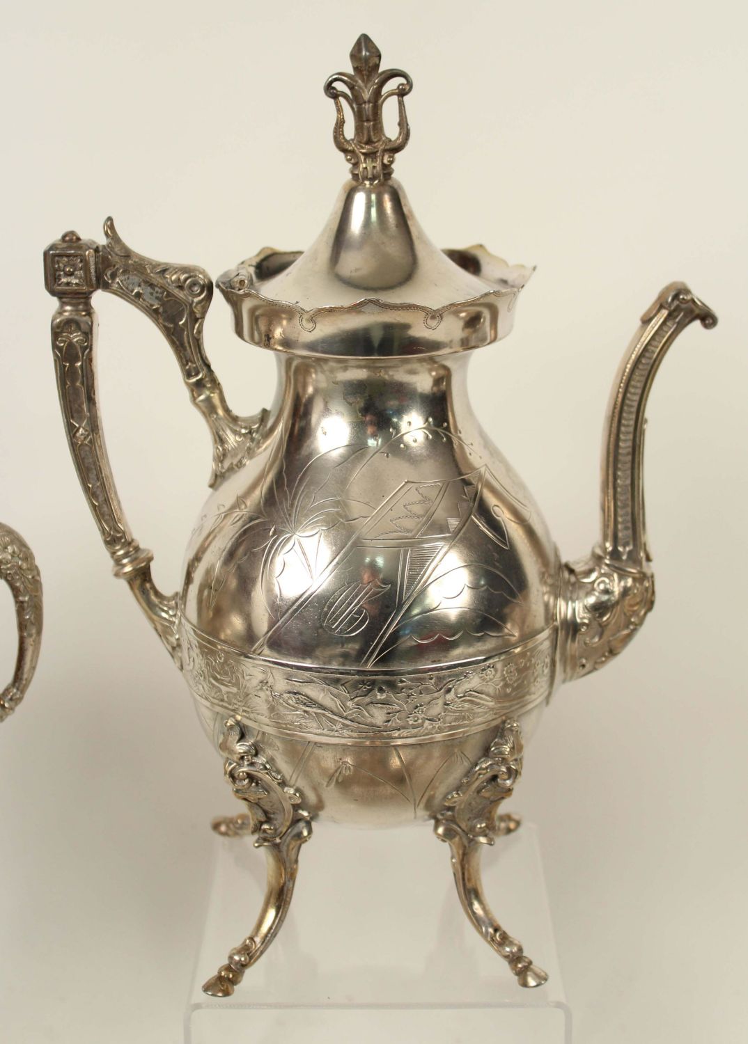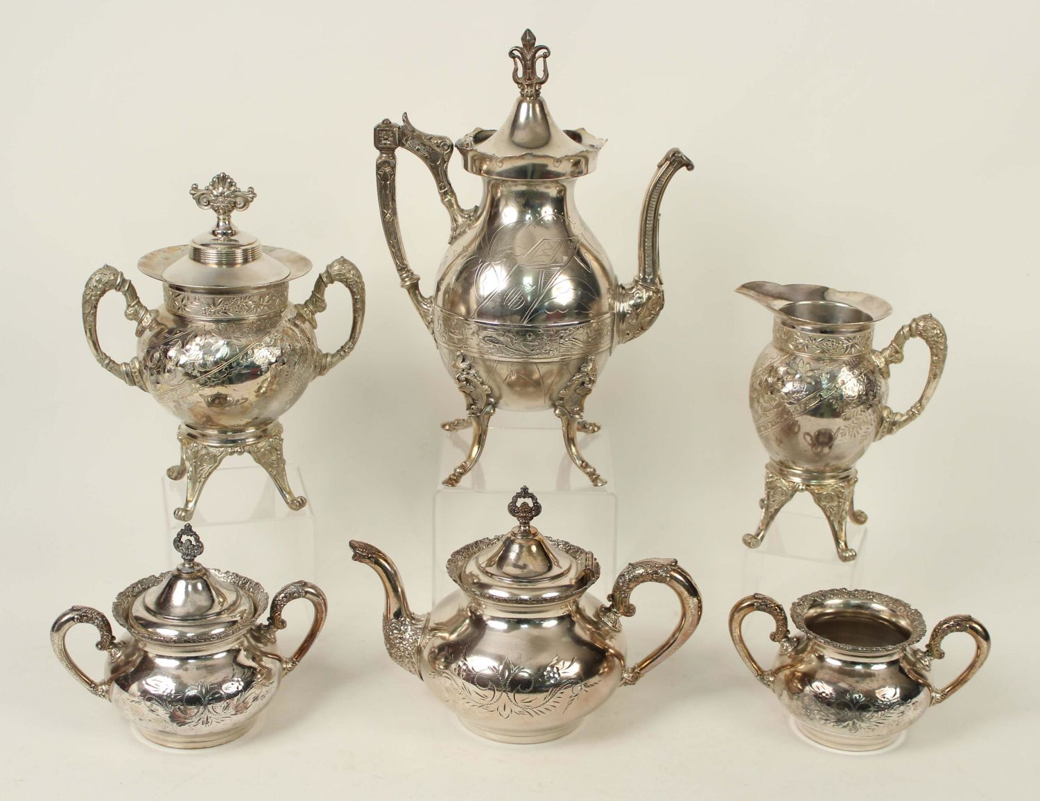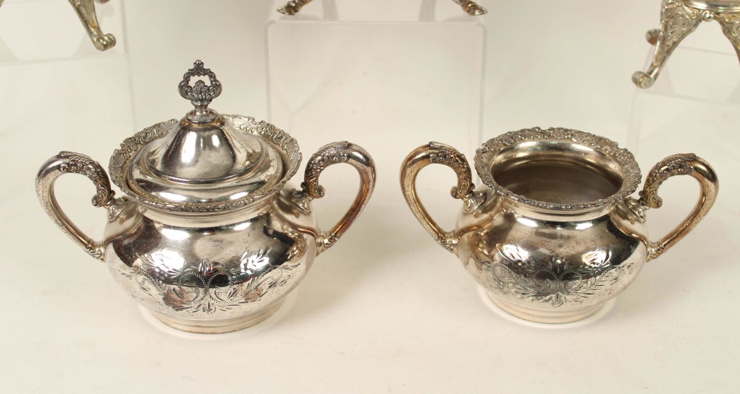 Six Pieces of Victorian Silver Plate. (1) Wilcox footed coffee pot. Old lid and handle repair. Measures 12 1/2" high. (1) Meriden Britannia Co. Victorian Silver Plate footed creamer. Measures 7 3/8" high. (1) Meriden Britannia Co. Victorian Silver Plate footed waste with lid. Measures 9 1/2" high. (3) Van Bergh silver plate teapot (7" high), waste with no lid (3 1/4" high), and sugar bowl with lid (5 3/4" high). Condition- All the pieces have plate loss and scratches. The coffee pot has been repaired. See photos.
