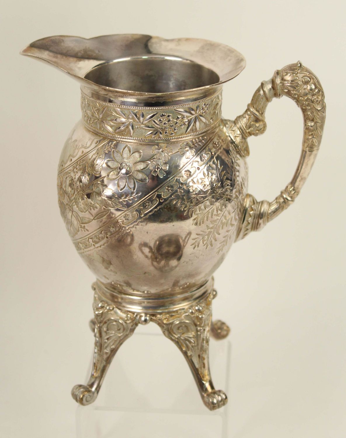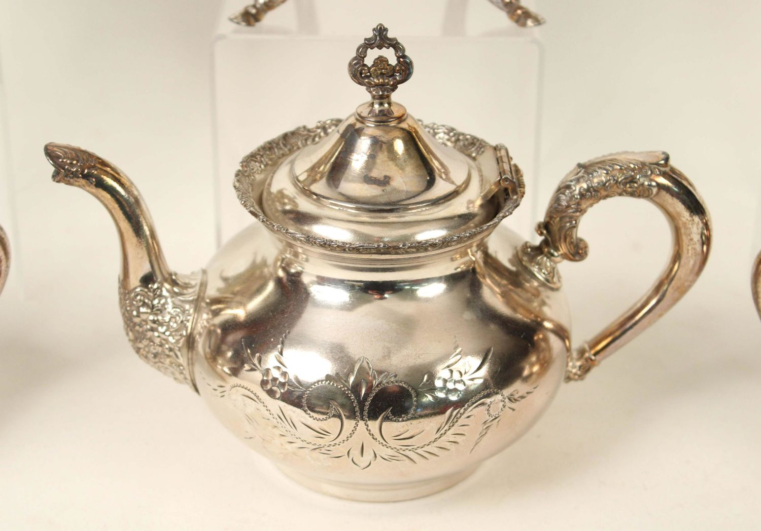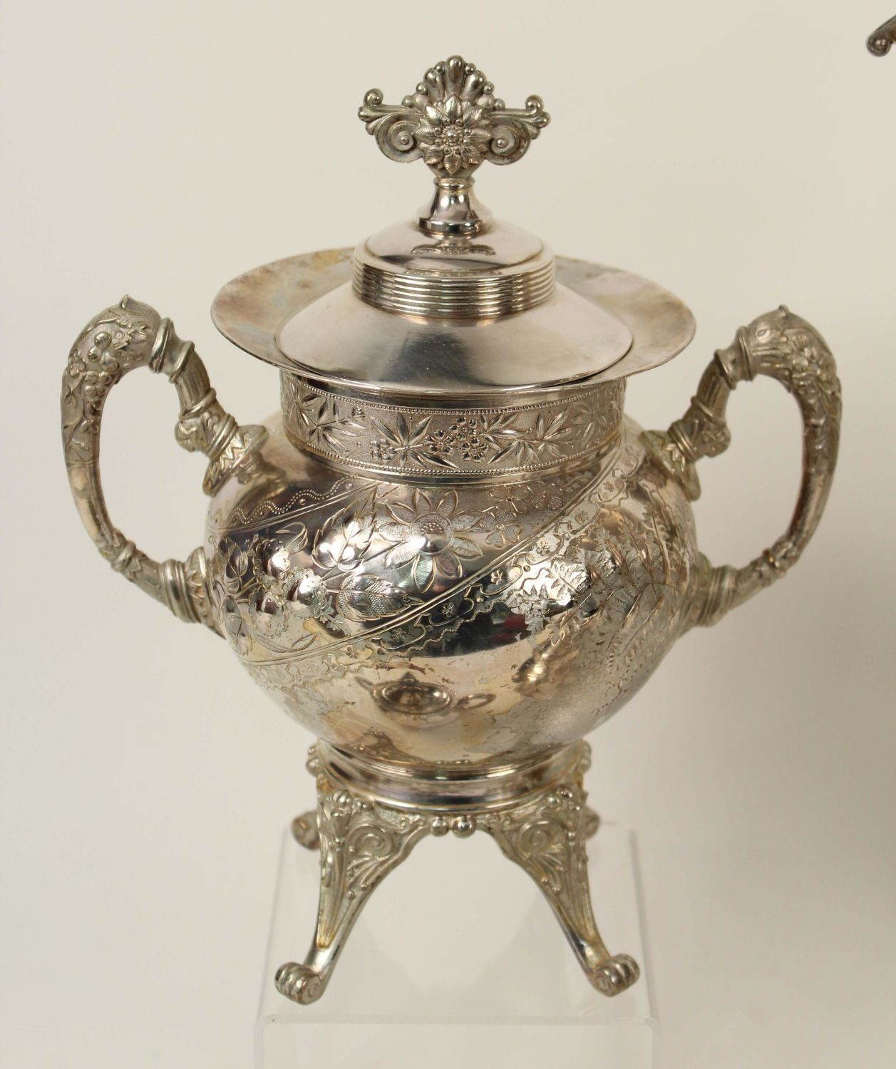 Six Pieces of Victorian Silver Plate. (1) Wilcox footed coffee pot. Old lid and handle repair. Measures 12 1/2" high. (1) Meriden Britannia Co. Victorian Silver Plate footed creamer. Measures 7 3/8" high. (1) Meriden Britannia Co. Victorian Silver Plate footed waste with lid. Measures 9 1/2" high. (3) Van Bergh silver plate teapot (7" high), waste with no lid (3 1/4" high), and sugar bowl with lid (5 3/4" high). Condition- All the pieces have plate loss and scratches. The coffee pot has been repaired. See photos.