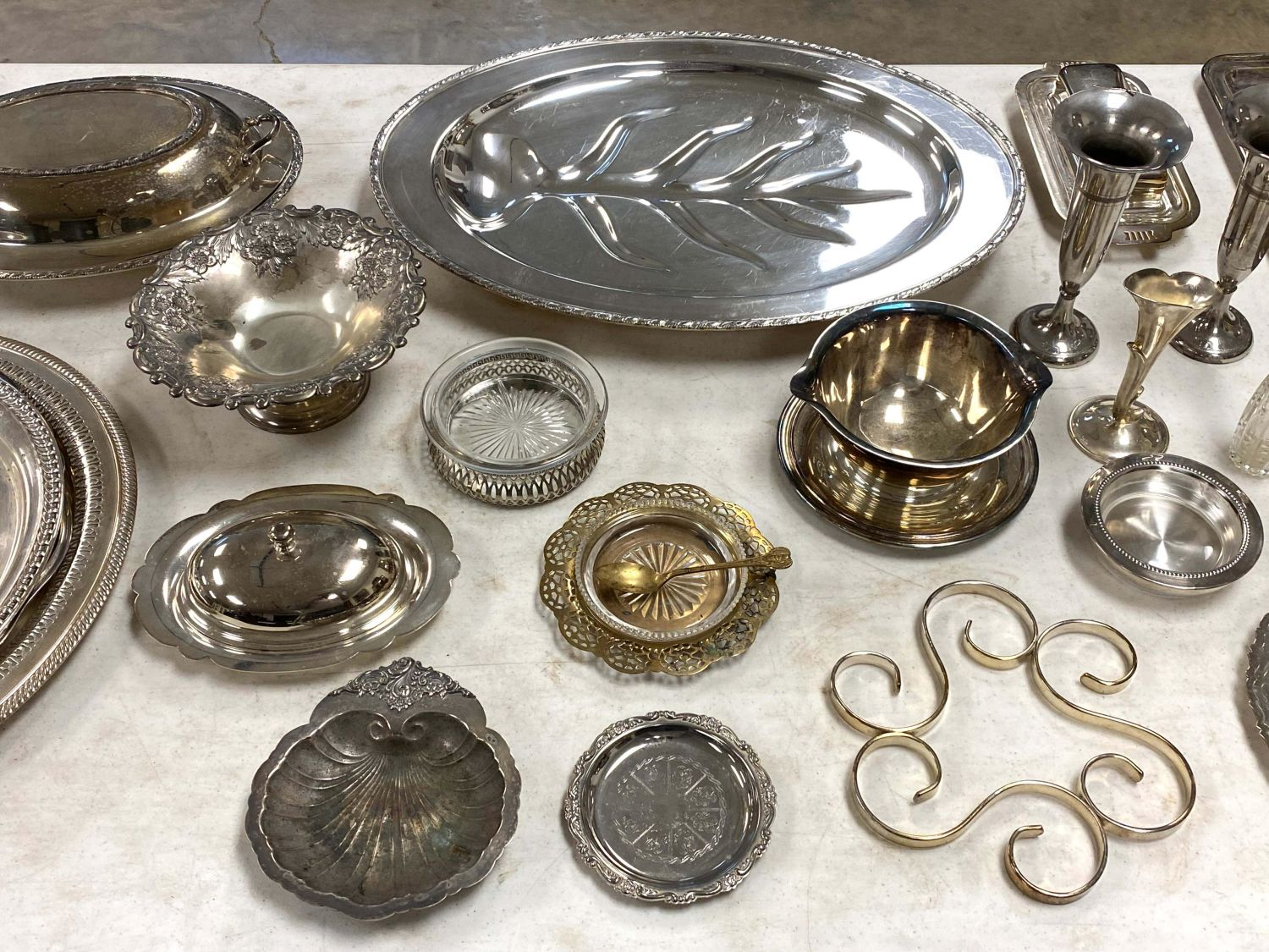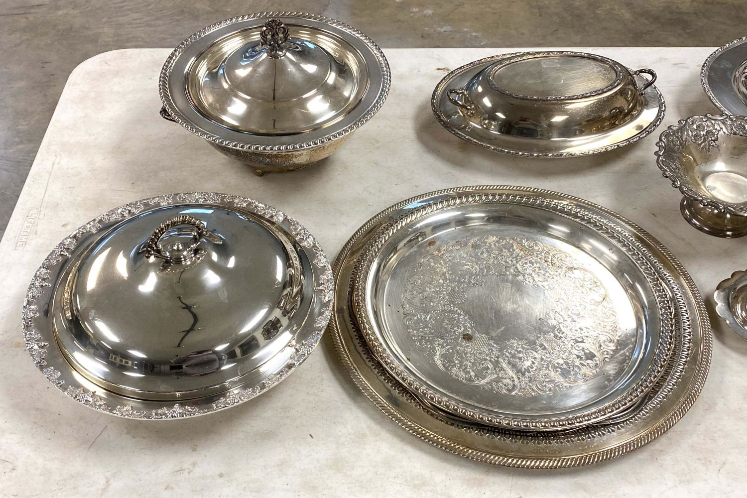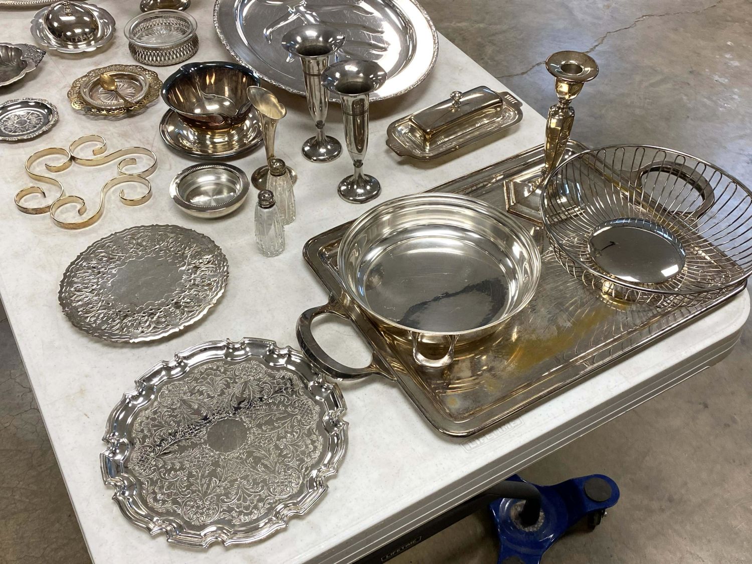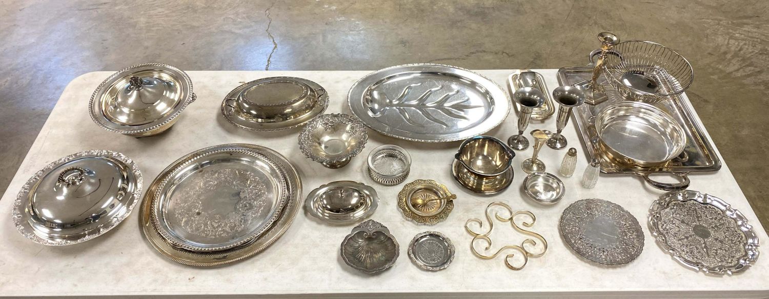 Large Group of Silver Plate, Platters, Trays, Butter Dishes, Etc. Condition- Most pieces have plate loss and scratches. See photos.