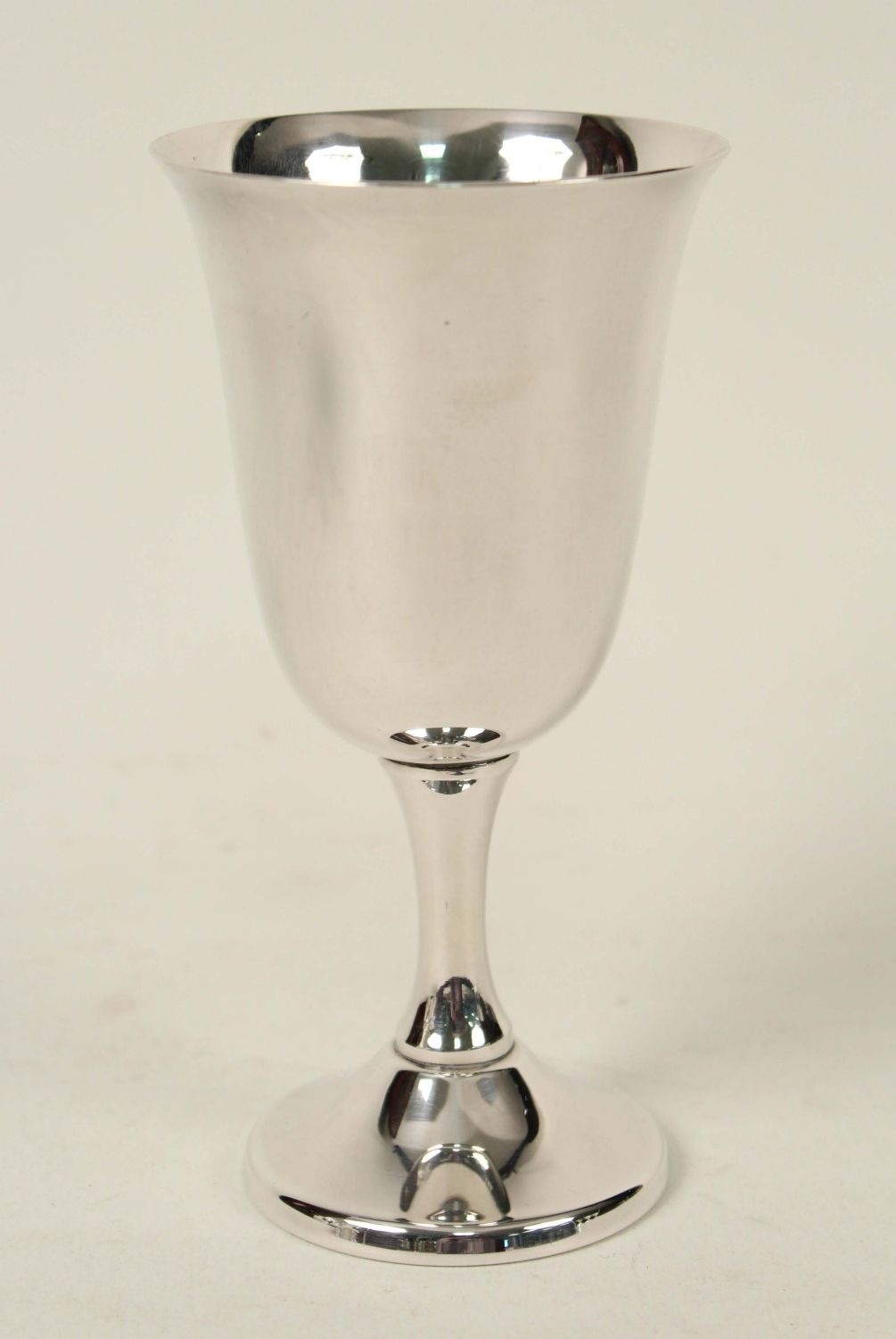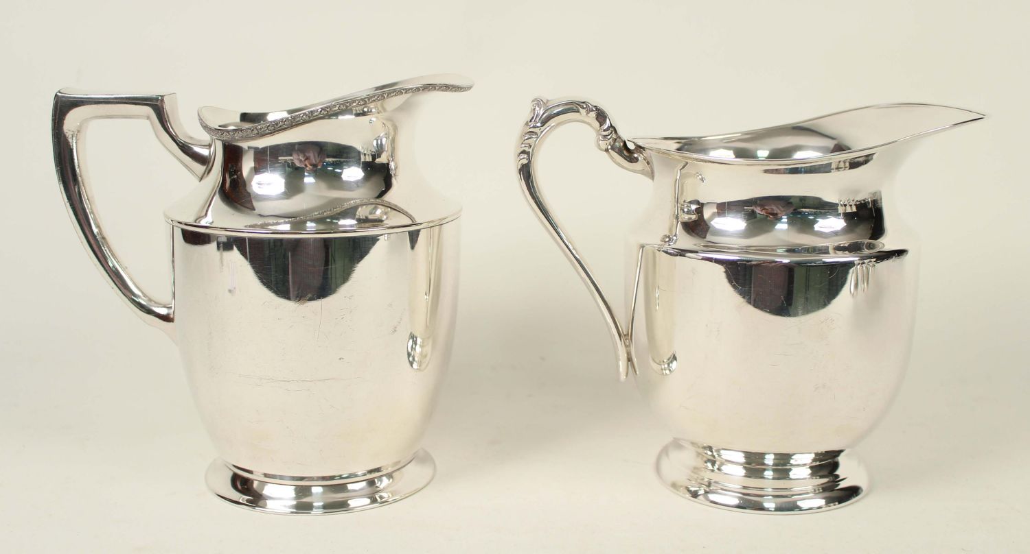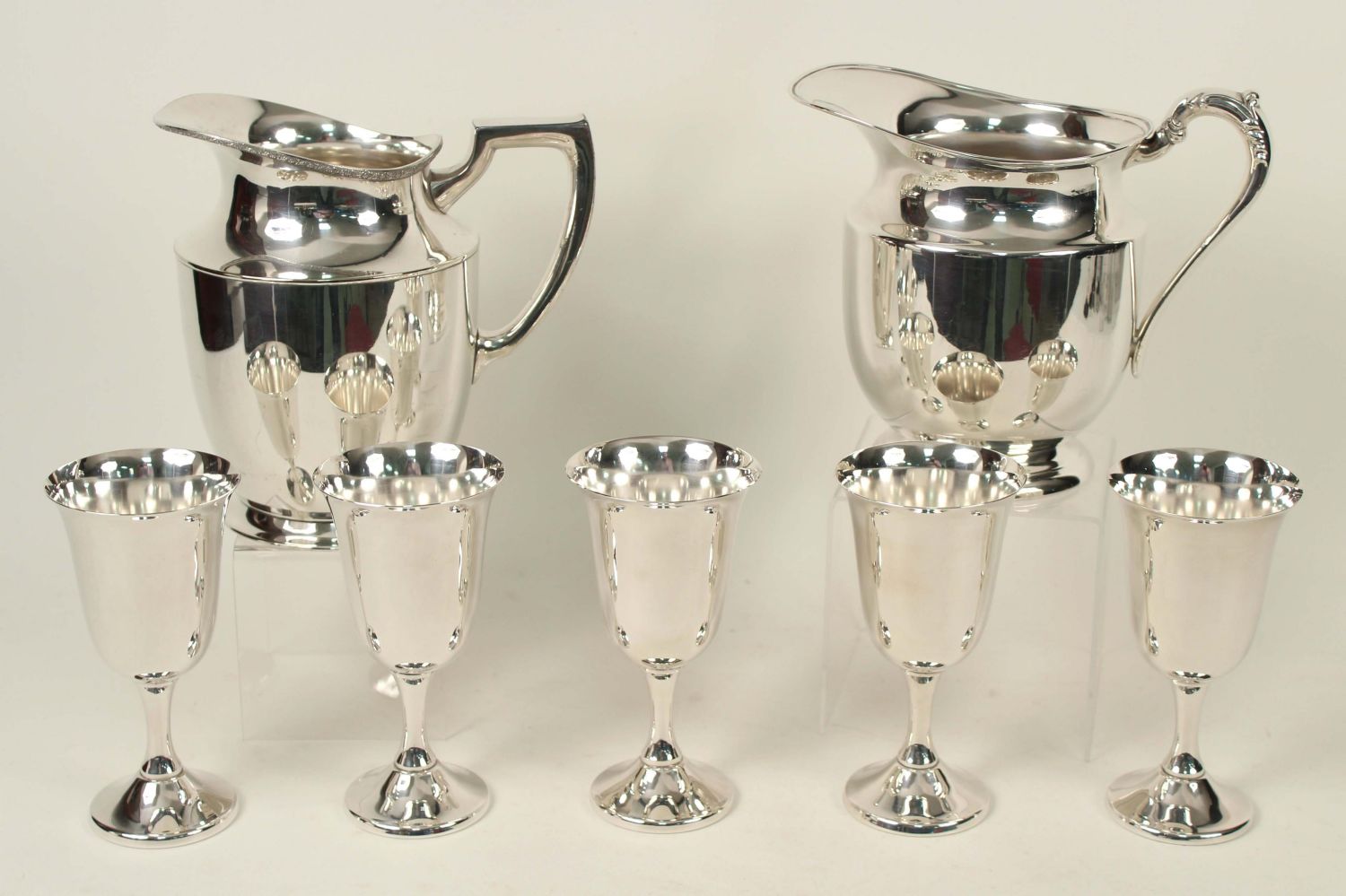 Two Silver Plate Pitchers and Five Goblets. The largest pitcher measures 8" high. Goblets measure 6 5/8" high. Condition- Group is in overall good condition with some wear and scratches to plate. See photos.