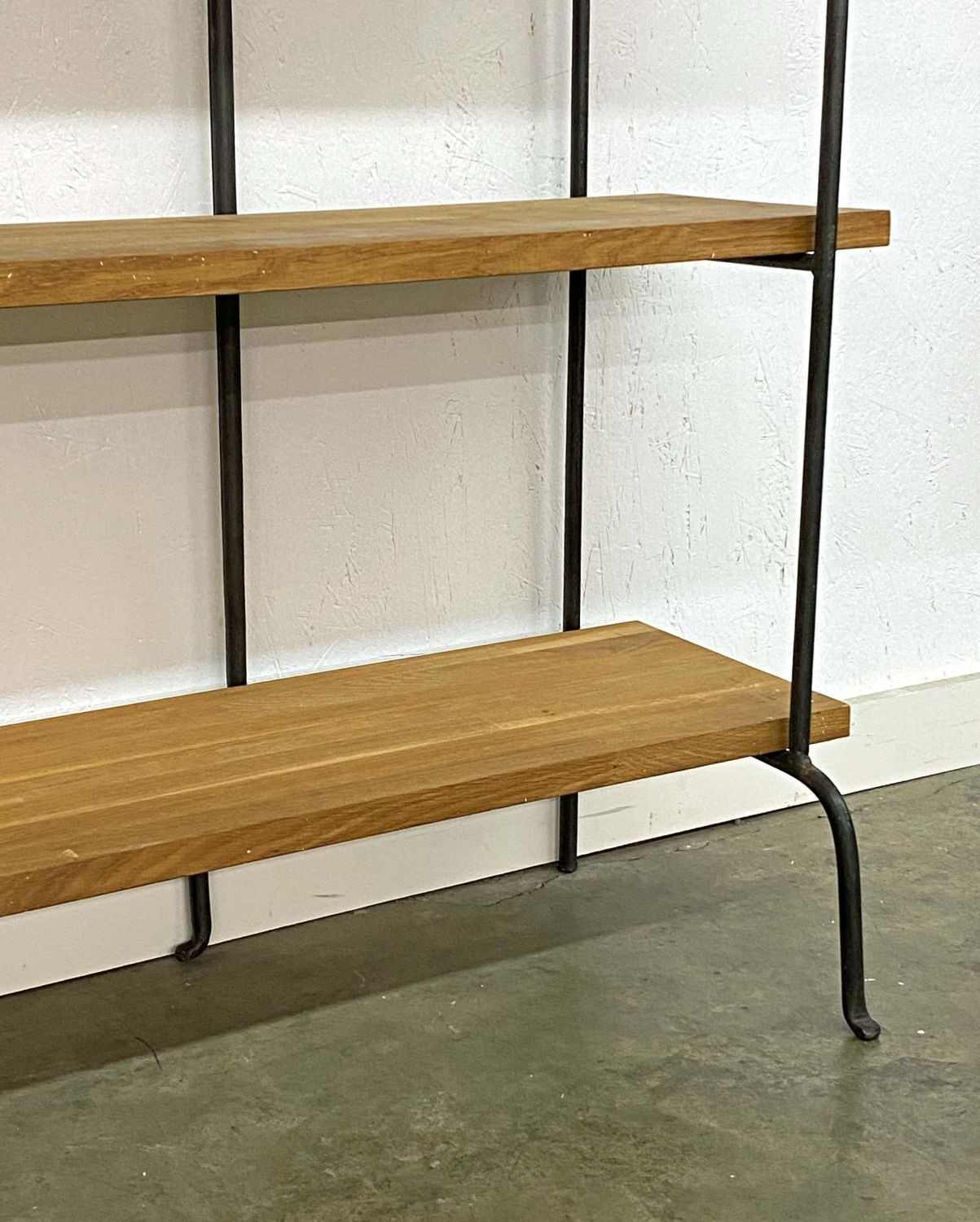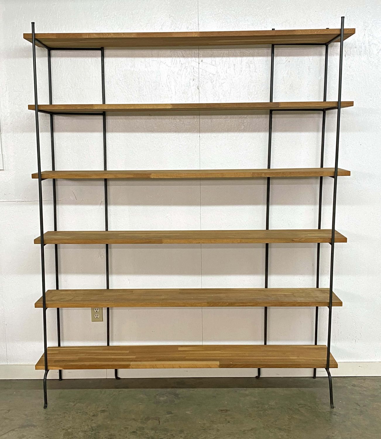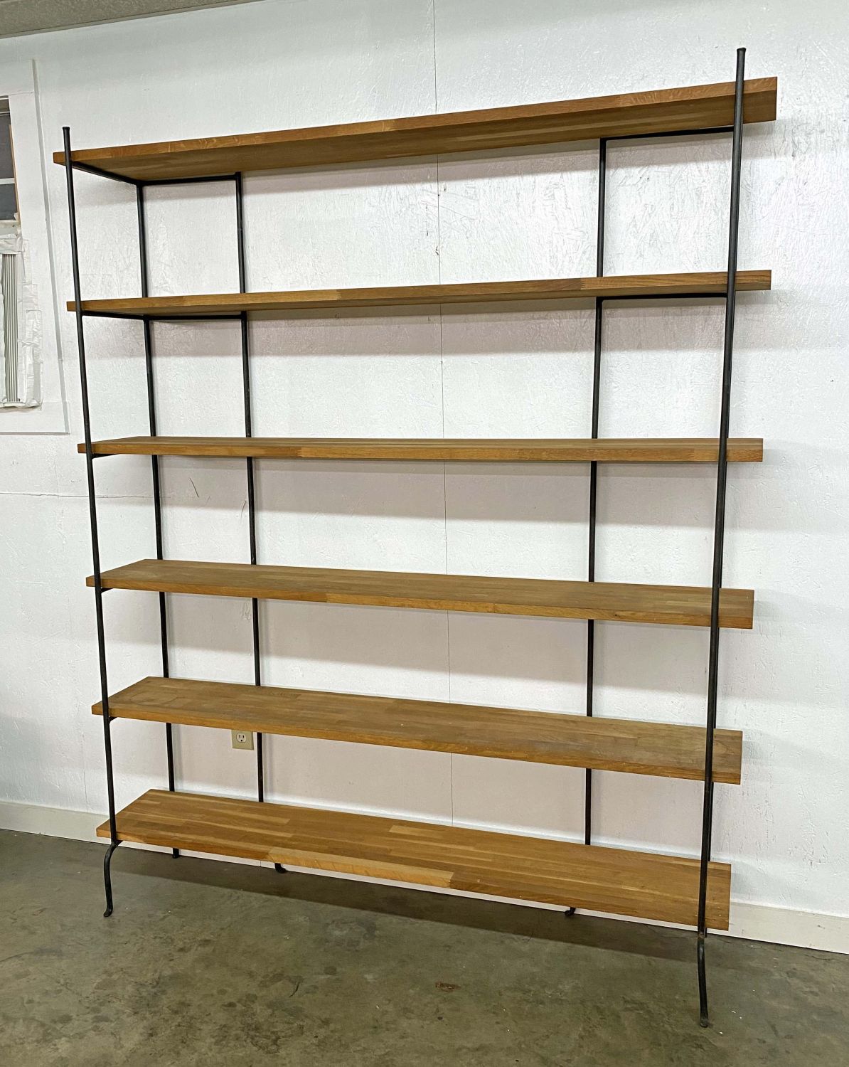 Wrought Iron and Oak Bookshelf with Six Shelves. The shelves are made of multiple small pieces of oak wood. Measures 73" high x 67" wide x 13 3/4" deep. Condition- Bookshelf is in good condition. See photos.