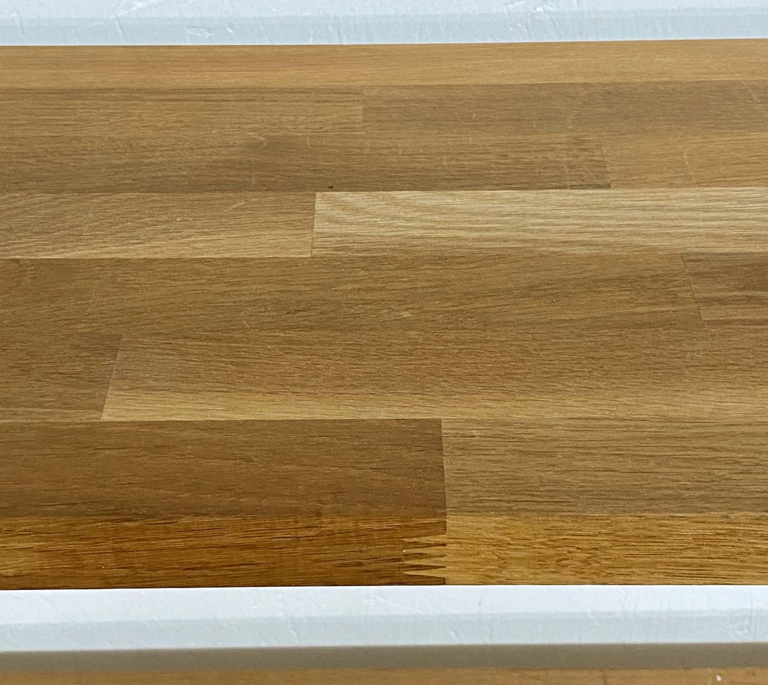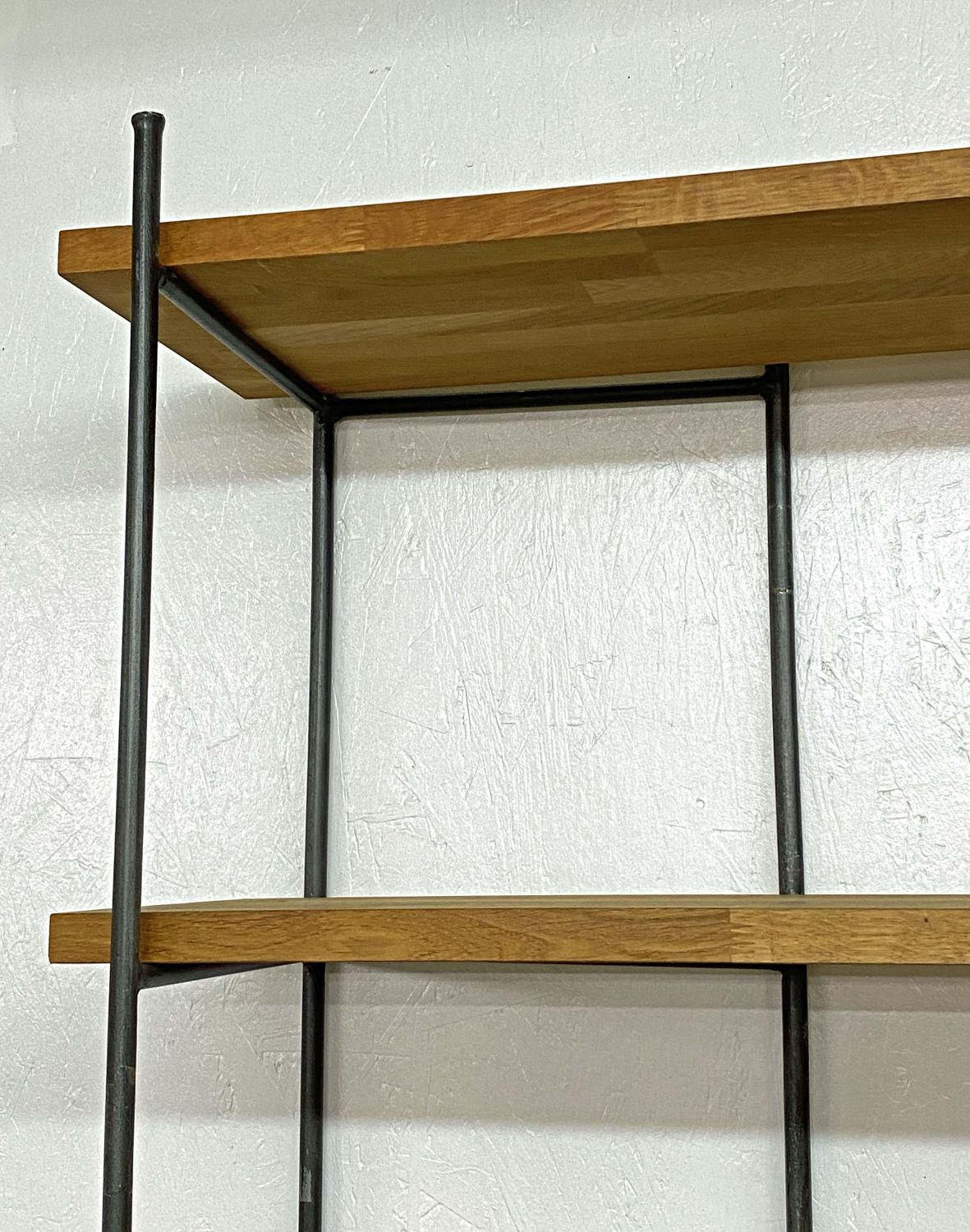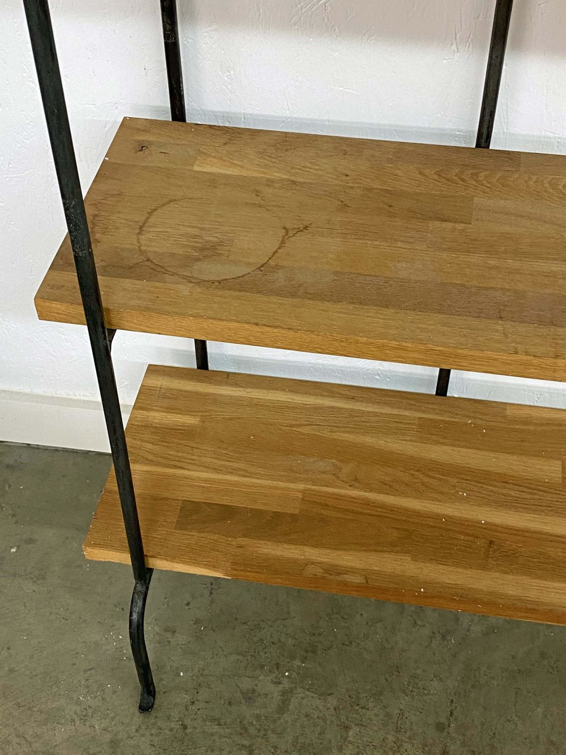 Wrought Iron and Oak Bookshelf with Six Shelves. The shelves are made of multiple small pieces of oak wood. Measures 73" high x 67" wide x 13 3/4" deep. Condition- Bookshelf is in good condition. See photos.