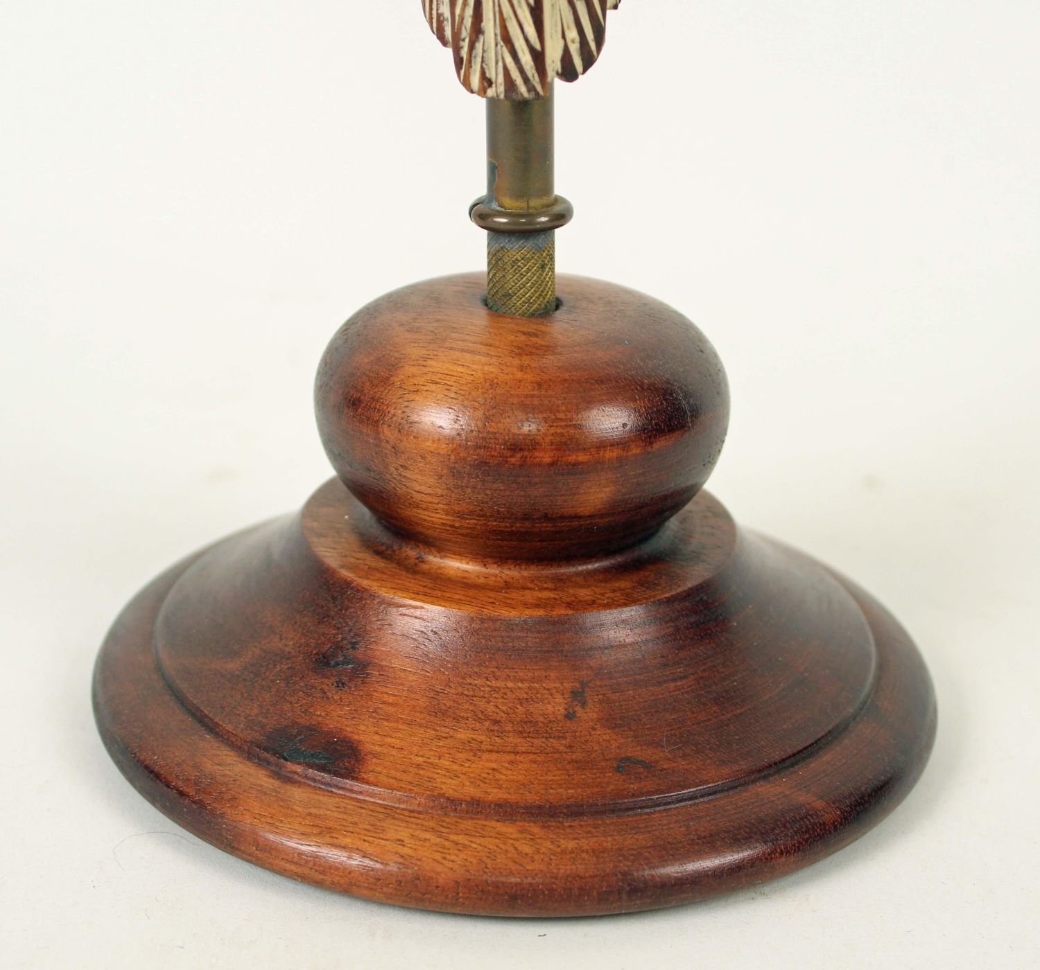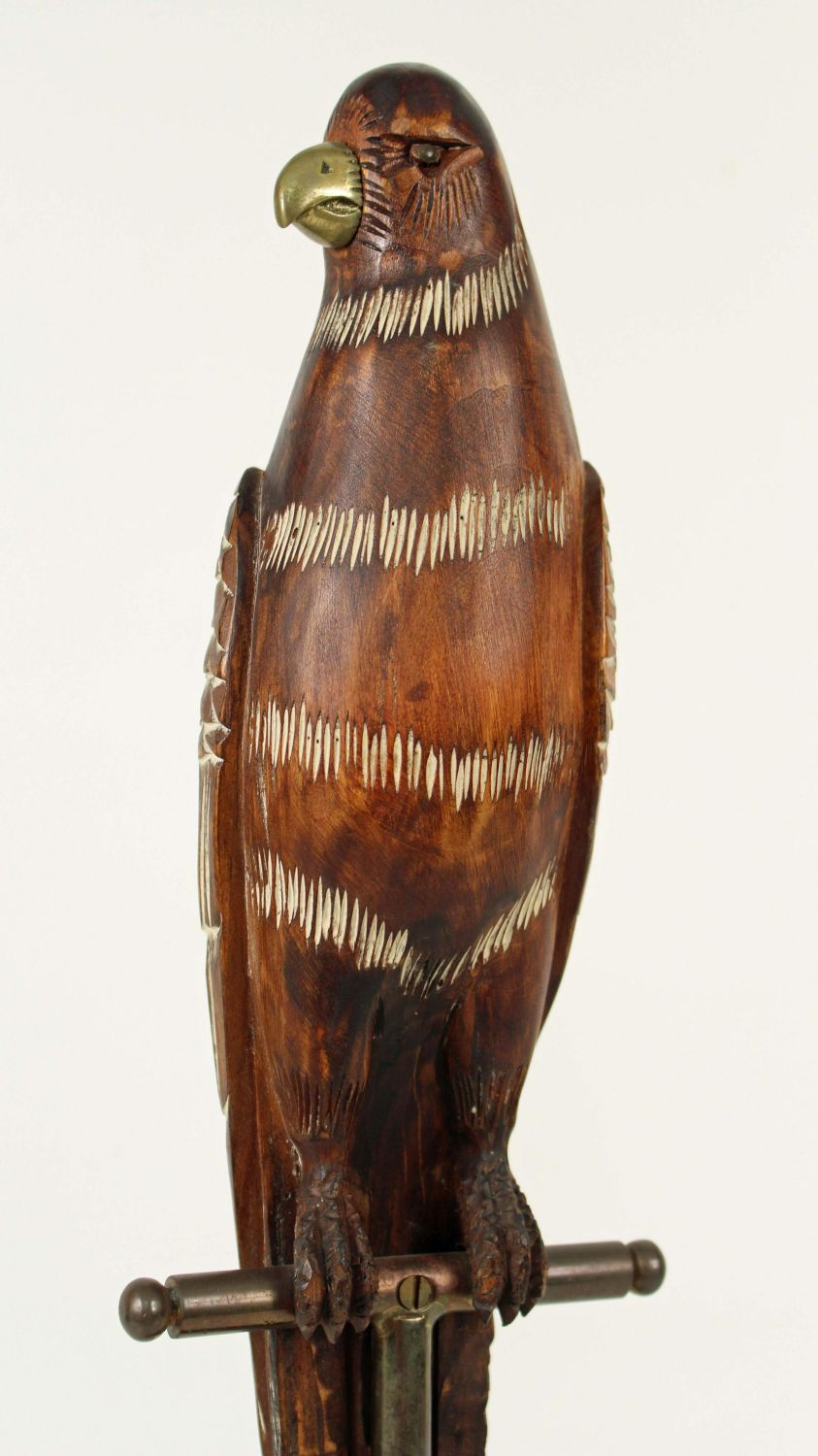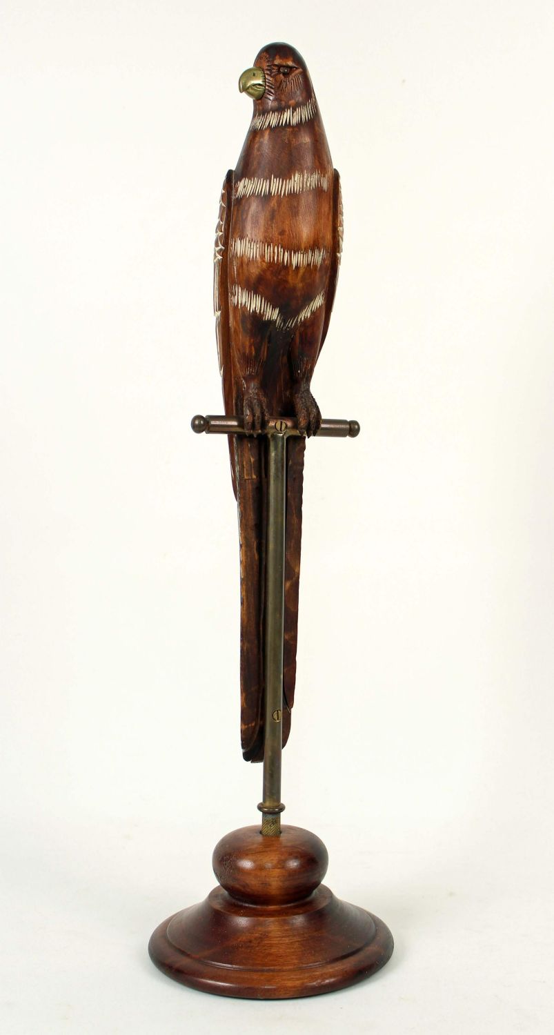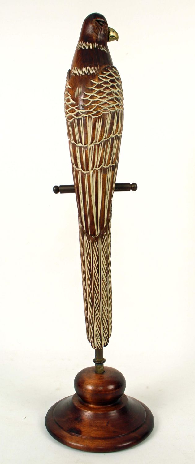 Maitland Smith Era Sarreid Spain Carved Wooden Parrot. The bird is mounted on a mahogany and brass stand. This bird has a brass beak and metal eyes. Original label is affixed to the base. The parrot’s total height on the stand measures 23 1/2" H. Condition – Good condition.