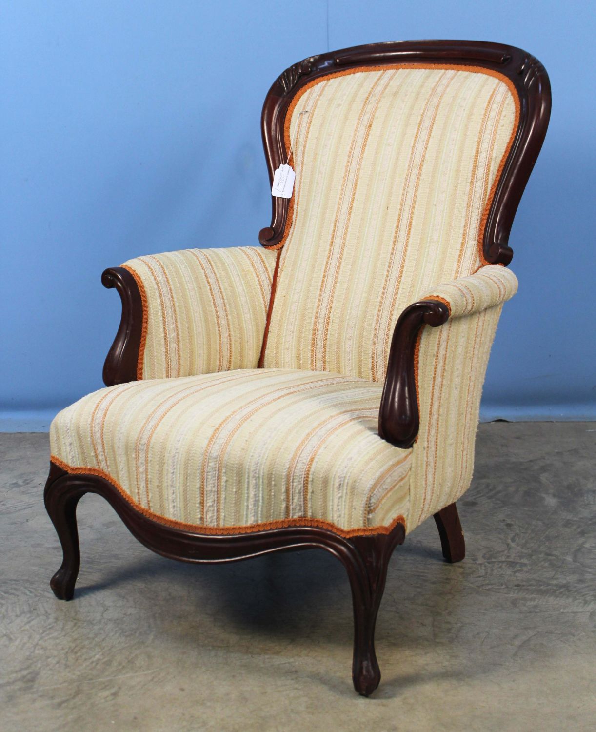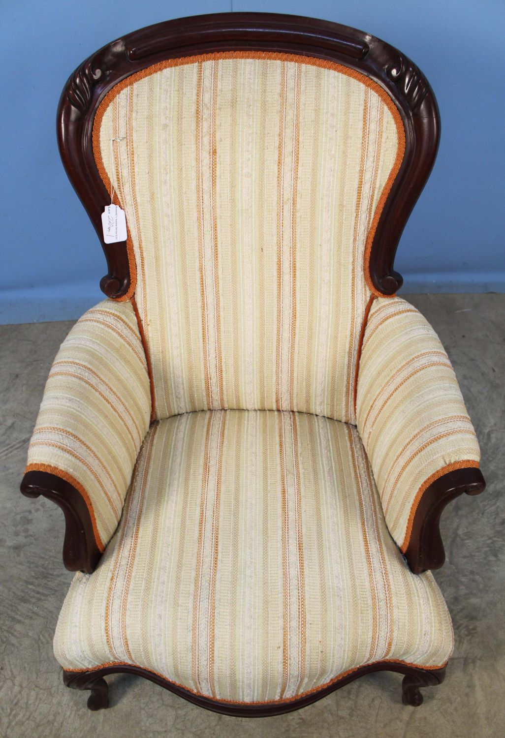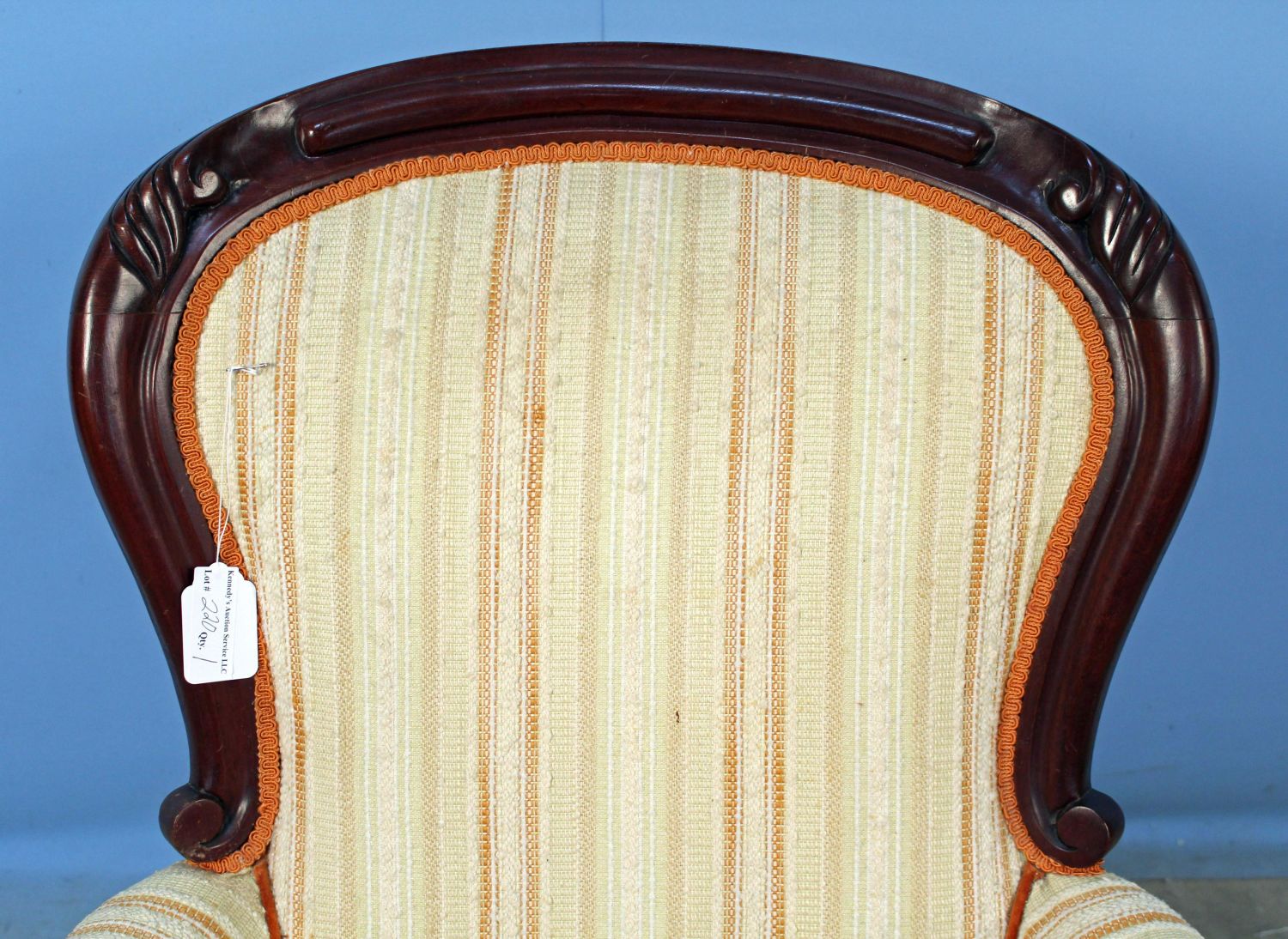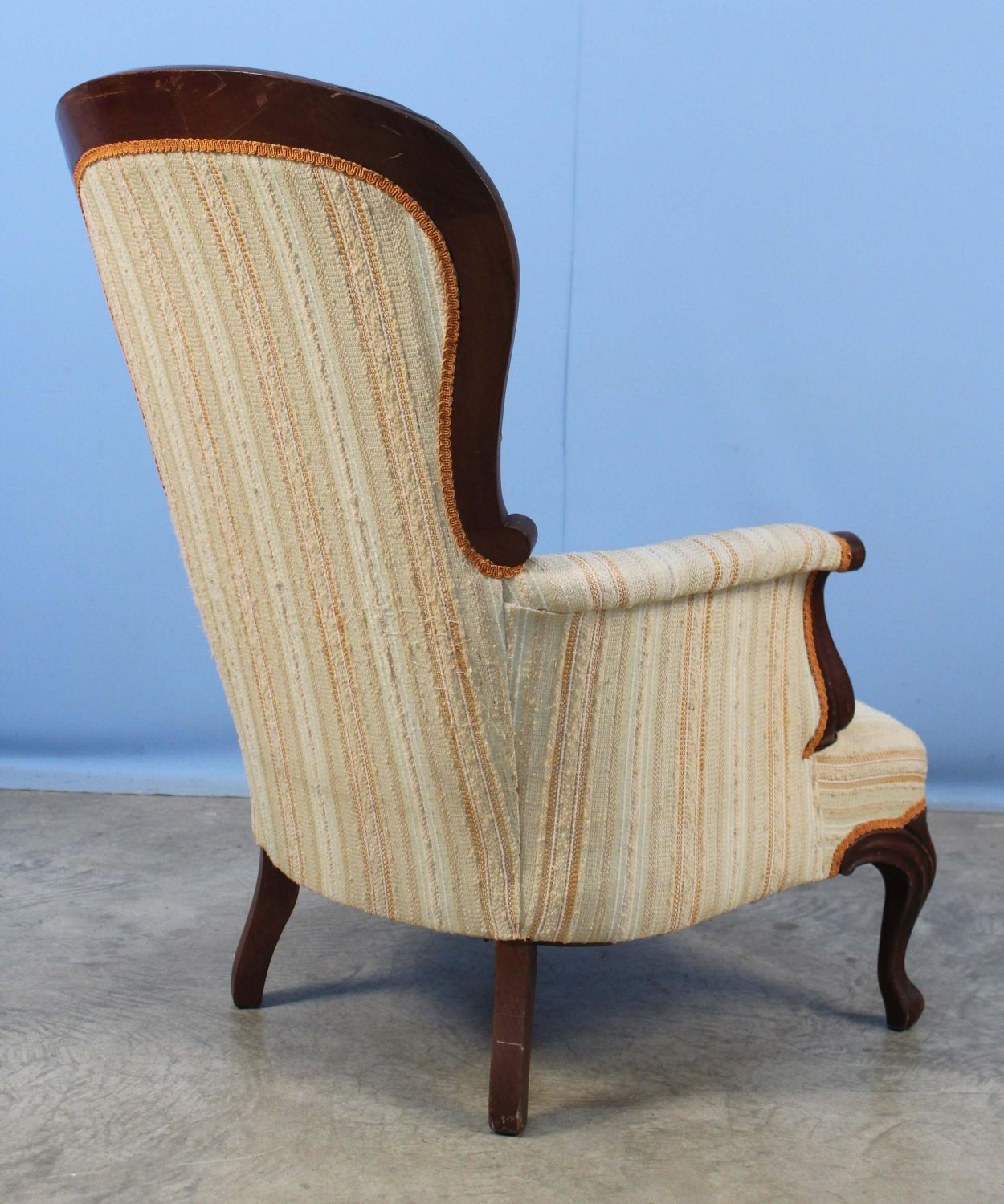 19th C. Walnut Balloon Back Armchair with Striped Upholstery. Measures 39" high x 27" wide x 34 1/4" deep. Condition- Armchair is in overall good condition. See photos.