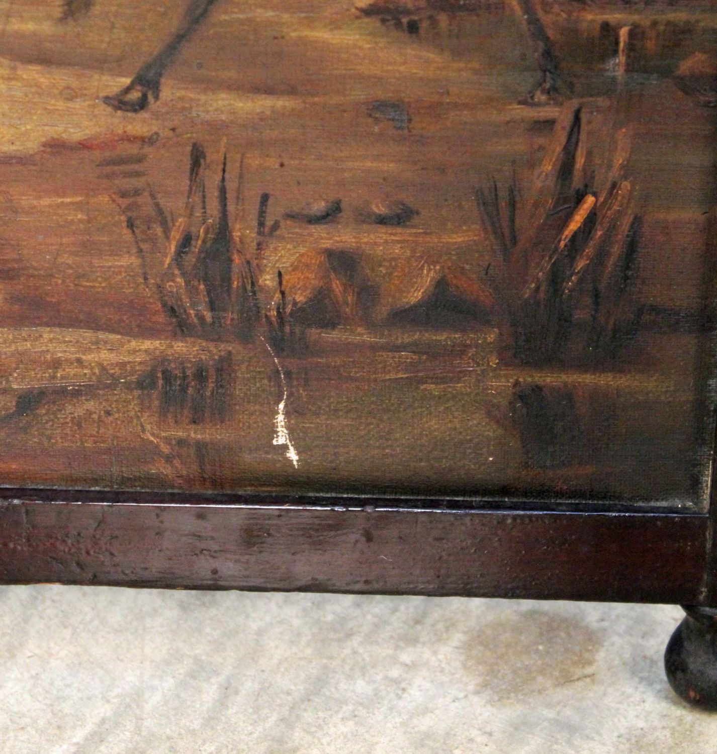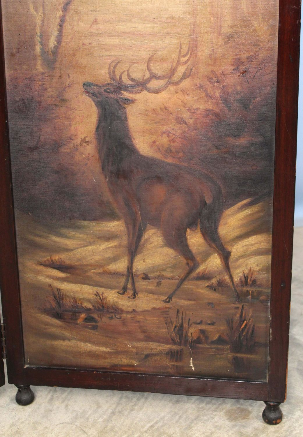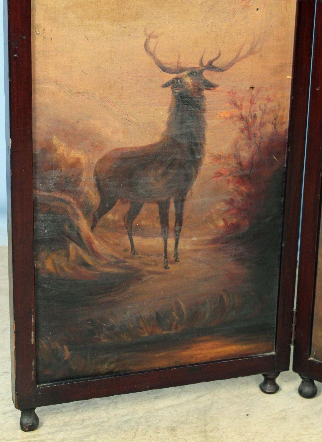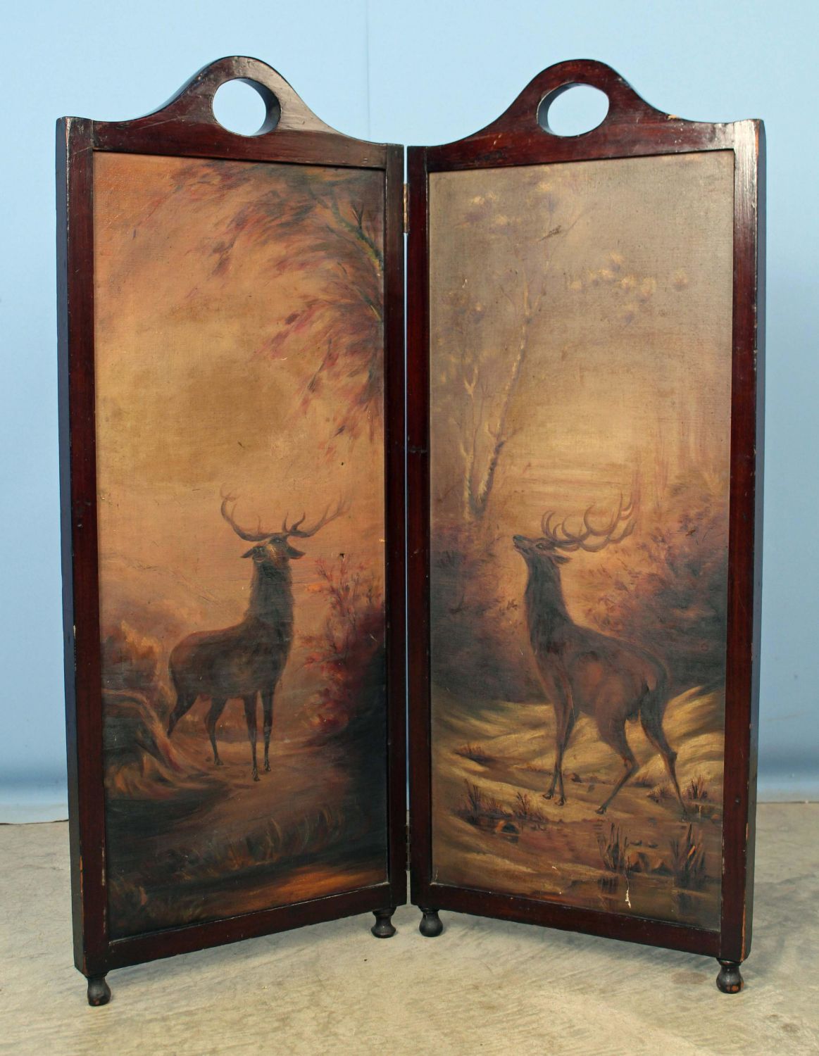 Small Folding Screen with Painting of Stags. Measures 36" high x 29" wide. Condition- Screen is in overall good condition. The paintings have bruises, one small hole, scratch to canvas, etc. Need to be cleaned because they have darkened. See photos.