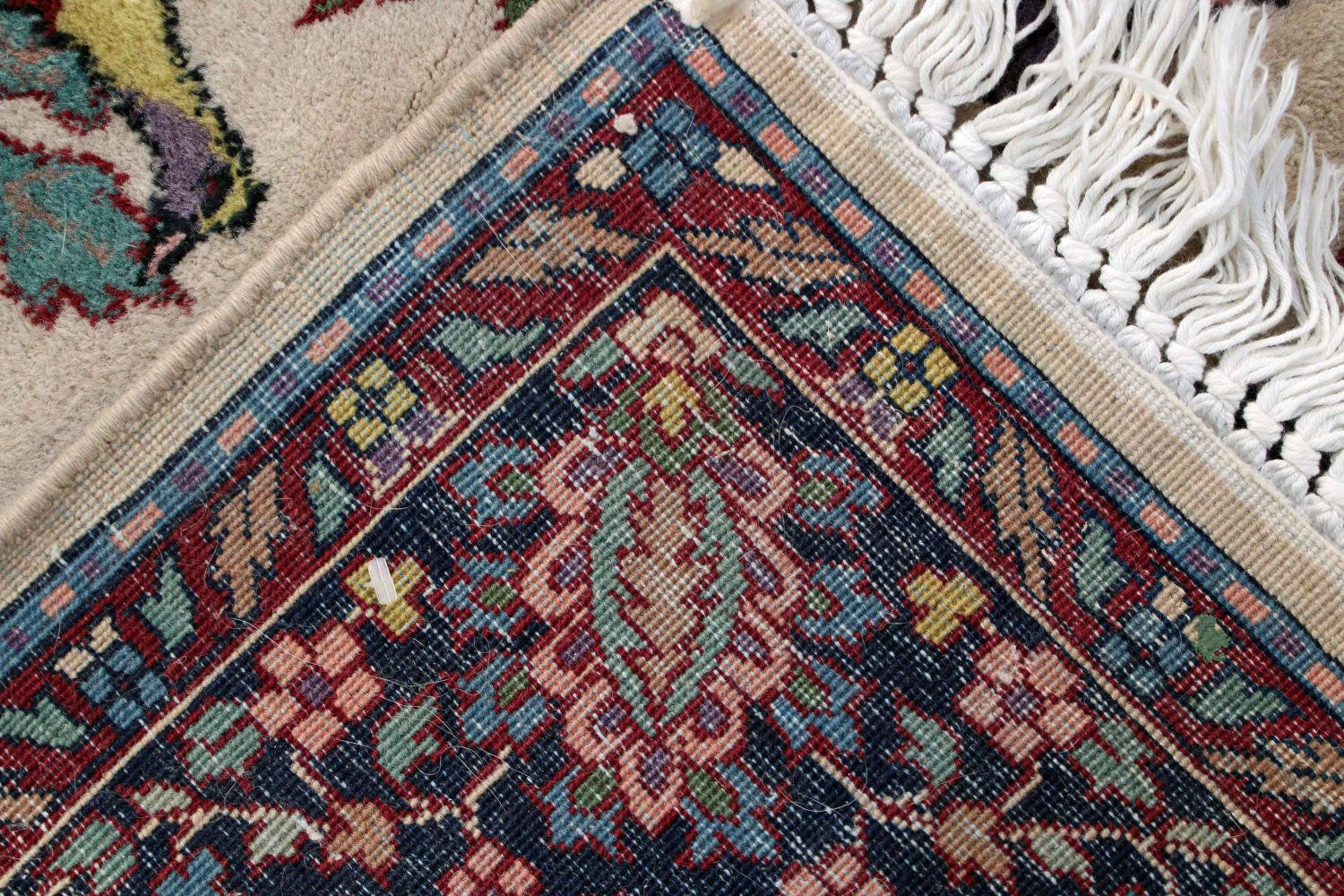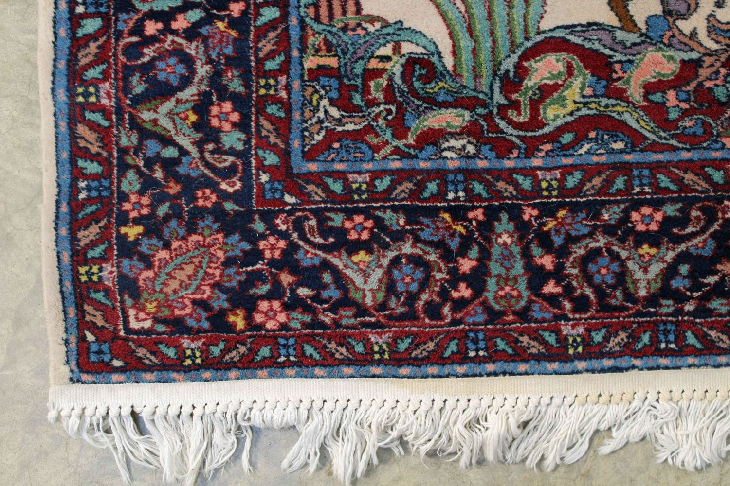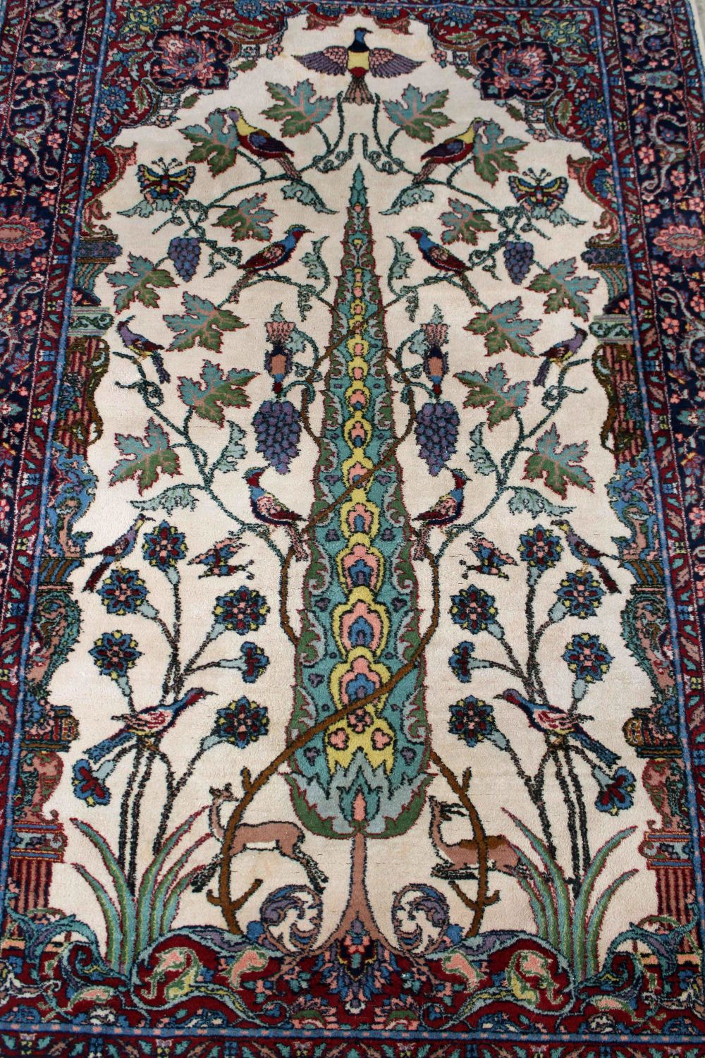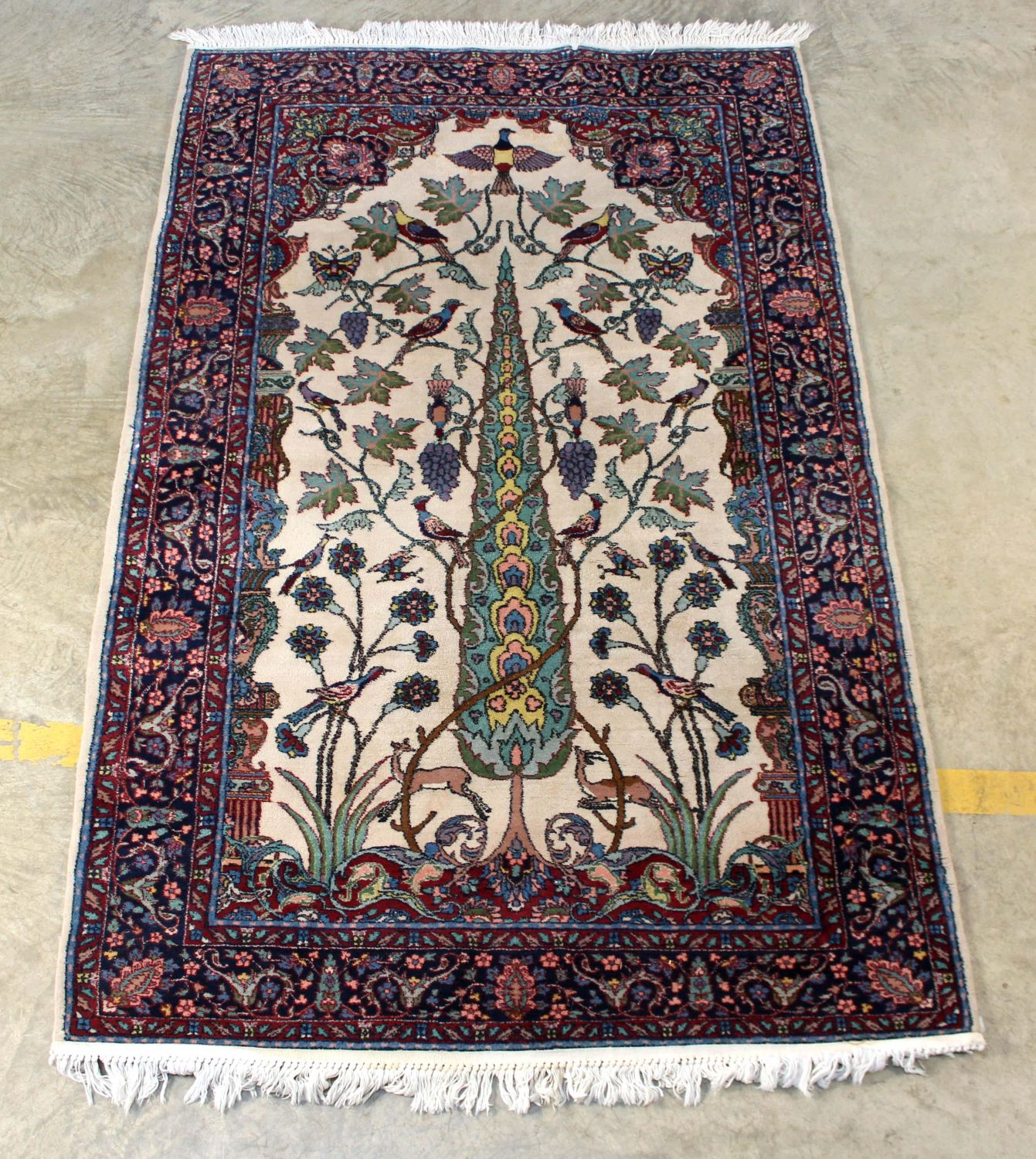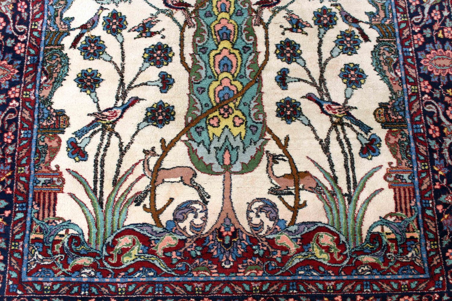 Persian Tree of Life Wool Rug. Cream center area with Tree of Life, birds, flowers and deer. The center portion of the rug is surrounded with multicolor decoration in blues, burgundy and pink. The rug measures 54.5" X 84.5" Condition – This rug is in good condition.