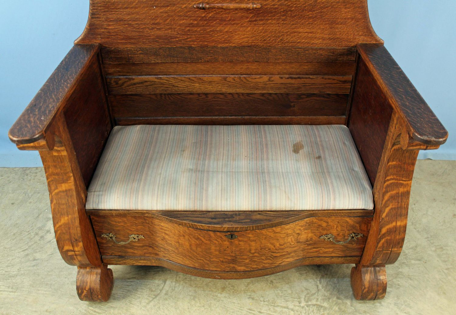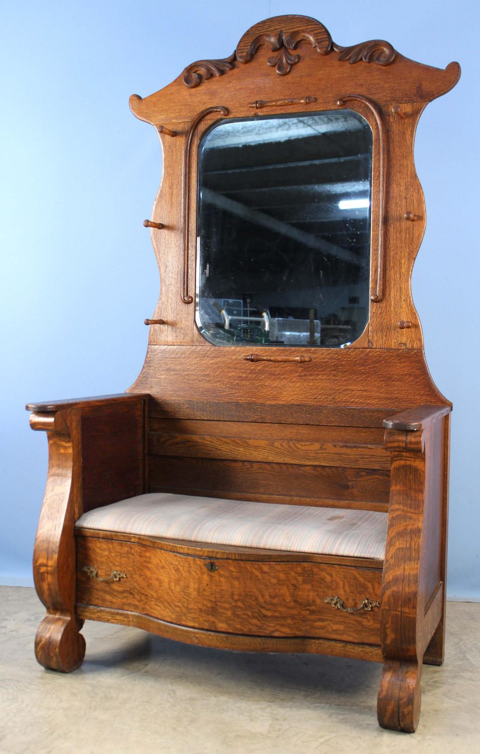 Custom Built Oak Halltree with Mirror. Halltree was built from a circa 1910 oak dresser. Measures 78 1/4" high x 44 1/8" wide x 23 3/4" deep. Condition- Overall good condition. See photos.