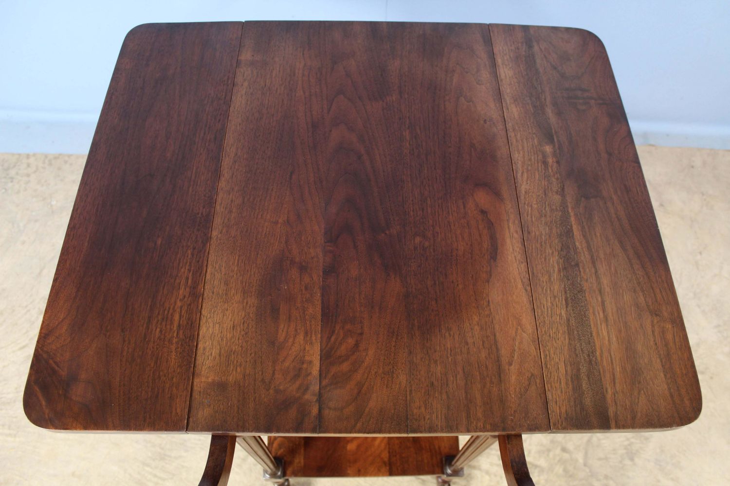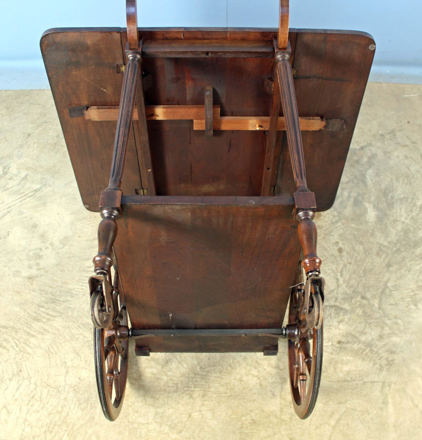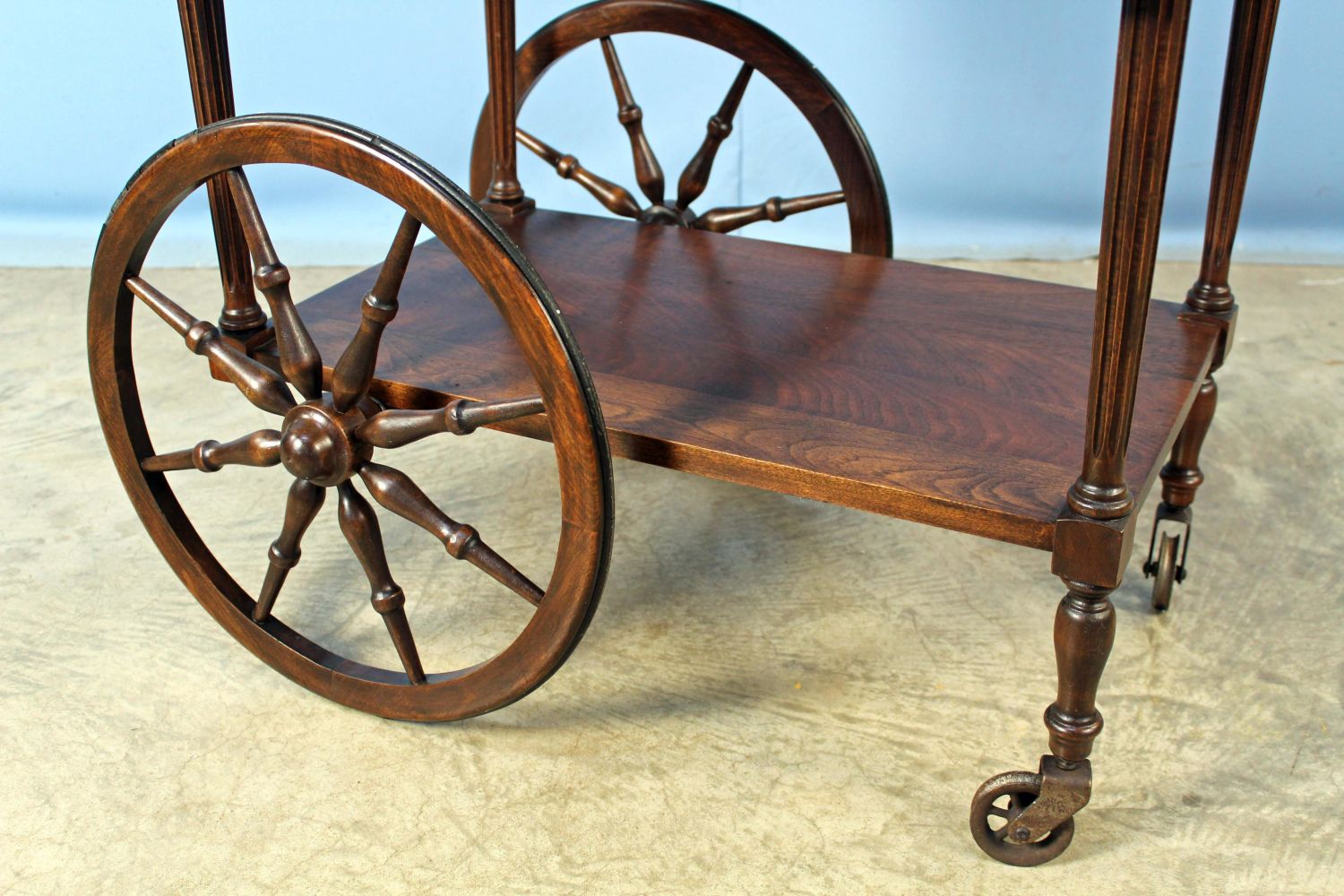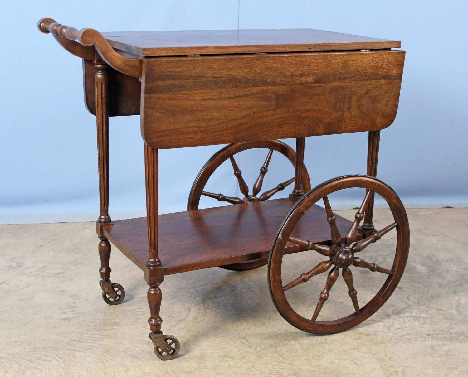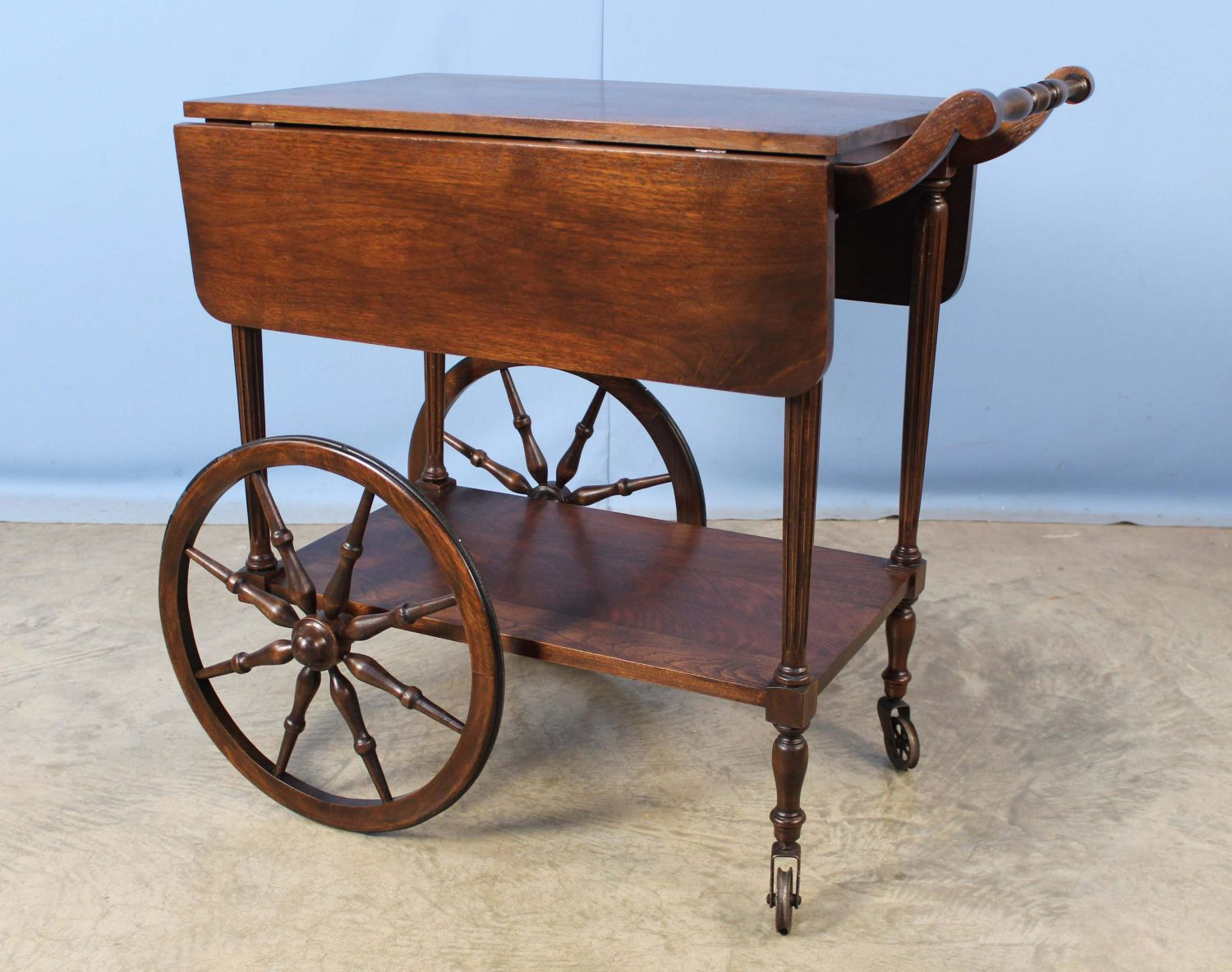 Walnut Teacart with Handle. This cart does not come with a tray. Measures 29" high x 30" long x 30" wide. Condition- Teacart is in overall good condition. Teacart does have a small crack in top, scratches, etc. See photos.